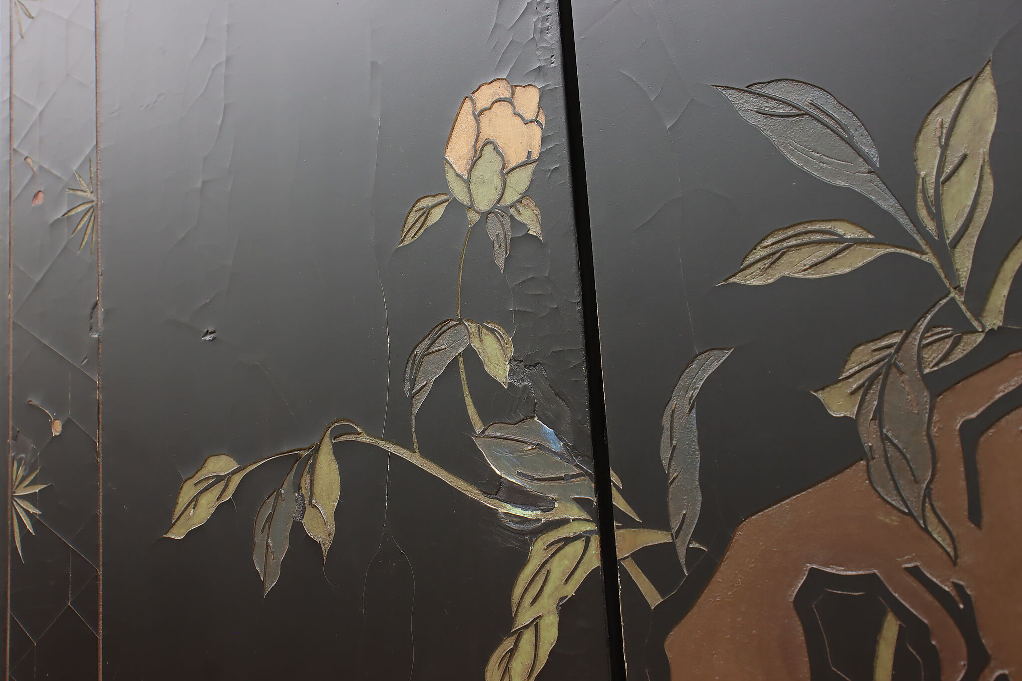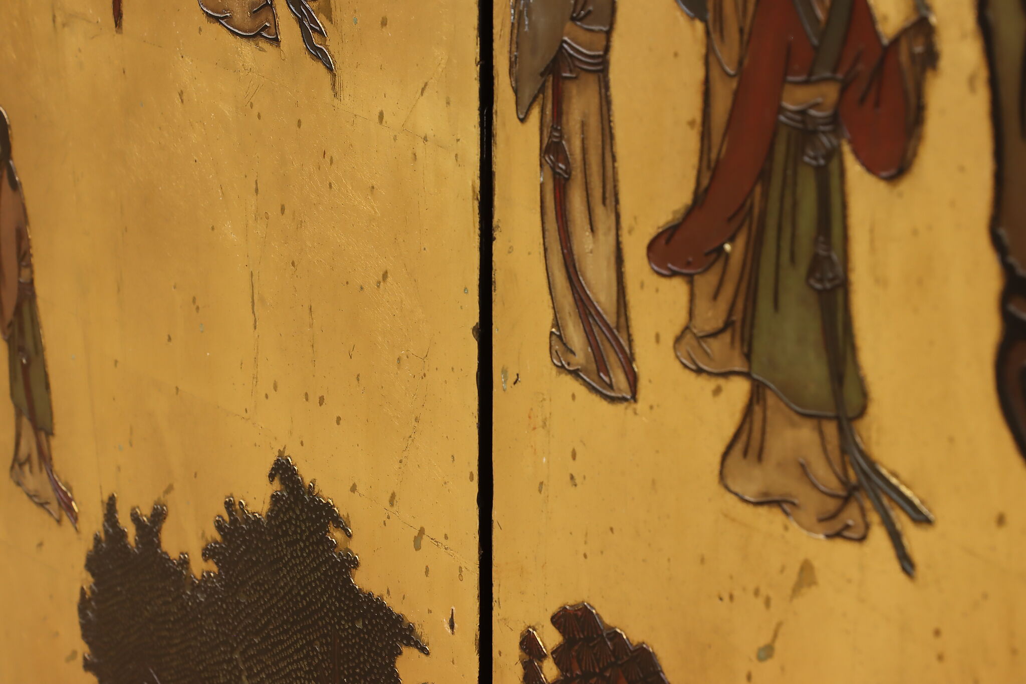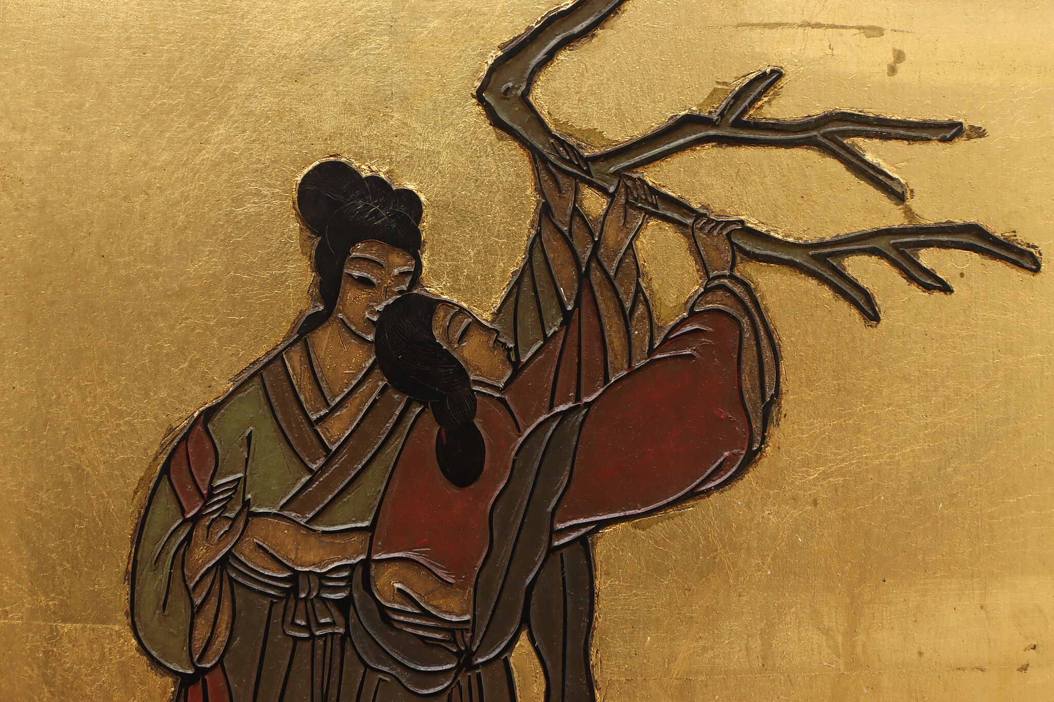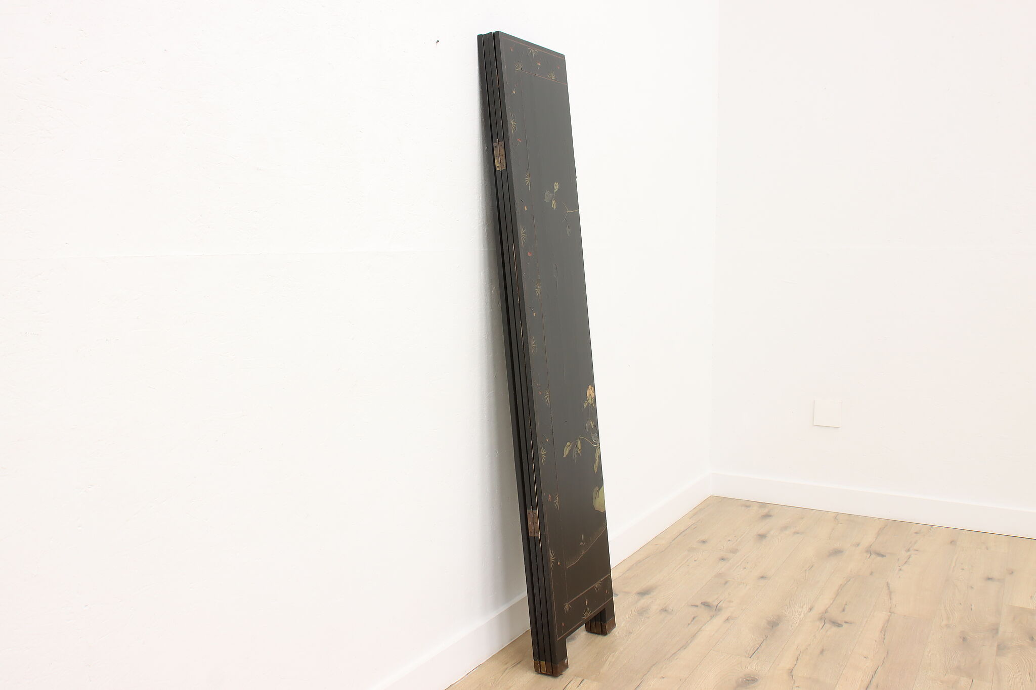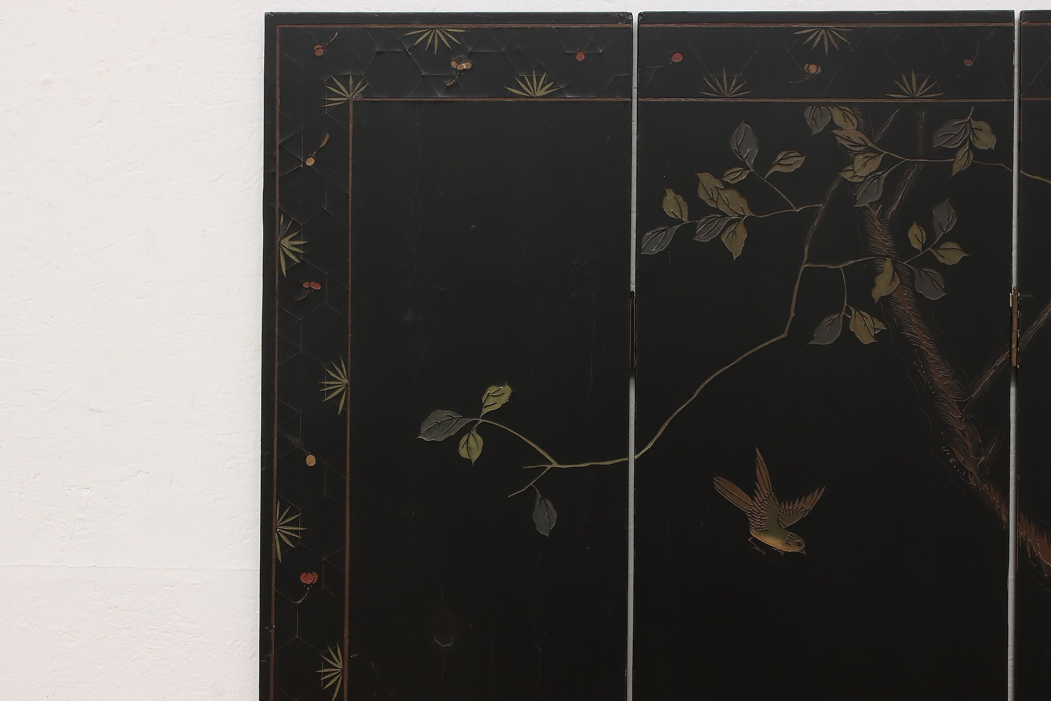 This traditional room divider folding screen has beautifully hand carved scenes of a temple courtyard with royal women and garden scenes on the reverse.