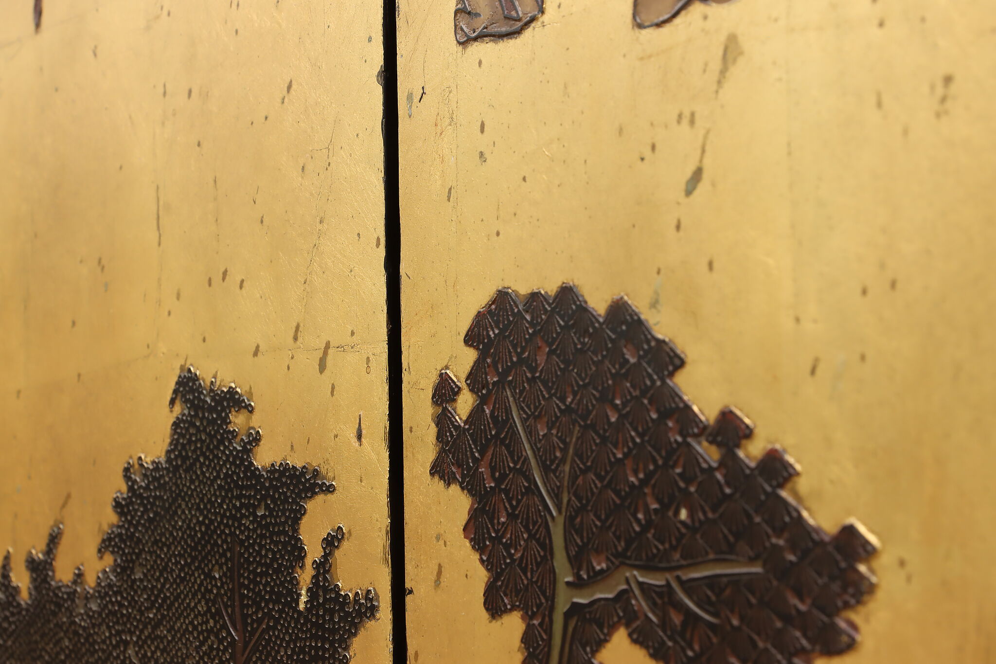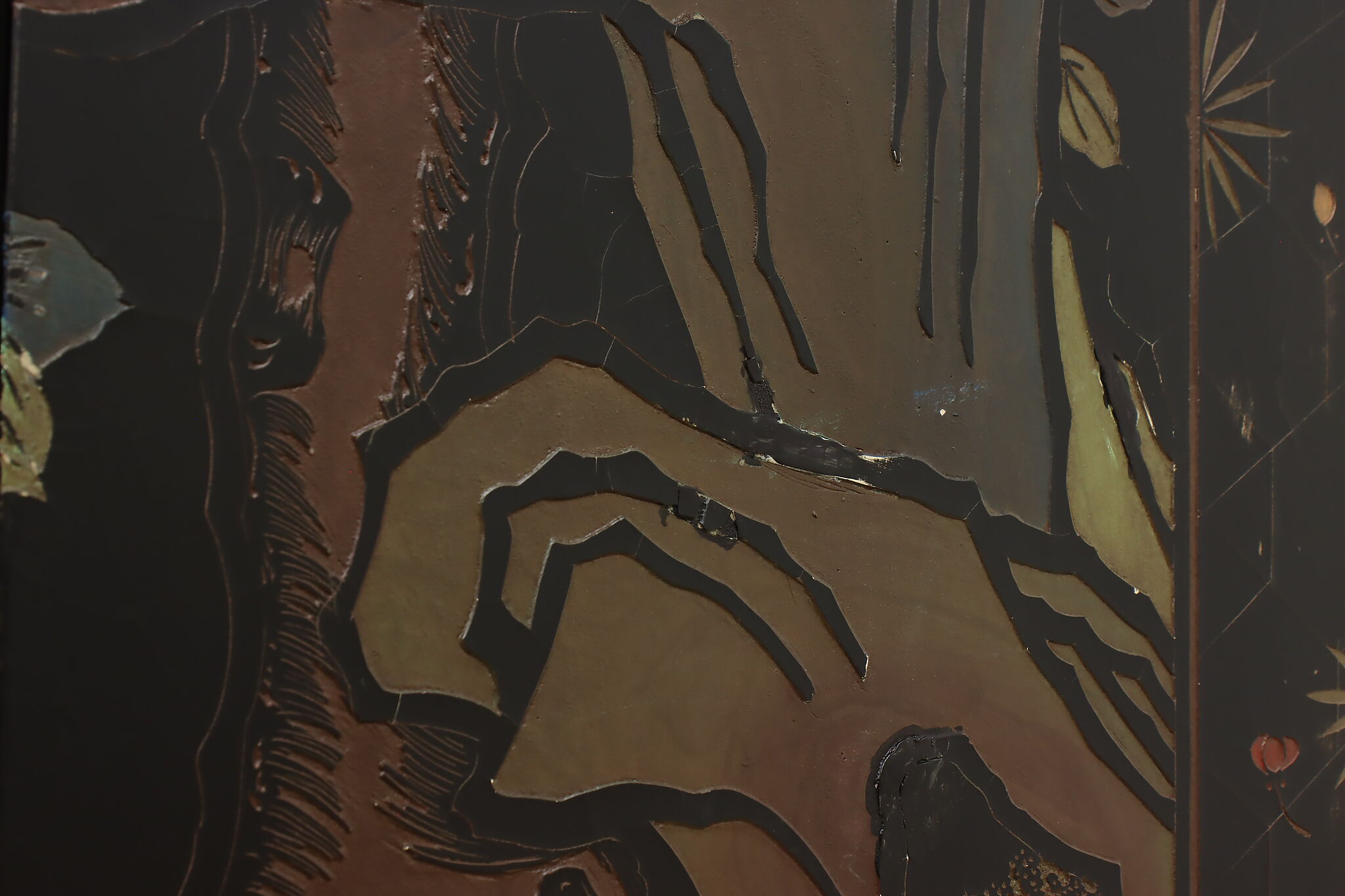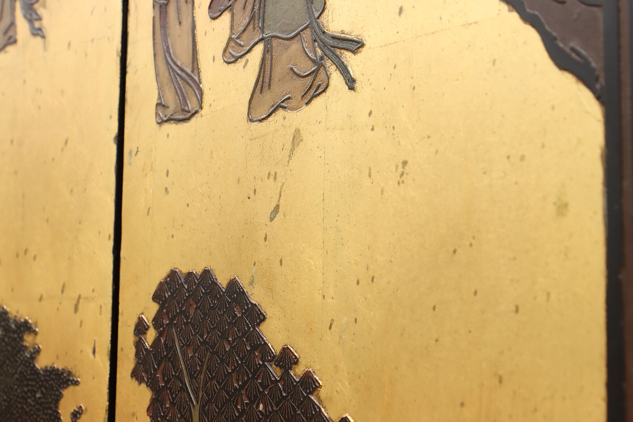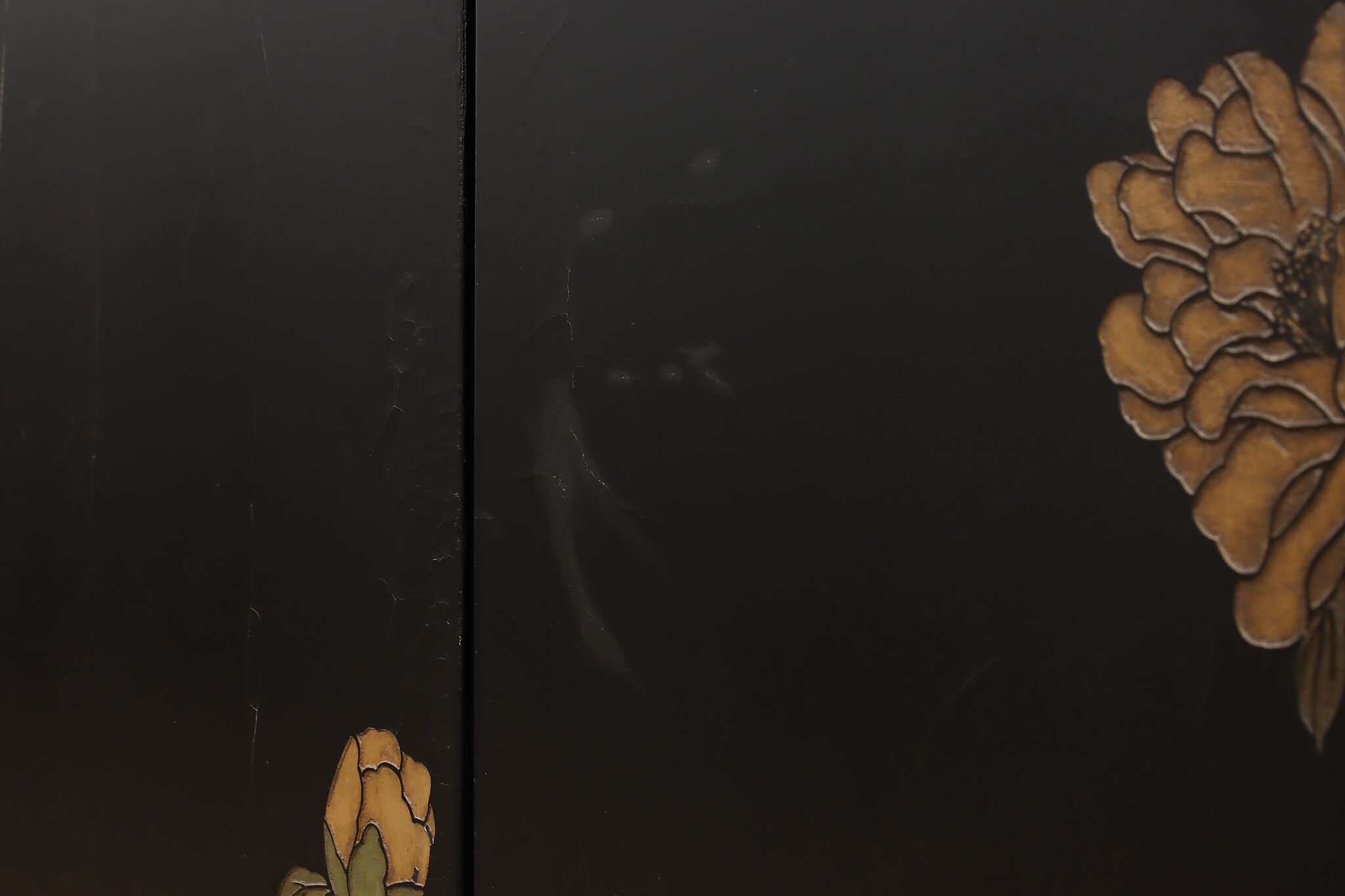 This traditional room divider folding screen has beautifully hand carved scenes of a temple courtyard with royal women and garden scenes on the reverse.