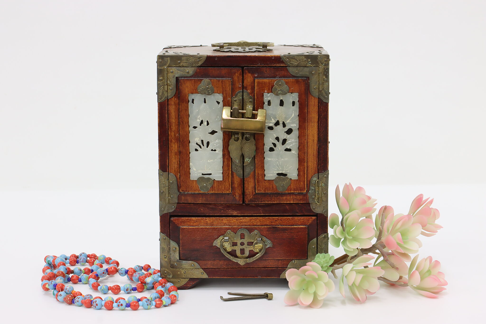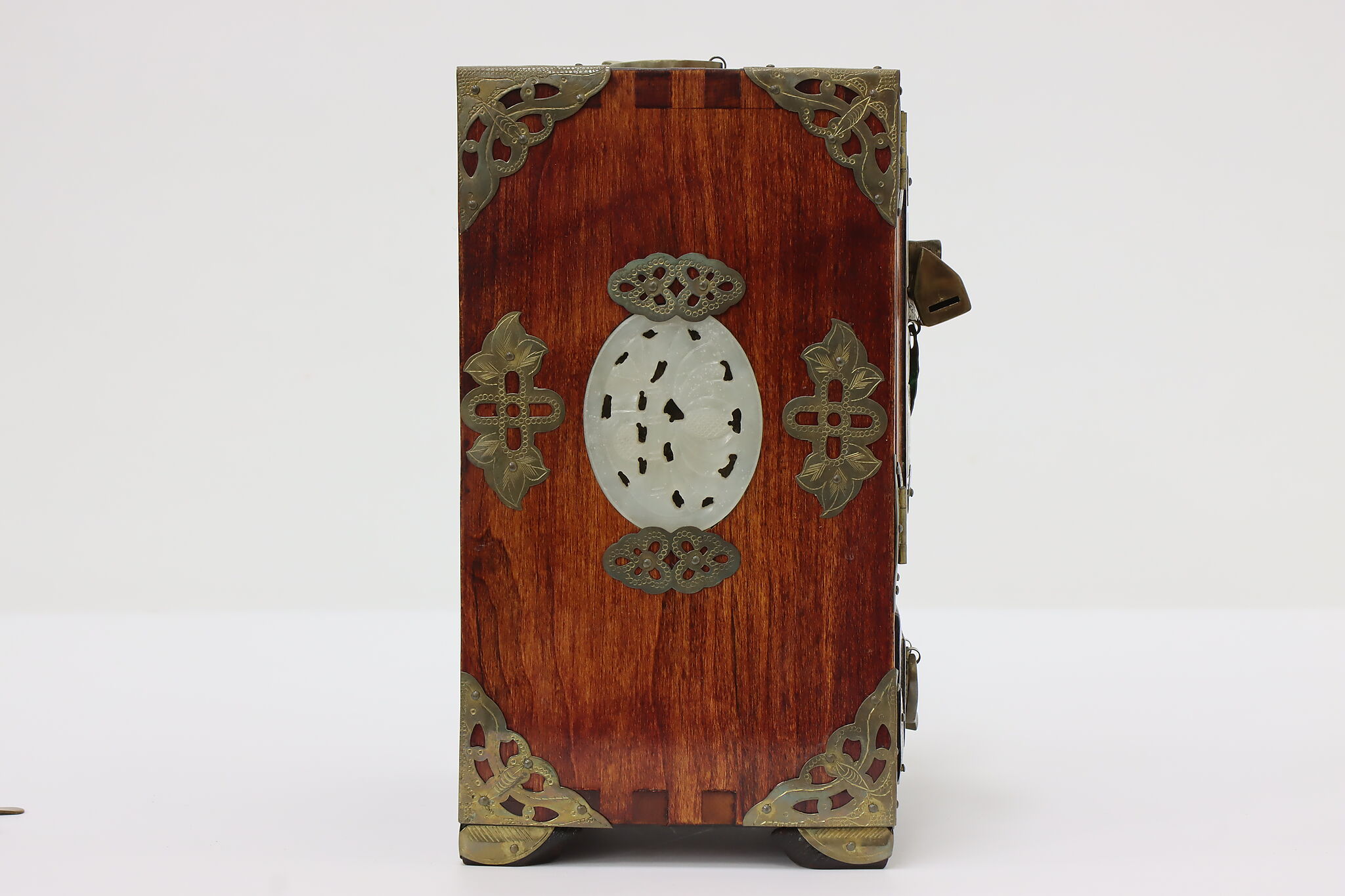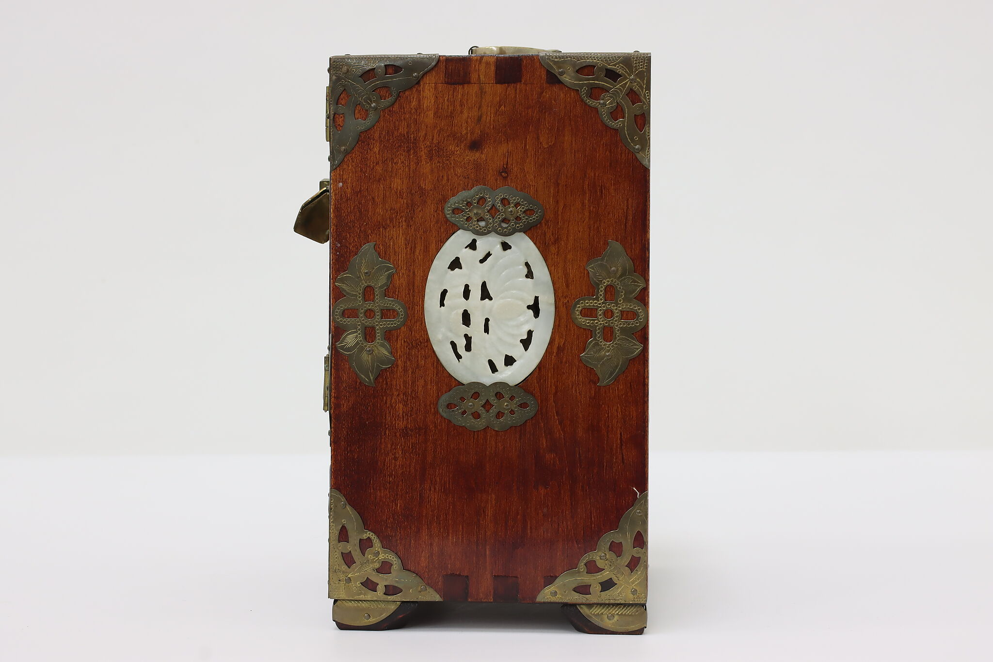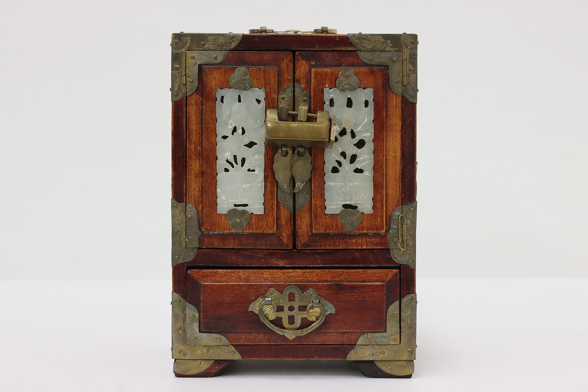 This fantastic dresser top jewelry chest has beautifully engraved brass mounts and carved natural material inserts.