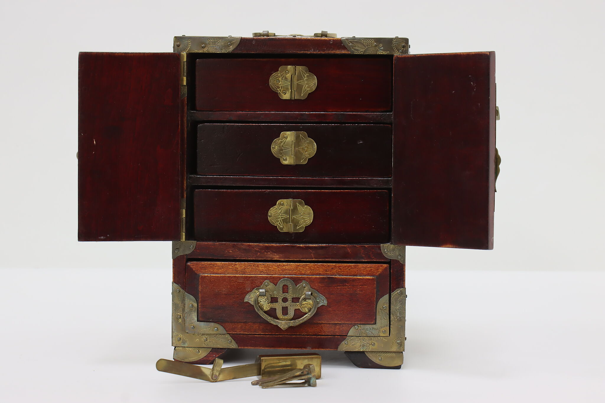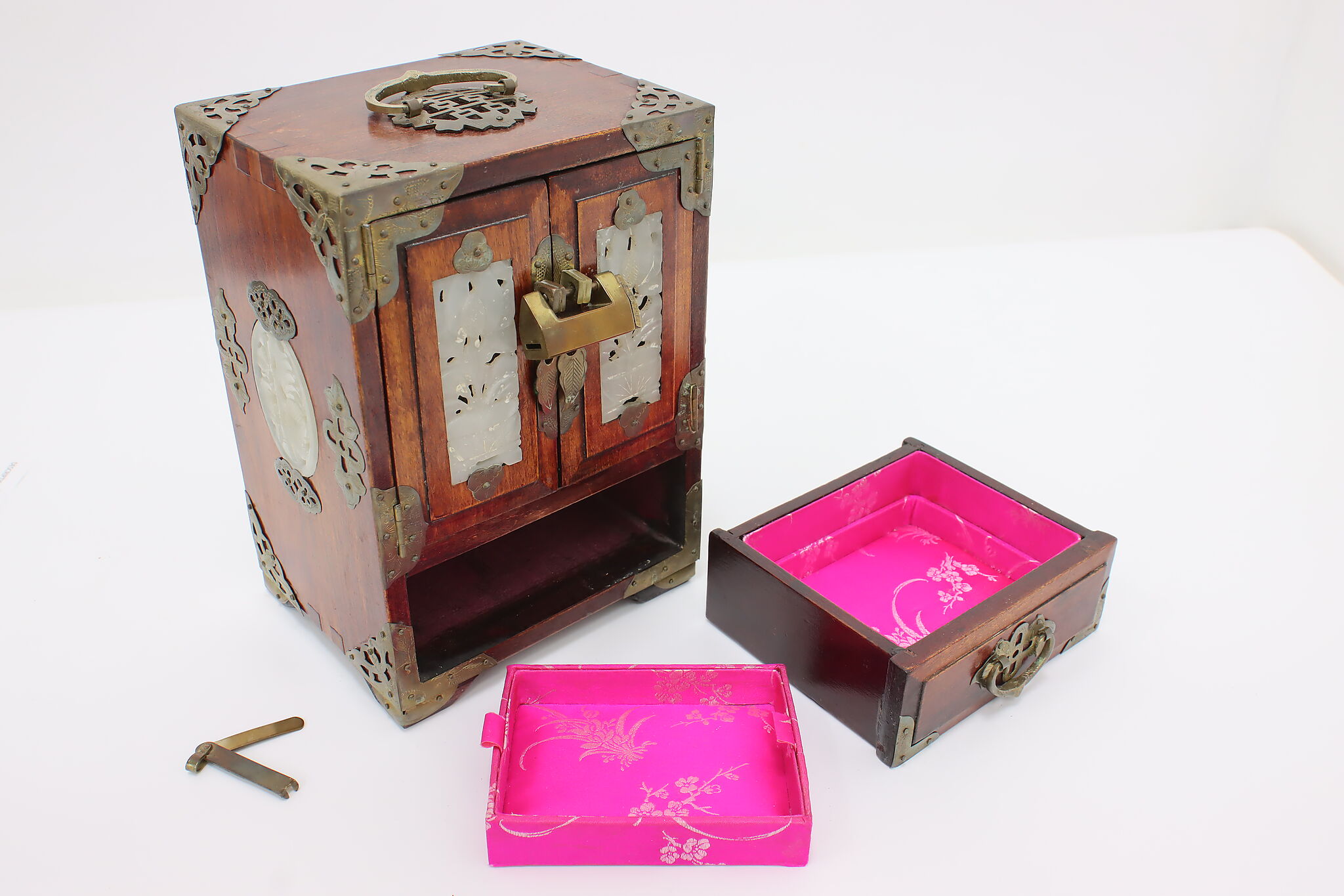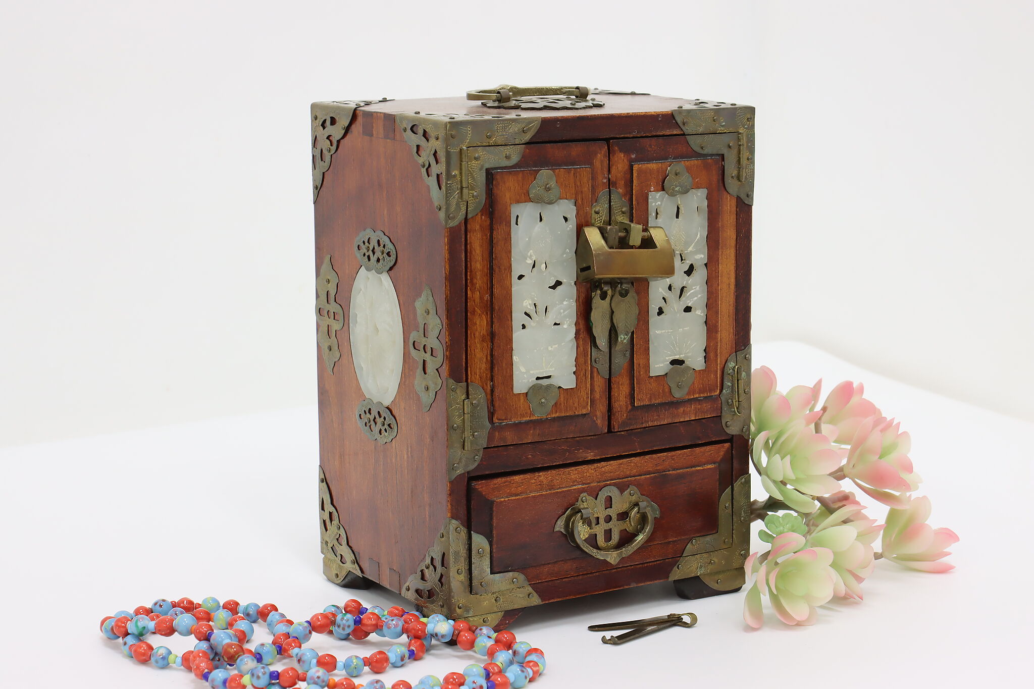 This fantastic dresser top jewelry chest has beautifully engraved brass mounts and carved natural material inserts.