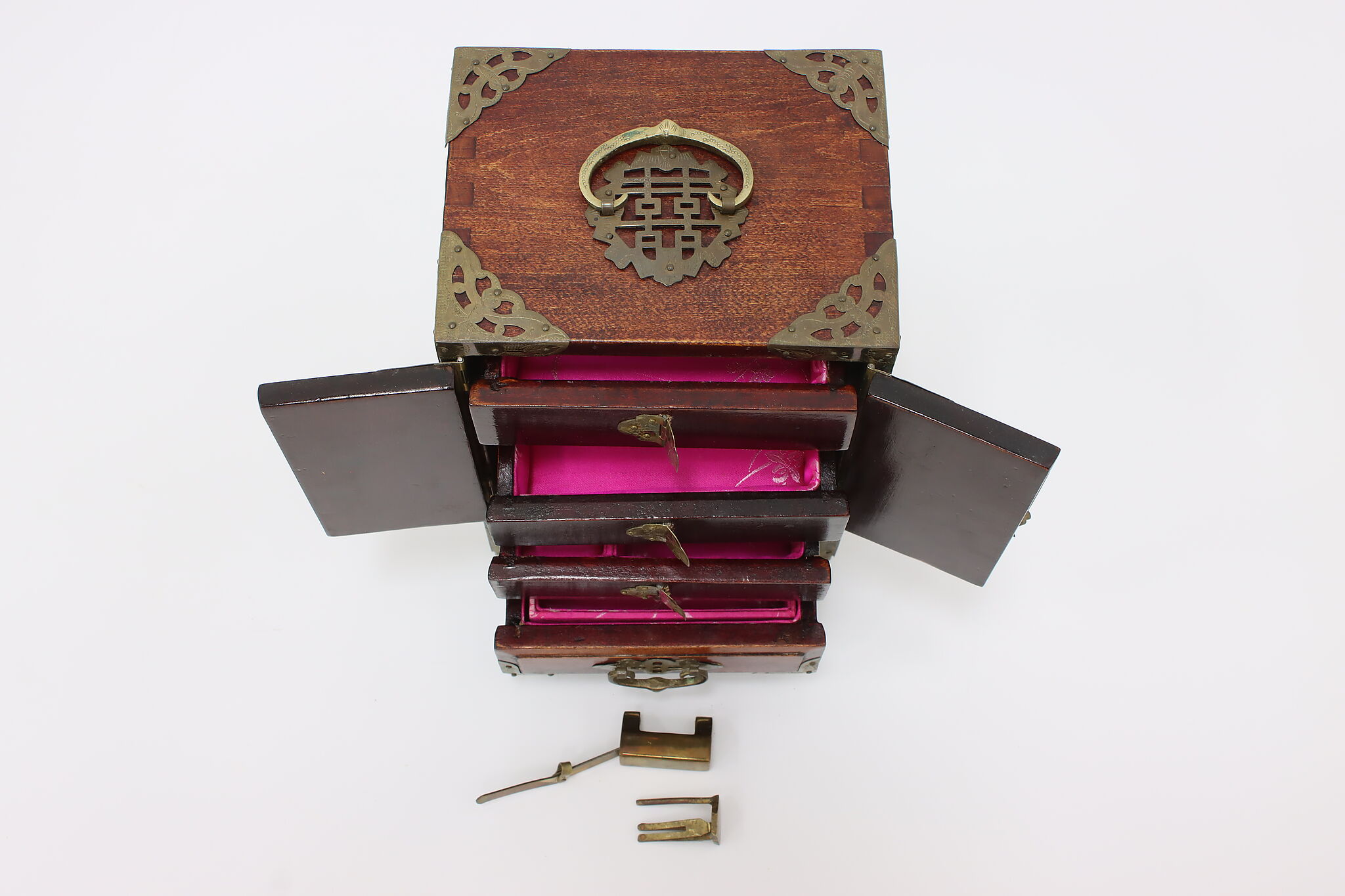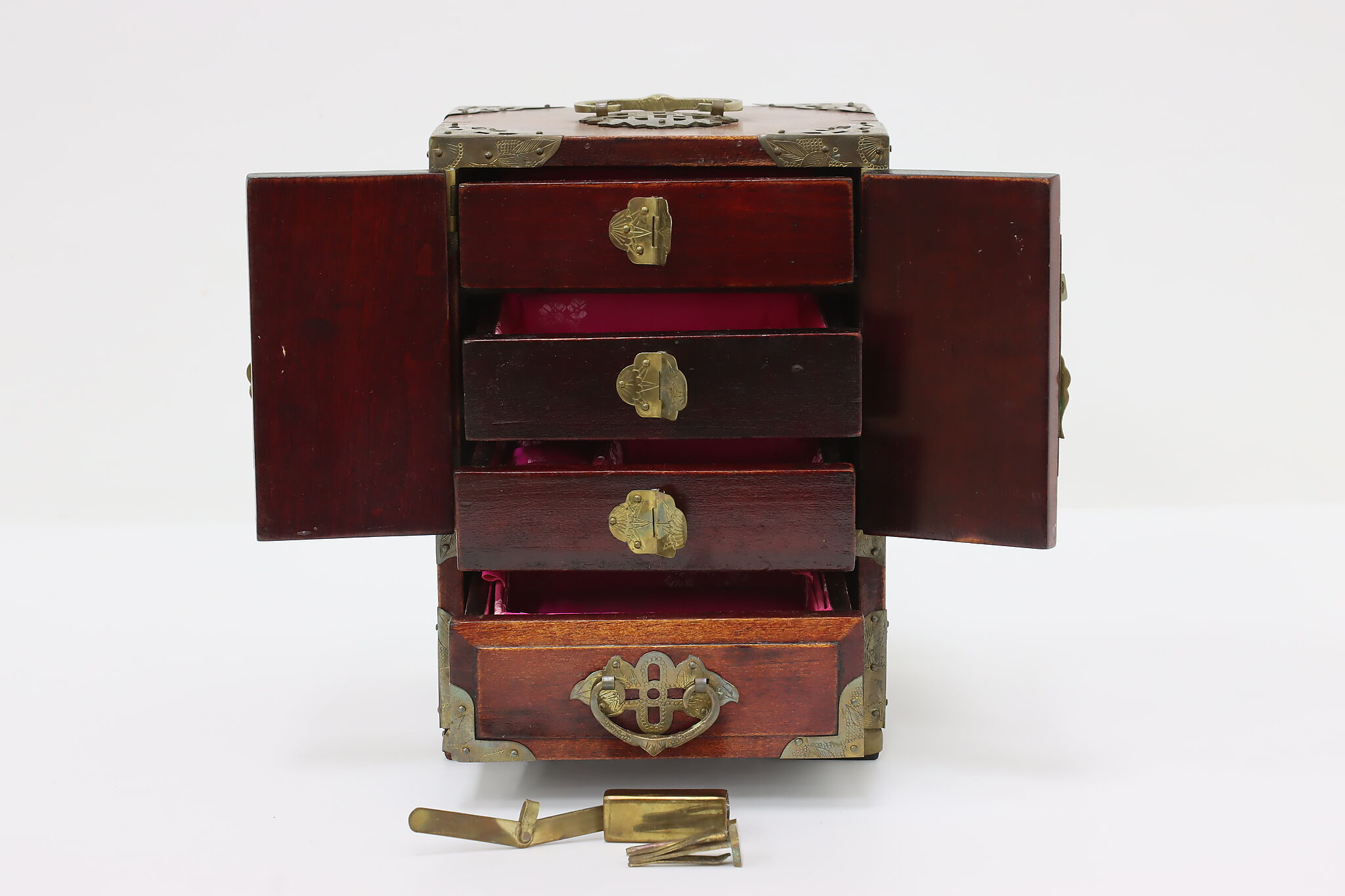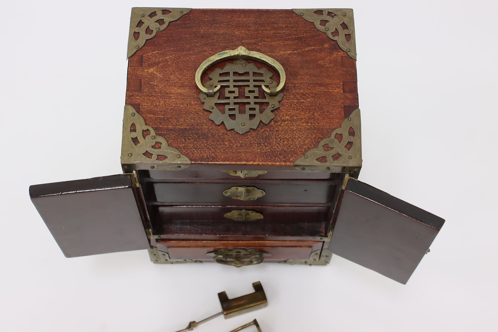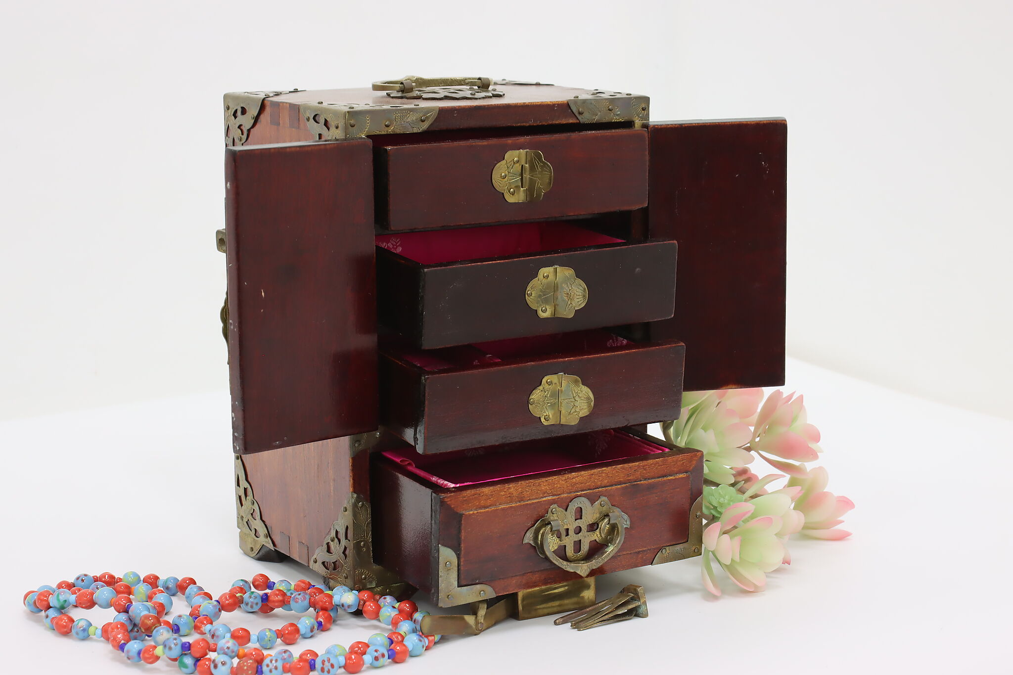 This fantastic dresser top jewelry chest has beautifully engraved brass mounts and carved natural material inserts.
