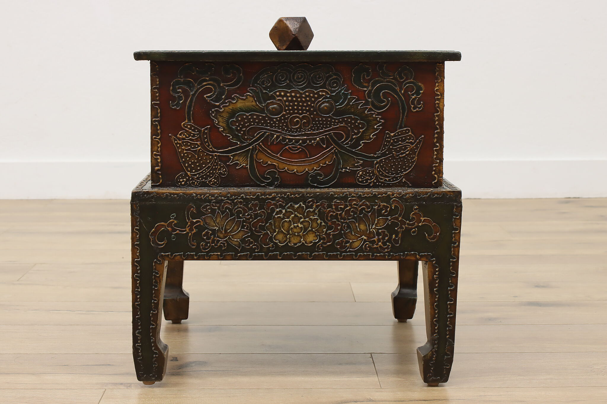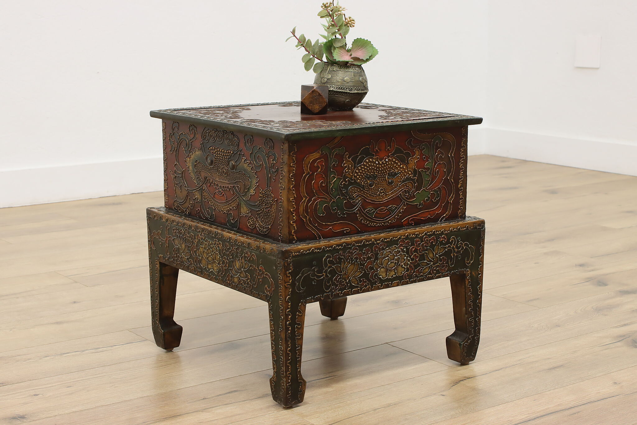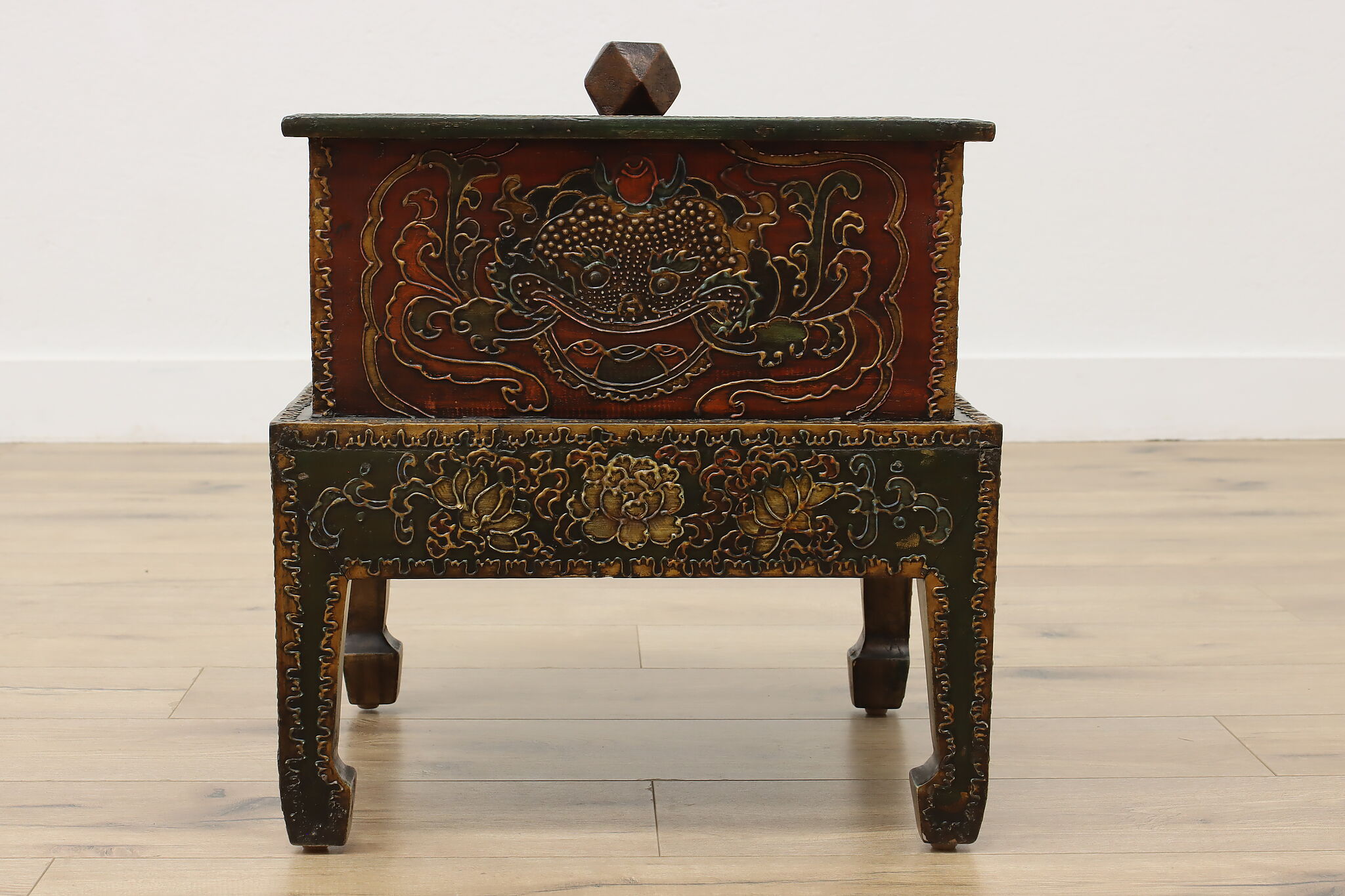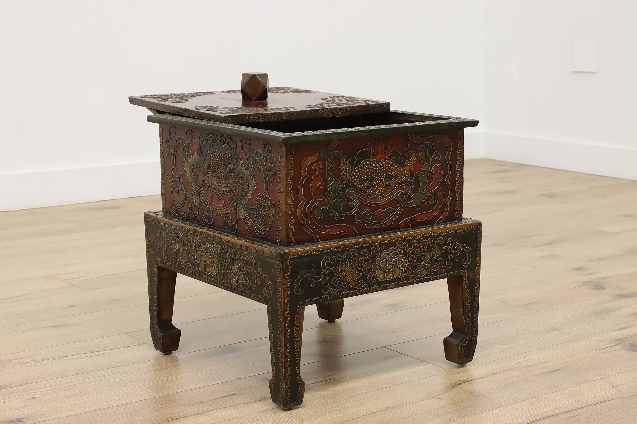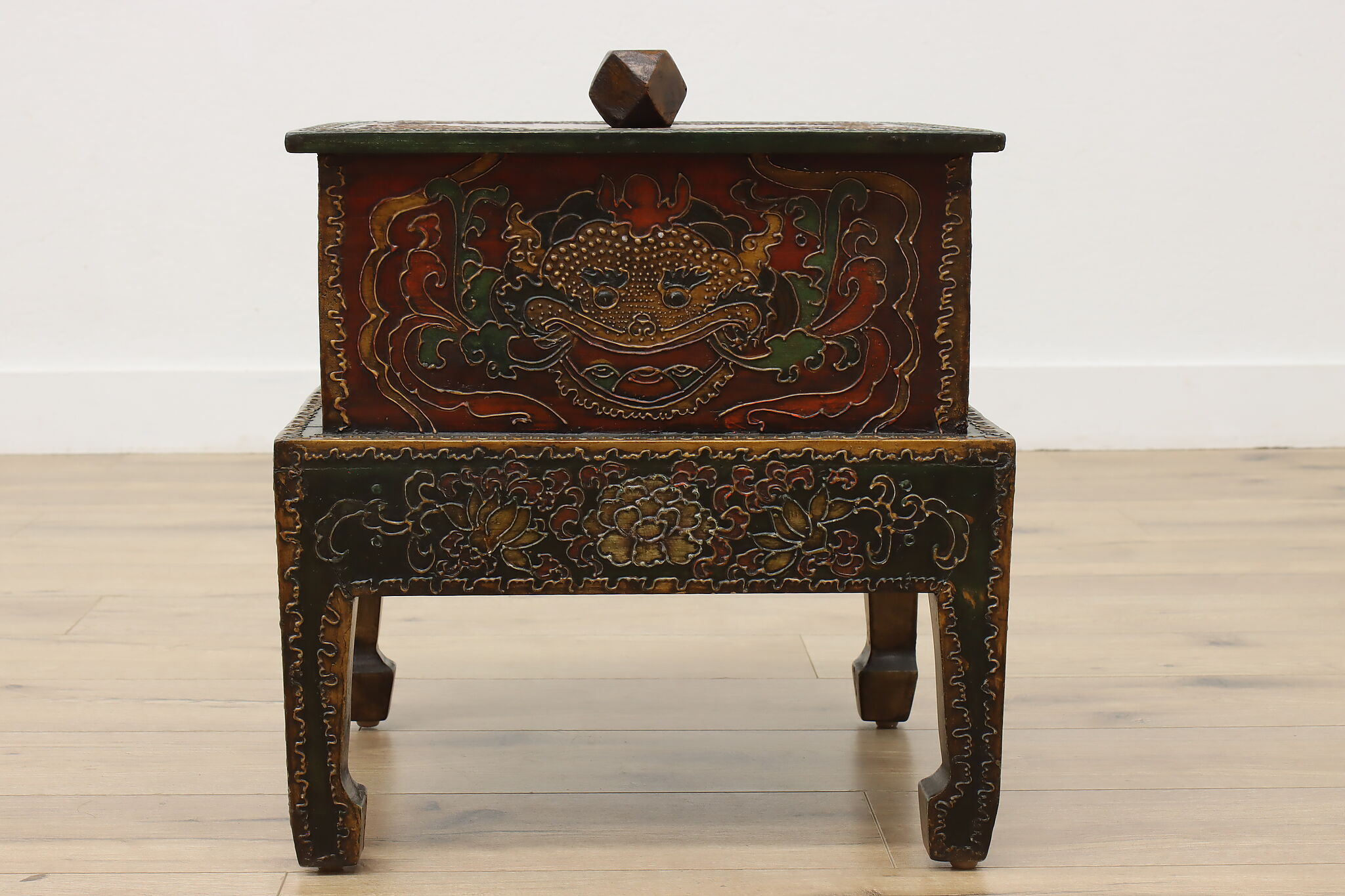 Store TV remotes, magazines, and other knickknacks in this unique storage box and its painted dragon motifs.