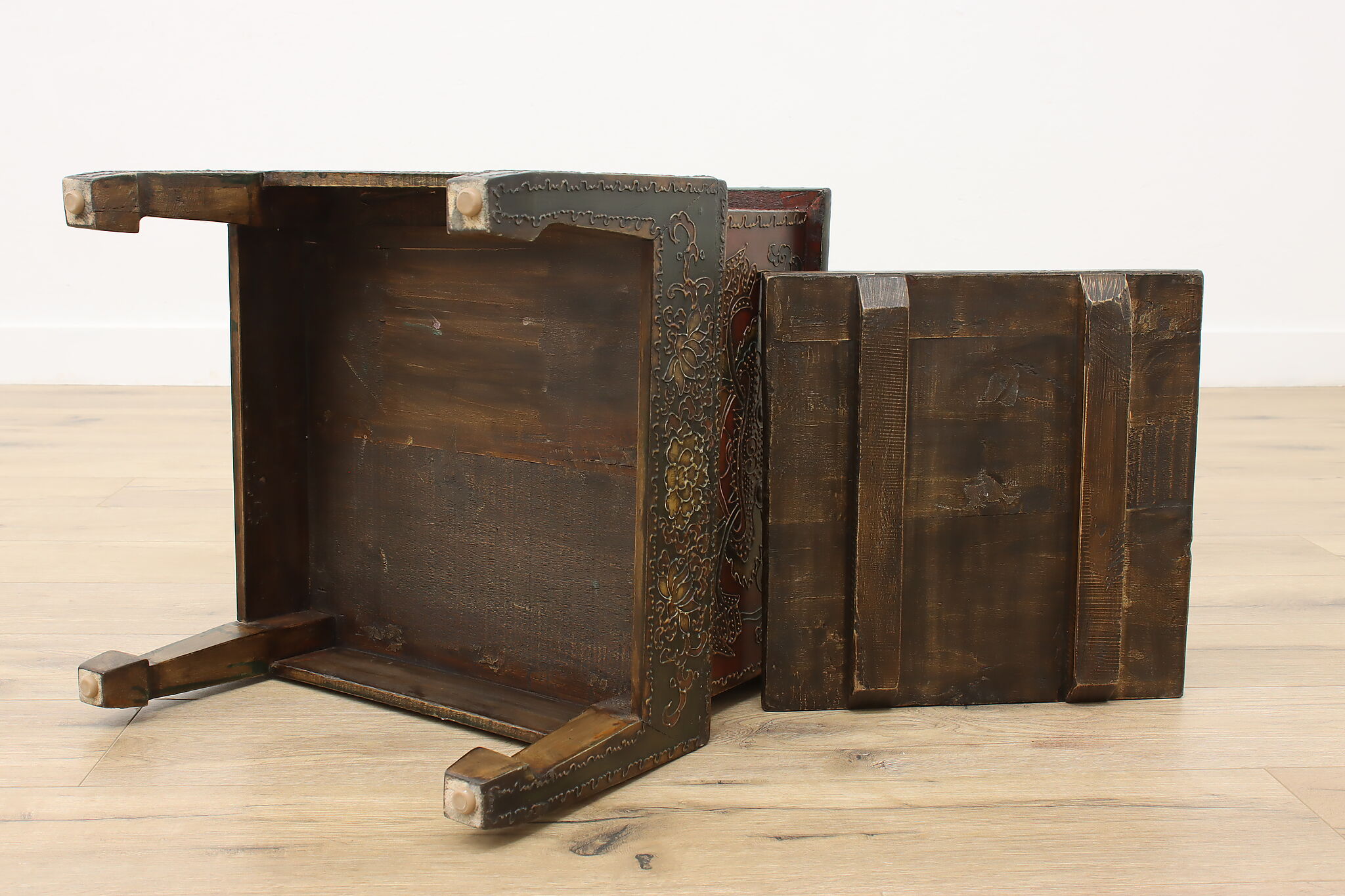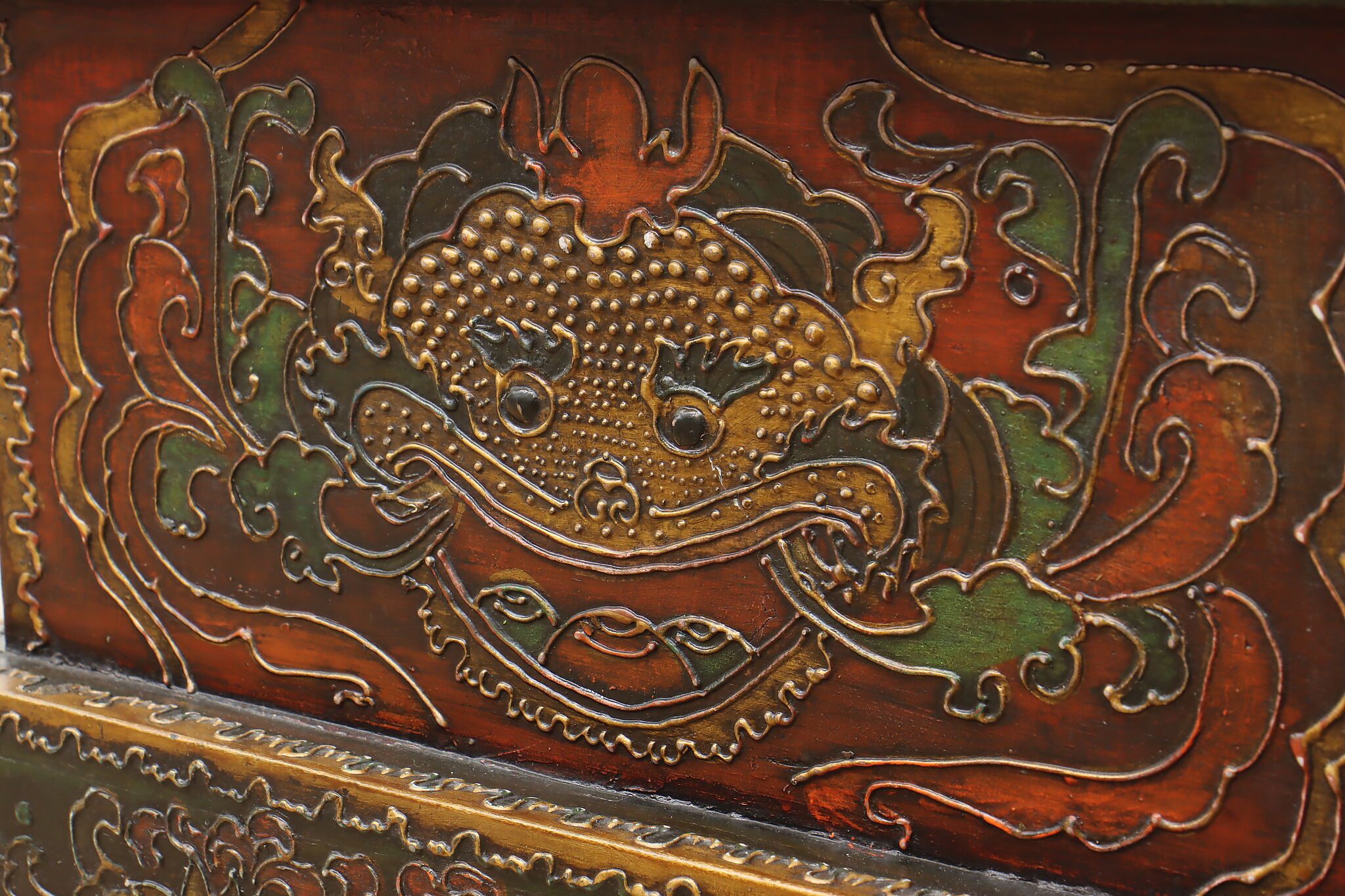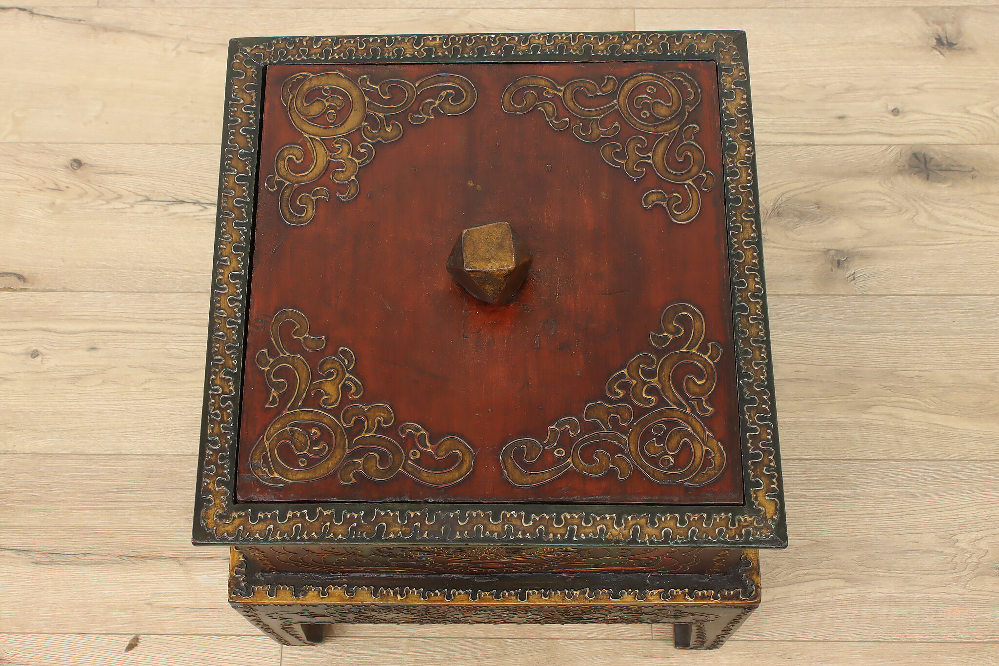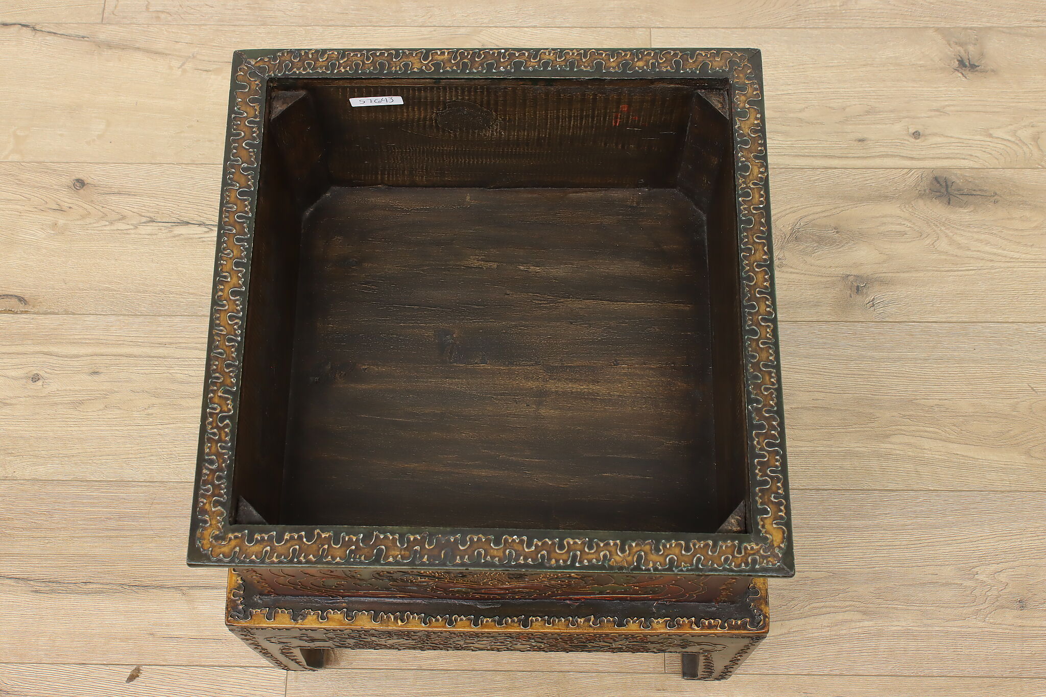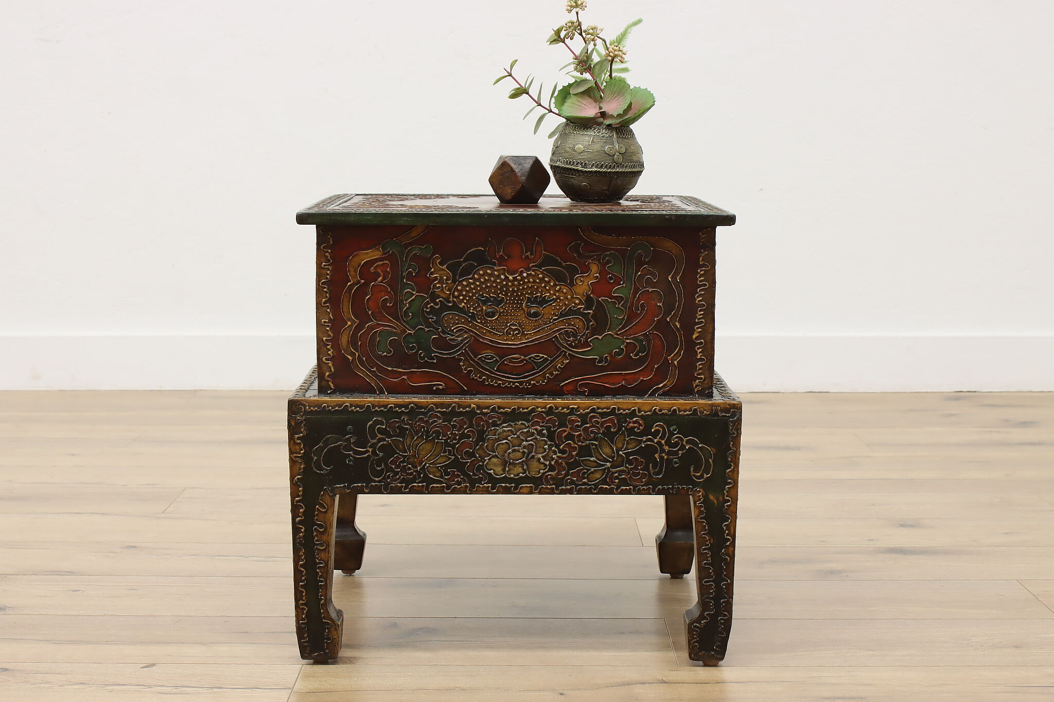 Store TV remotes, magazines, and other knickknacks in this unique storage box and its painted dragon motifs.
