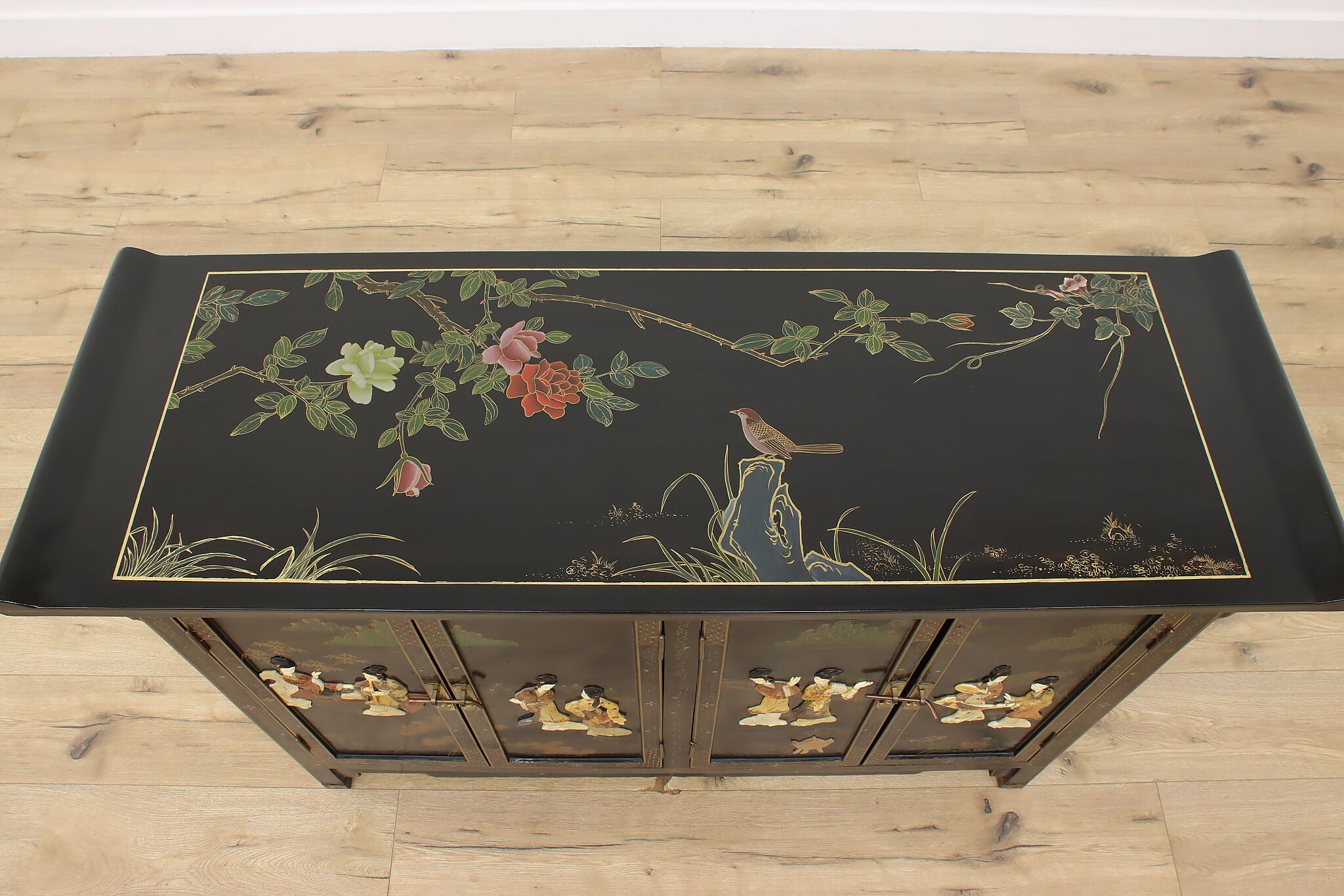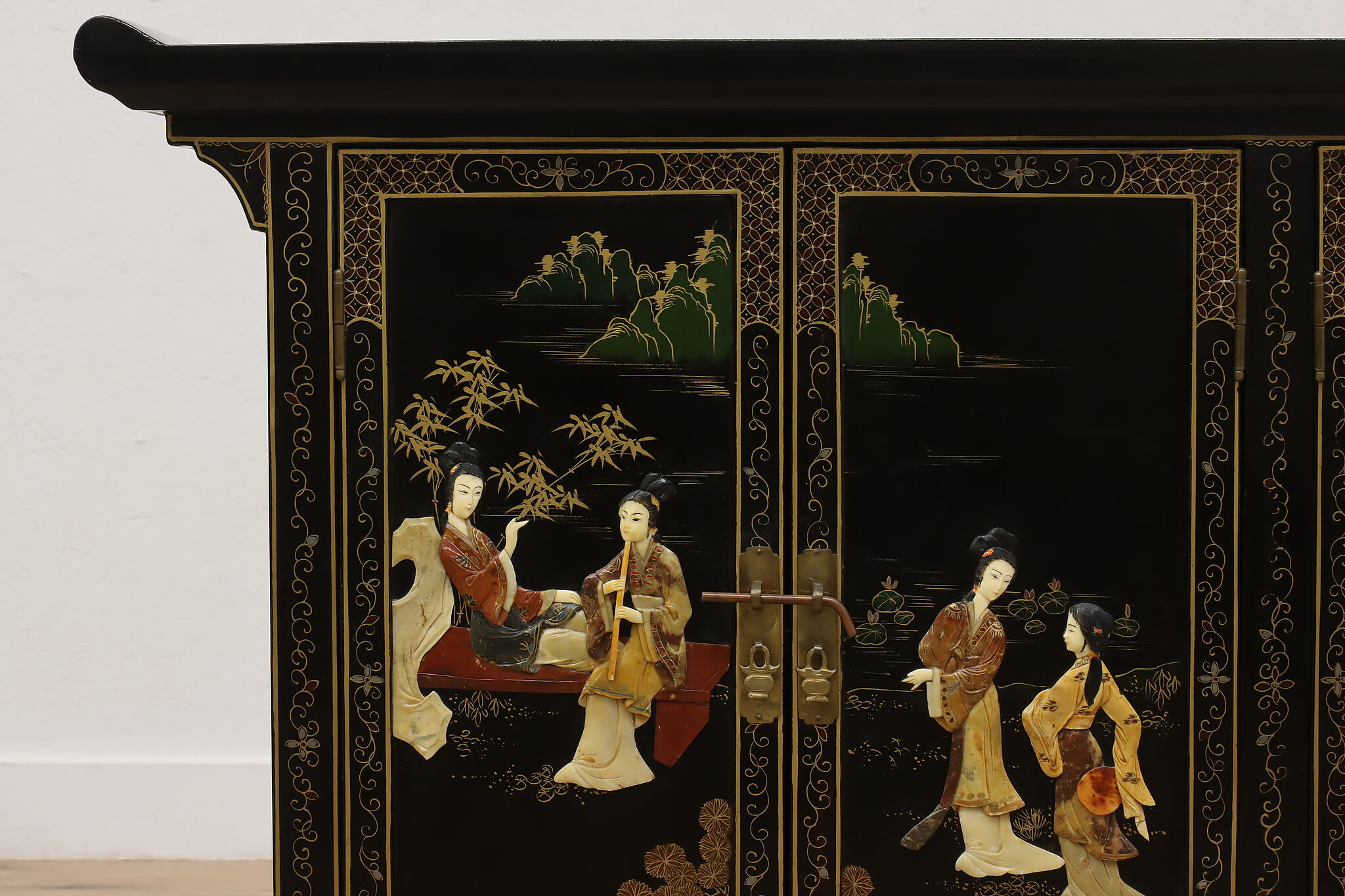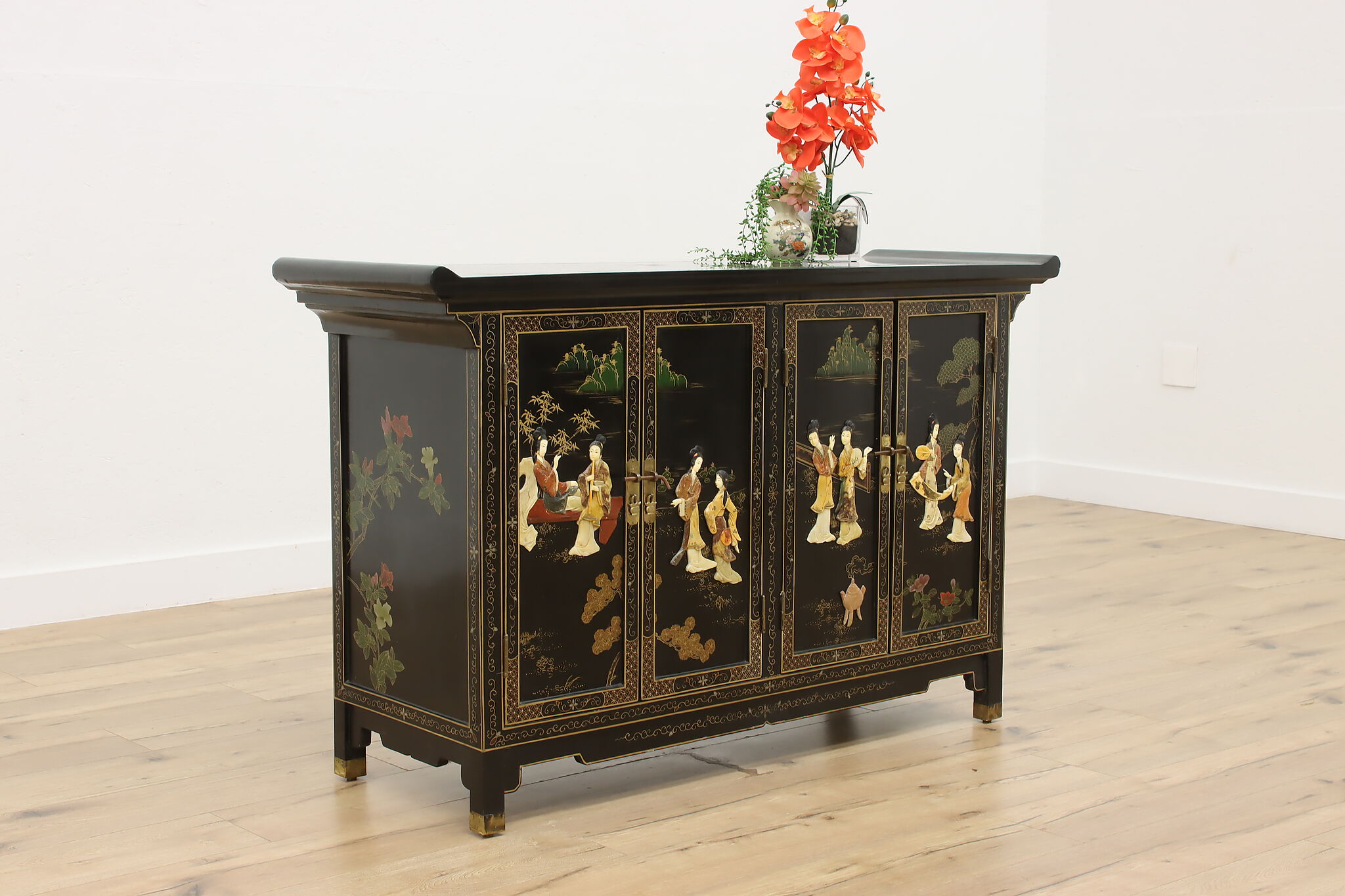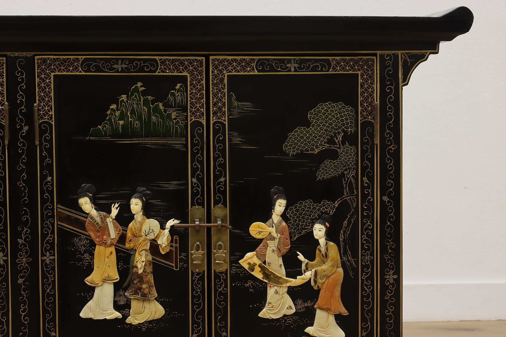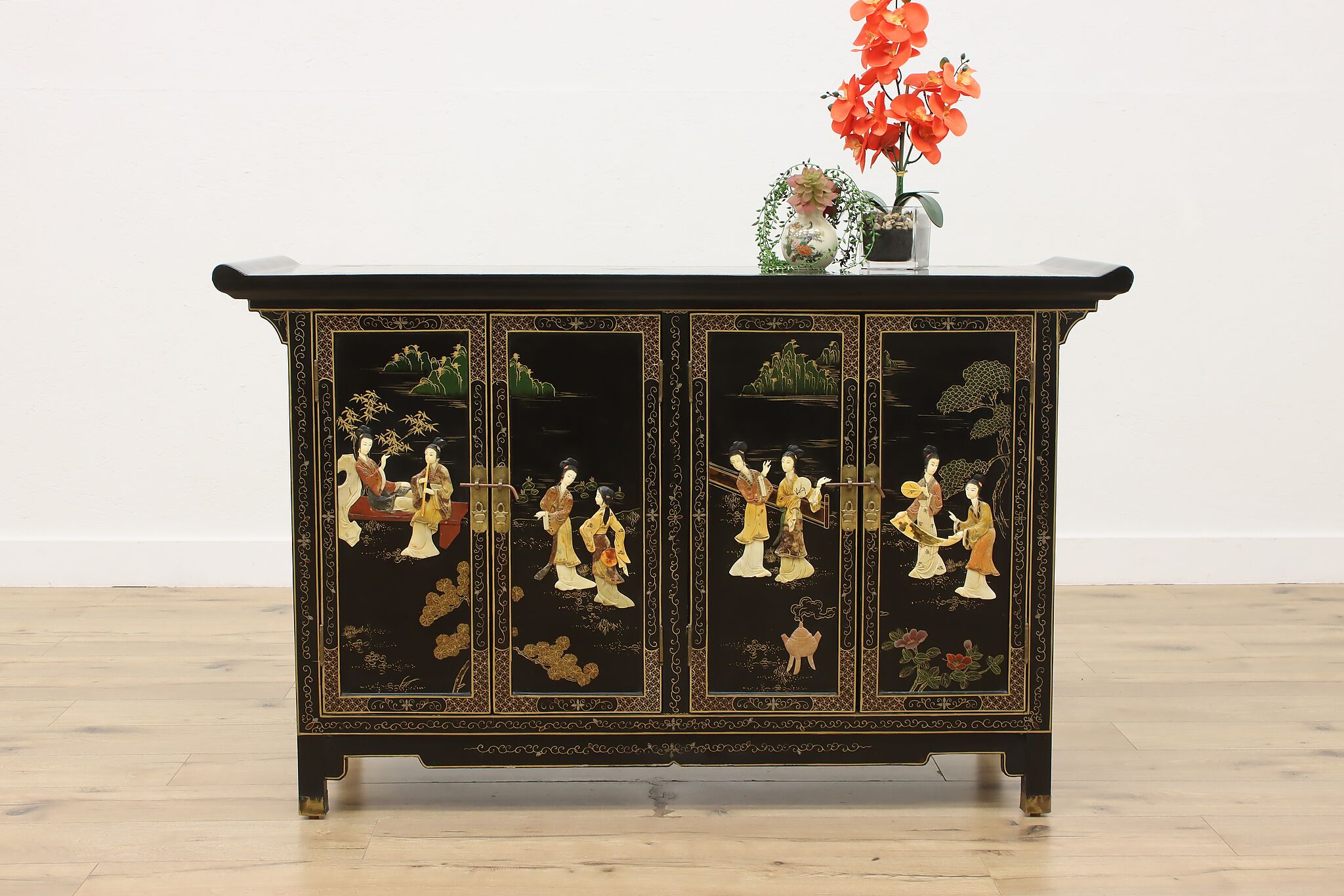 This beautiful sideboard, hall console or TV console has traditional chinoiserie painting with carved jade stone figures of courtesans.
