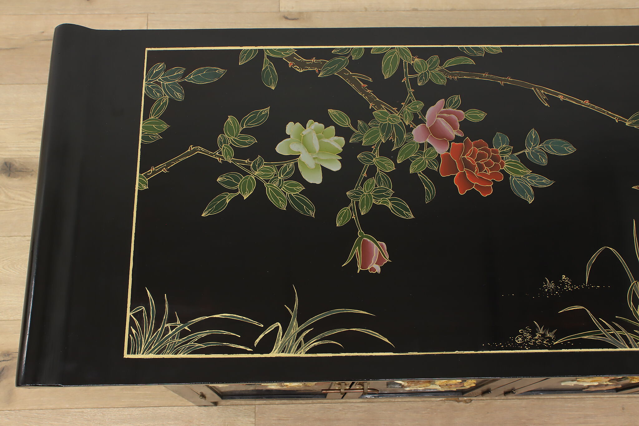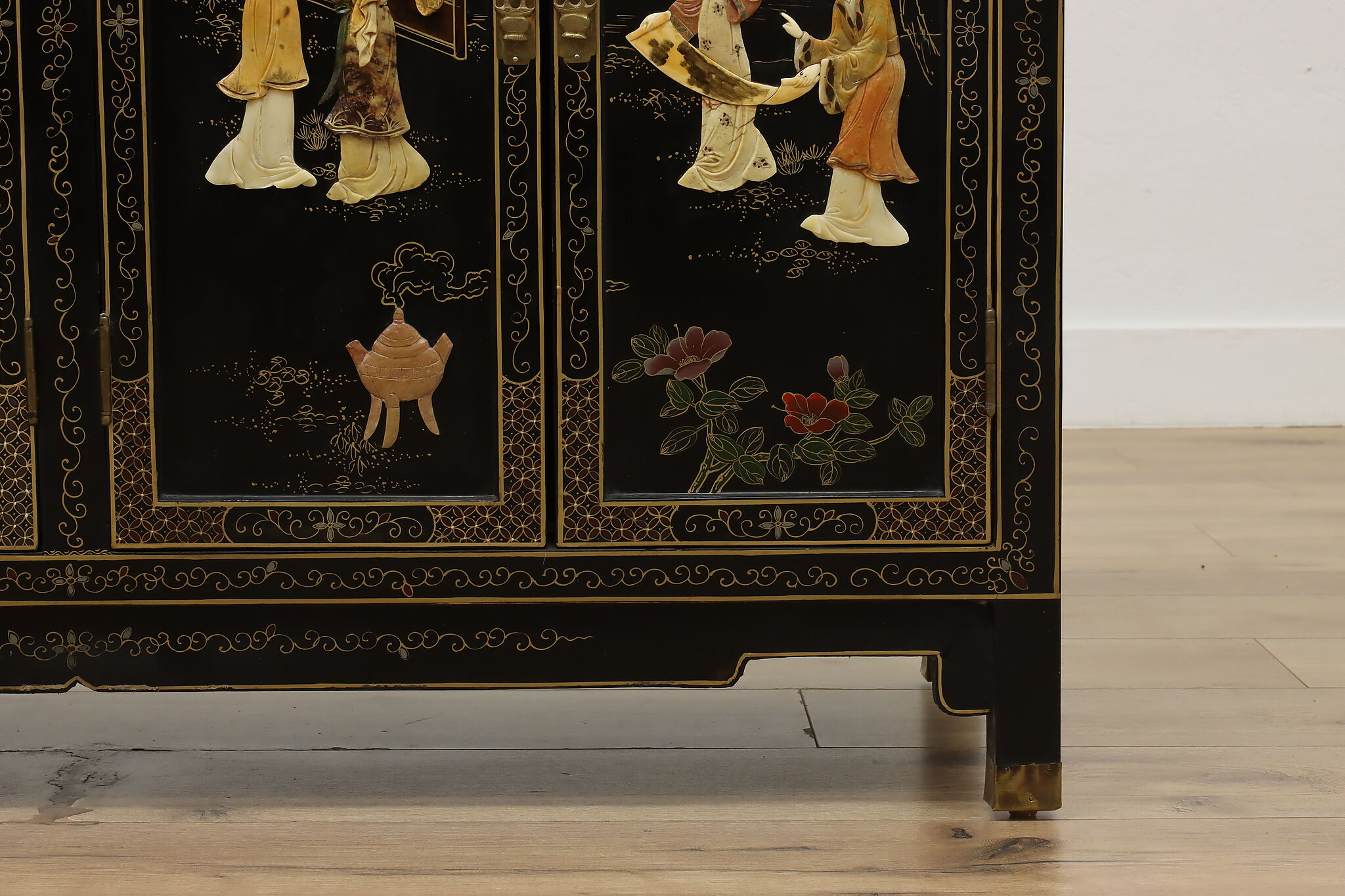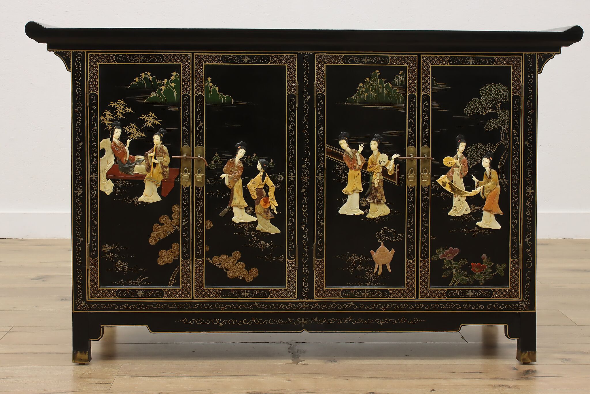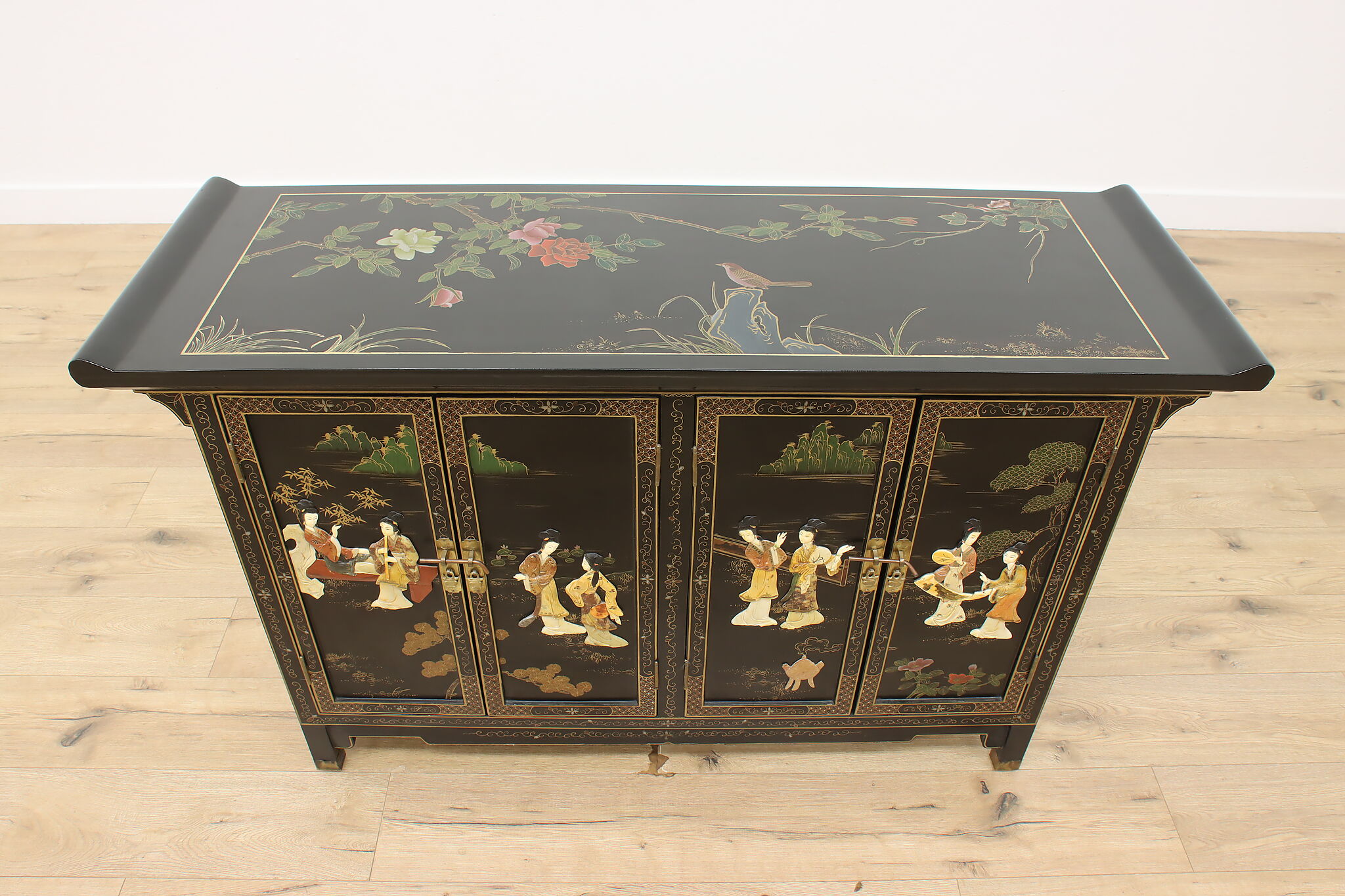 This beautiful sideboard, hall console or TV console has traditional chinoiserie painting with carved jade stone figures of courtesans.