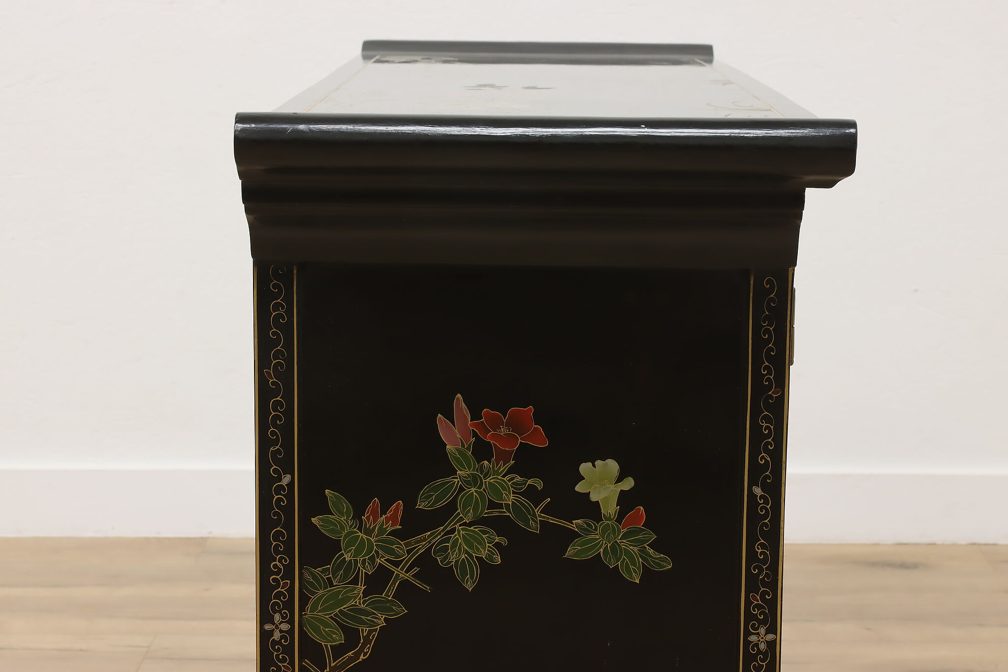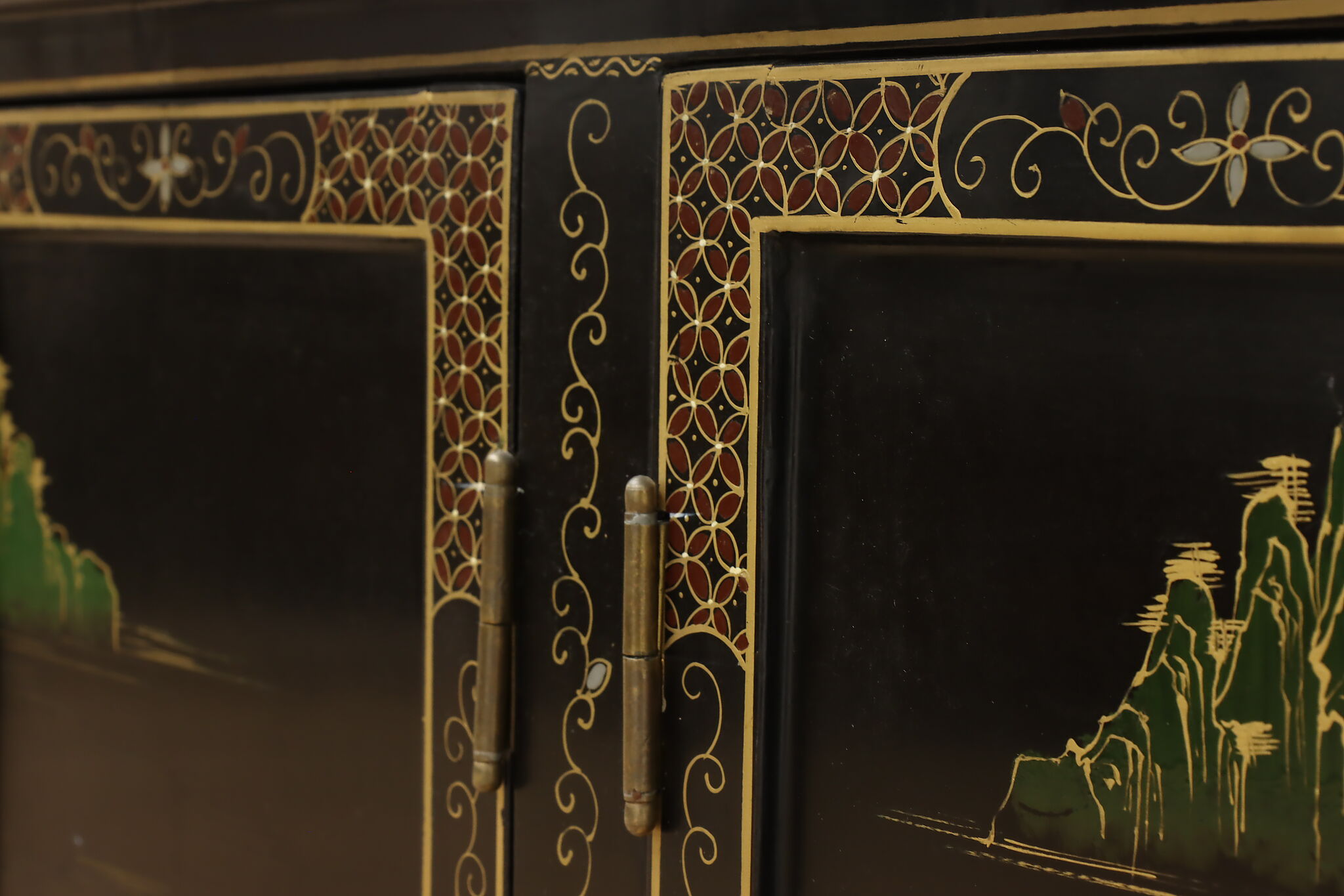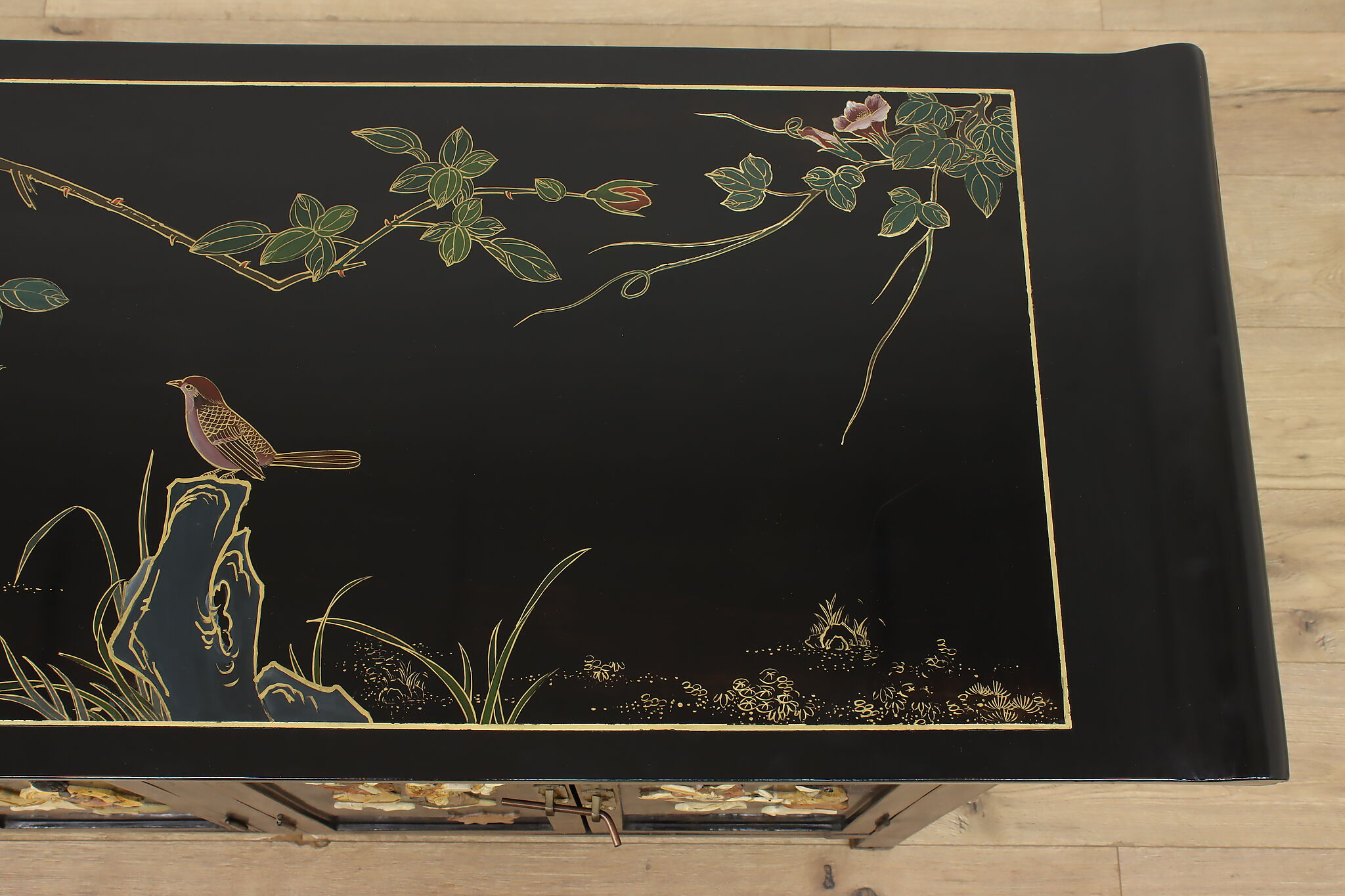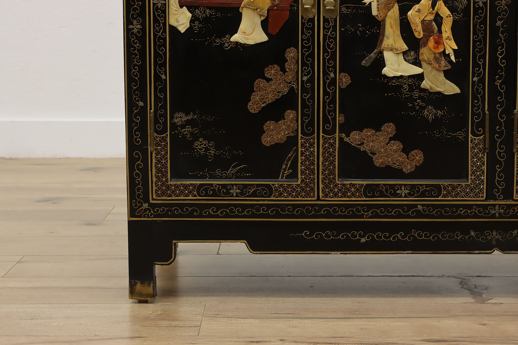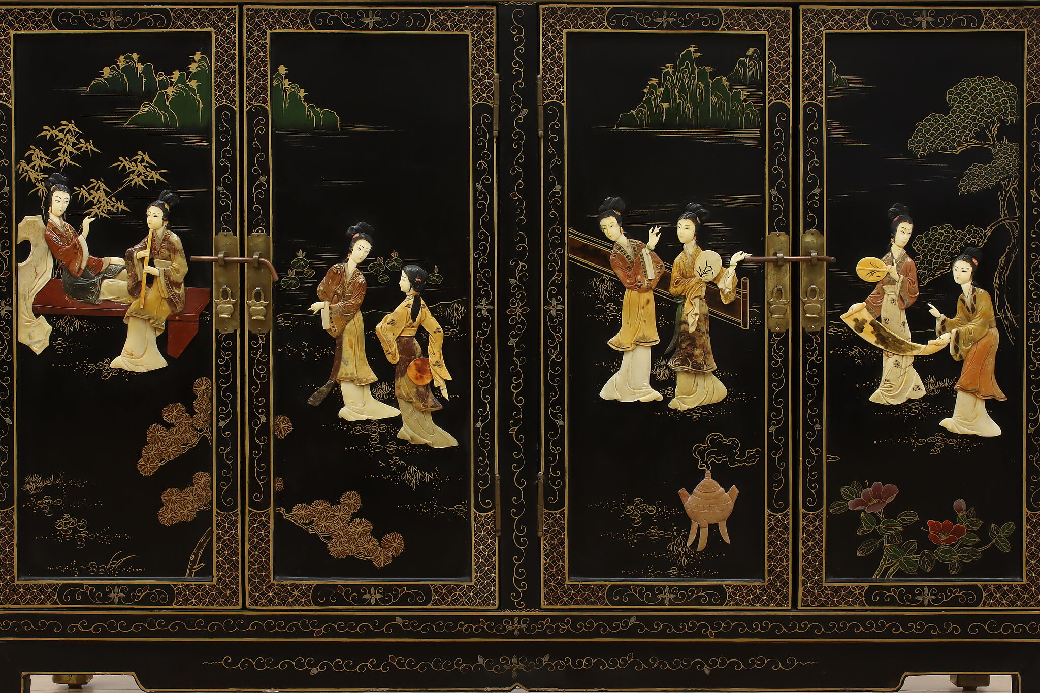 This beautiful sideboard, hall console or TV console has traditional chinoiserie painting with carved jade stone figures of courtesans.