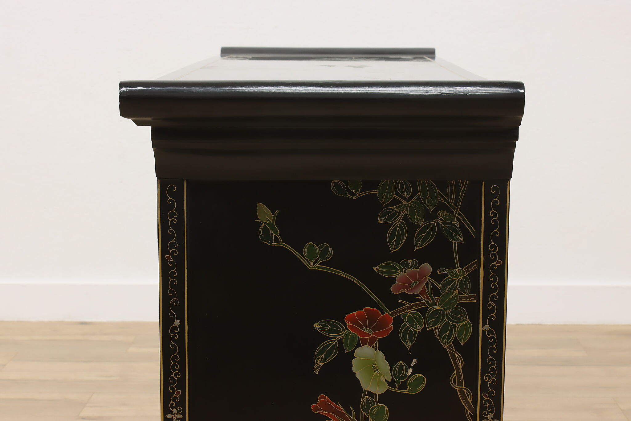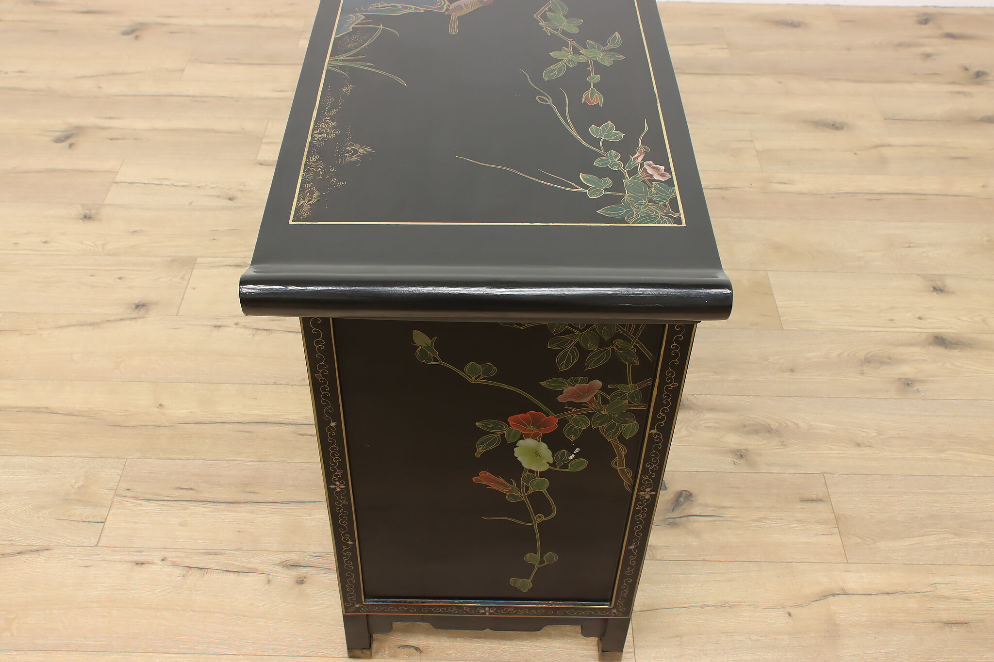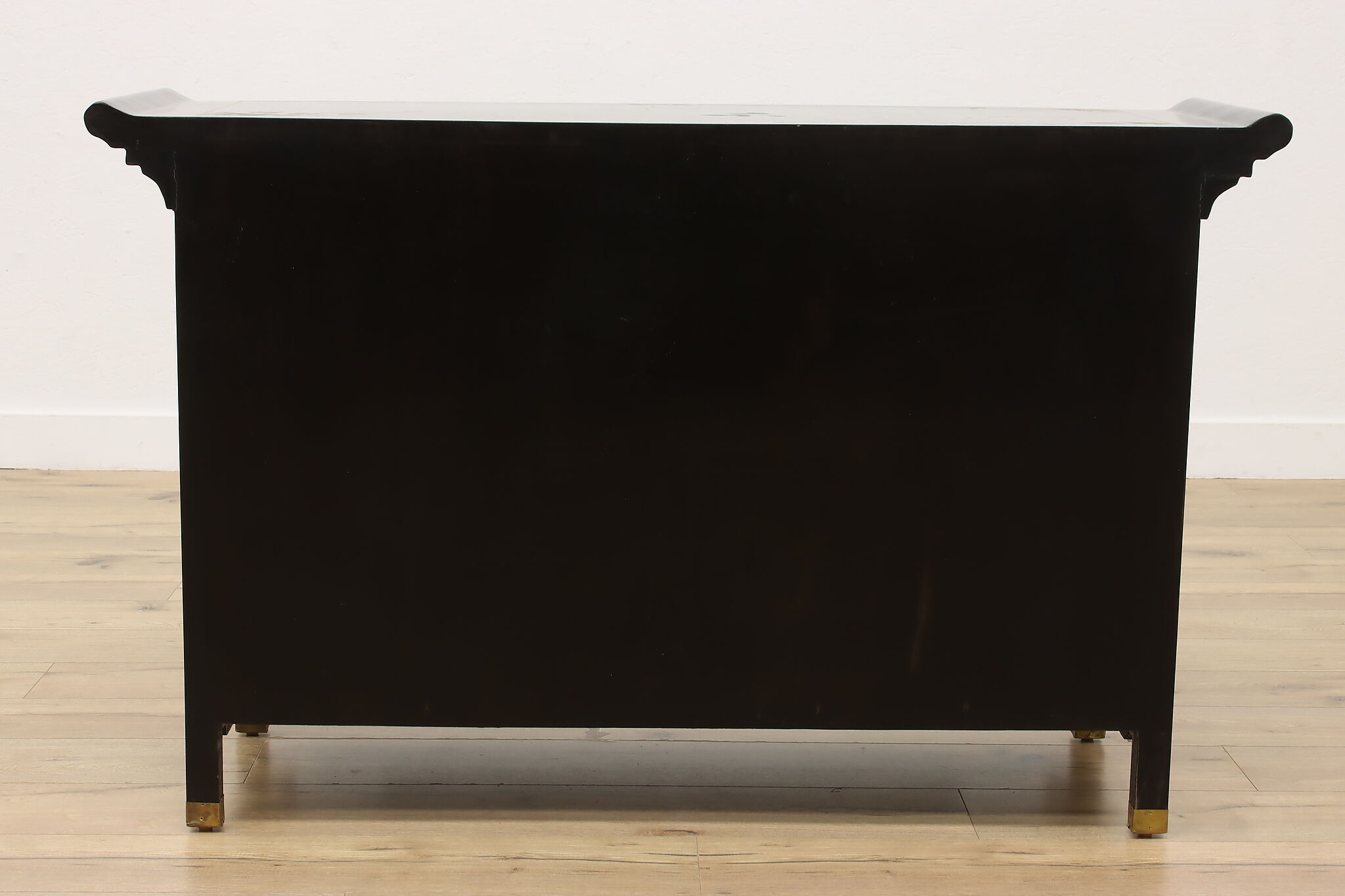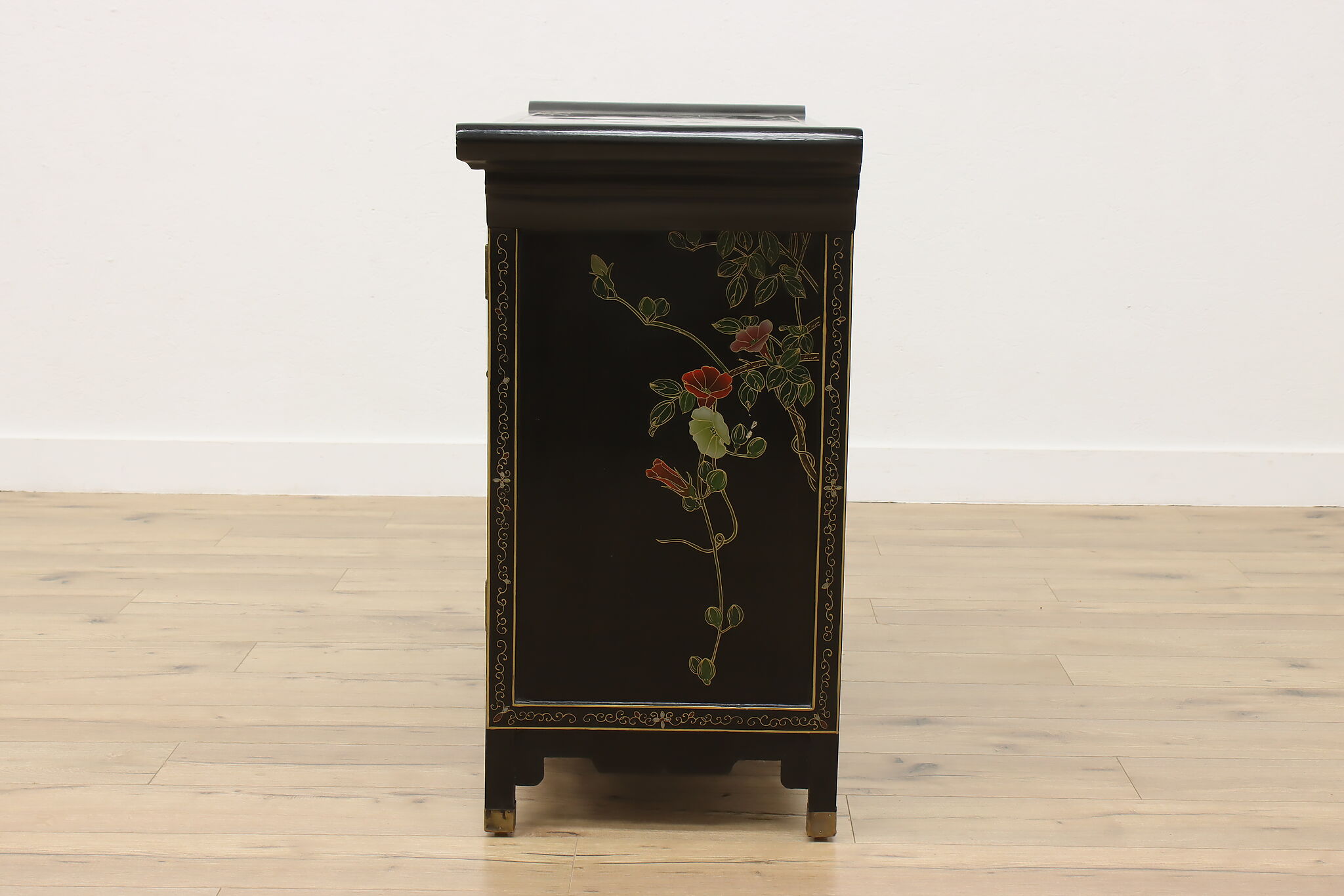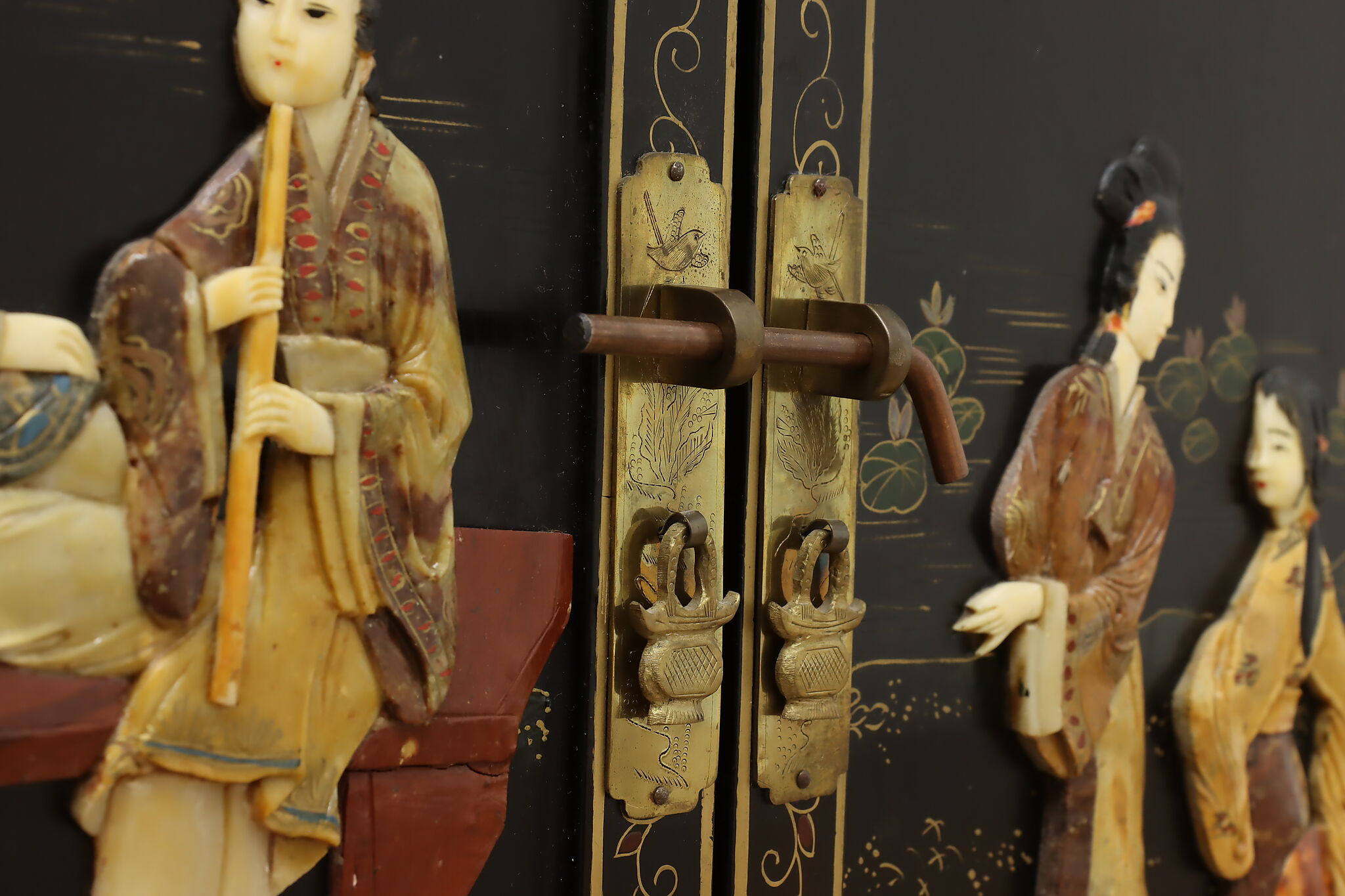 This beautiful sideboard, hall console or TV console has traditional chinoiserie painting with carved jade stone figures of courtesans.