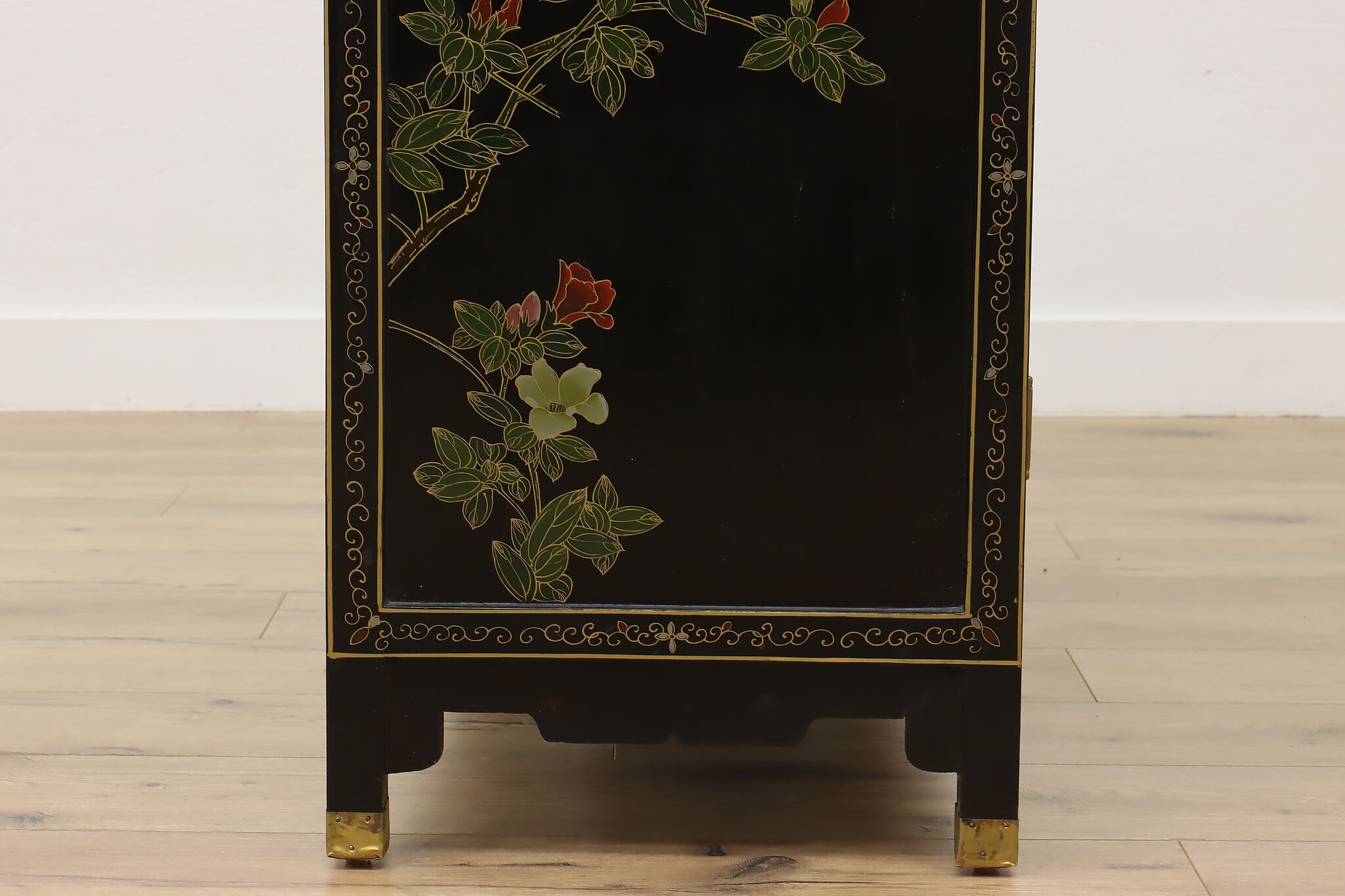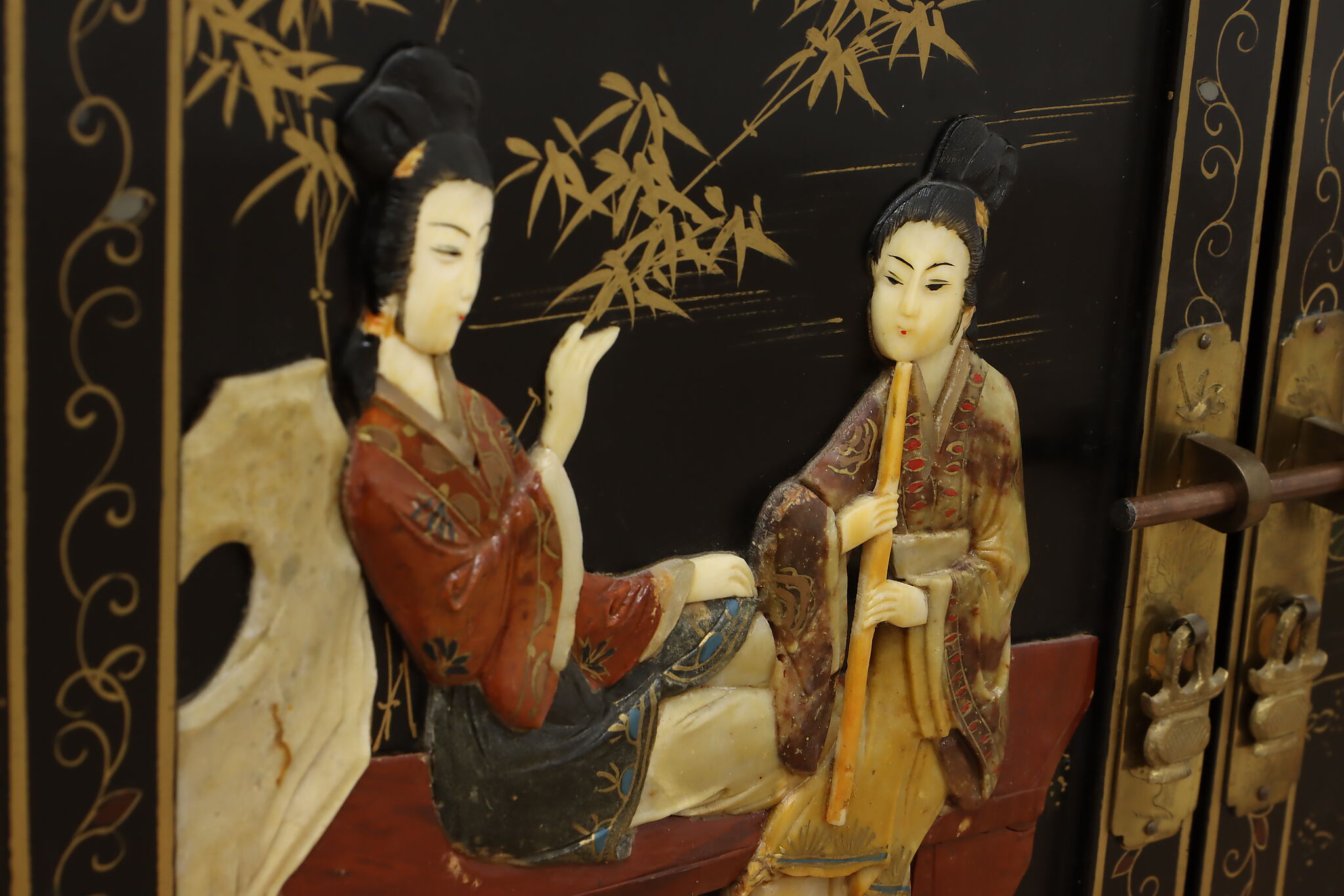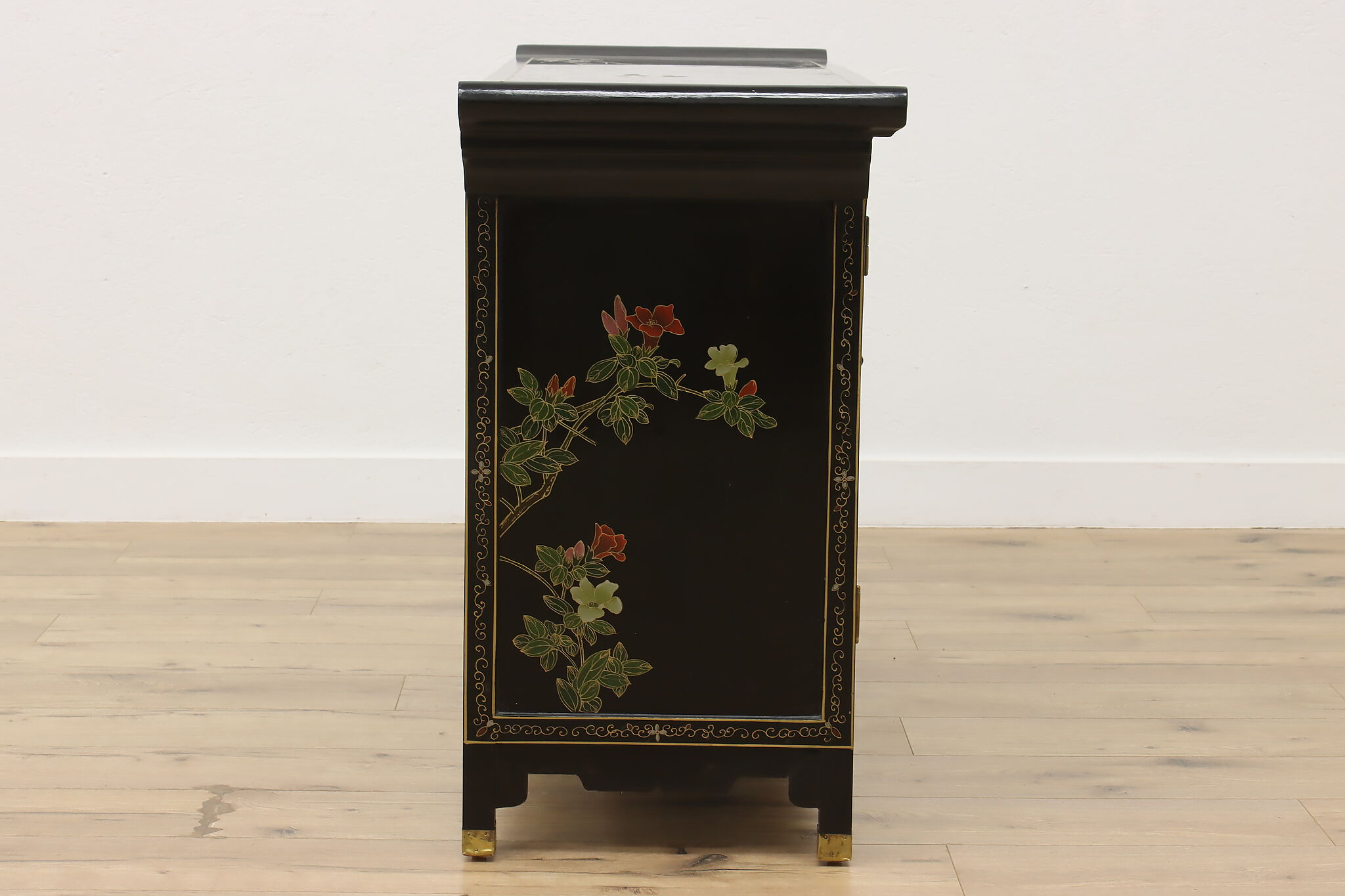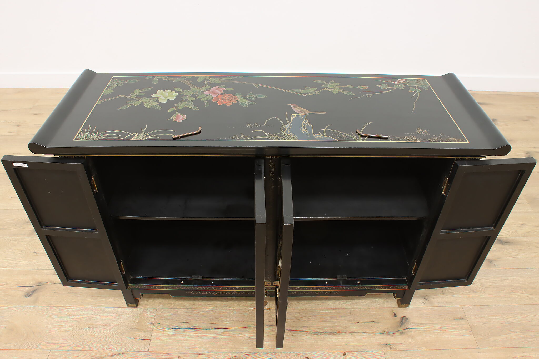 This beautiful sideboard, hall console or TV console has traditional chinoiserie painting with carved jade stone figures of courtesans.