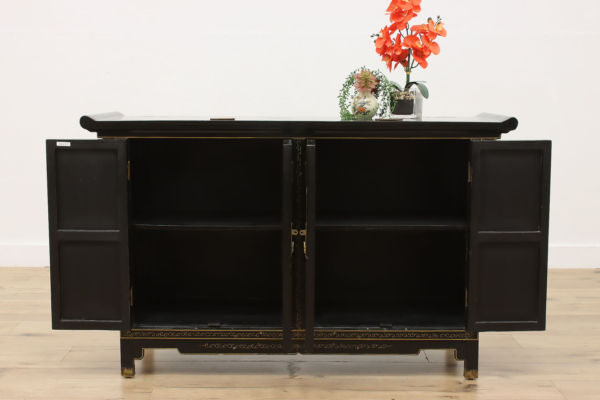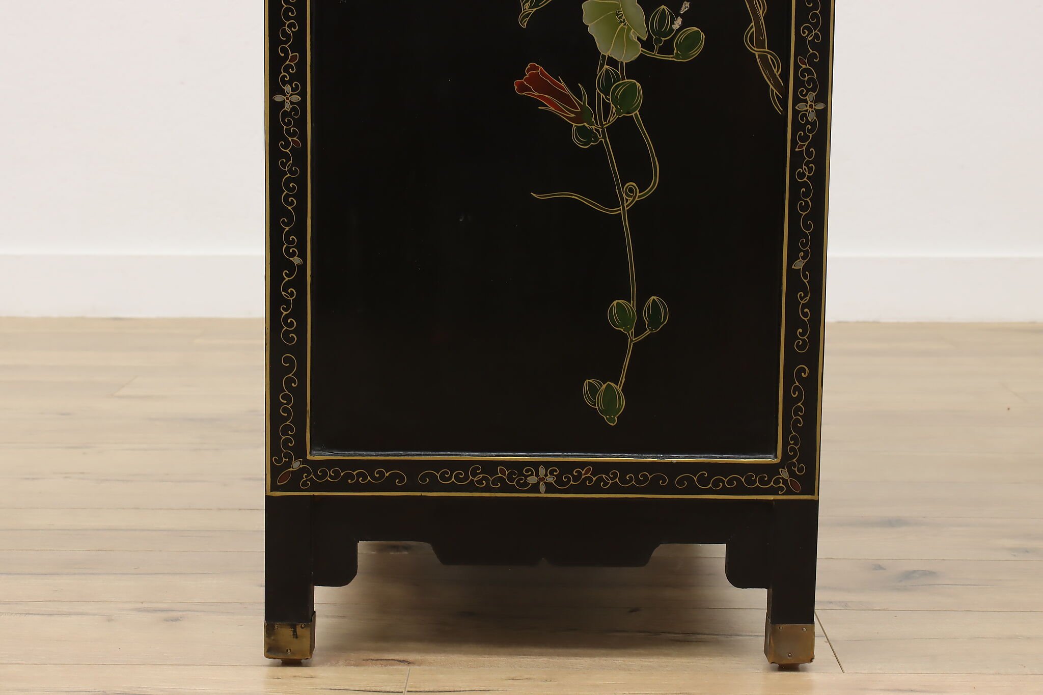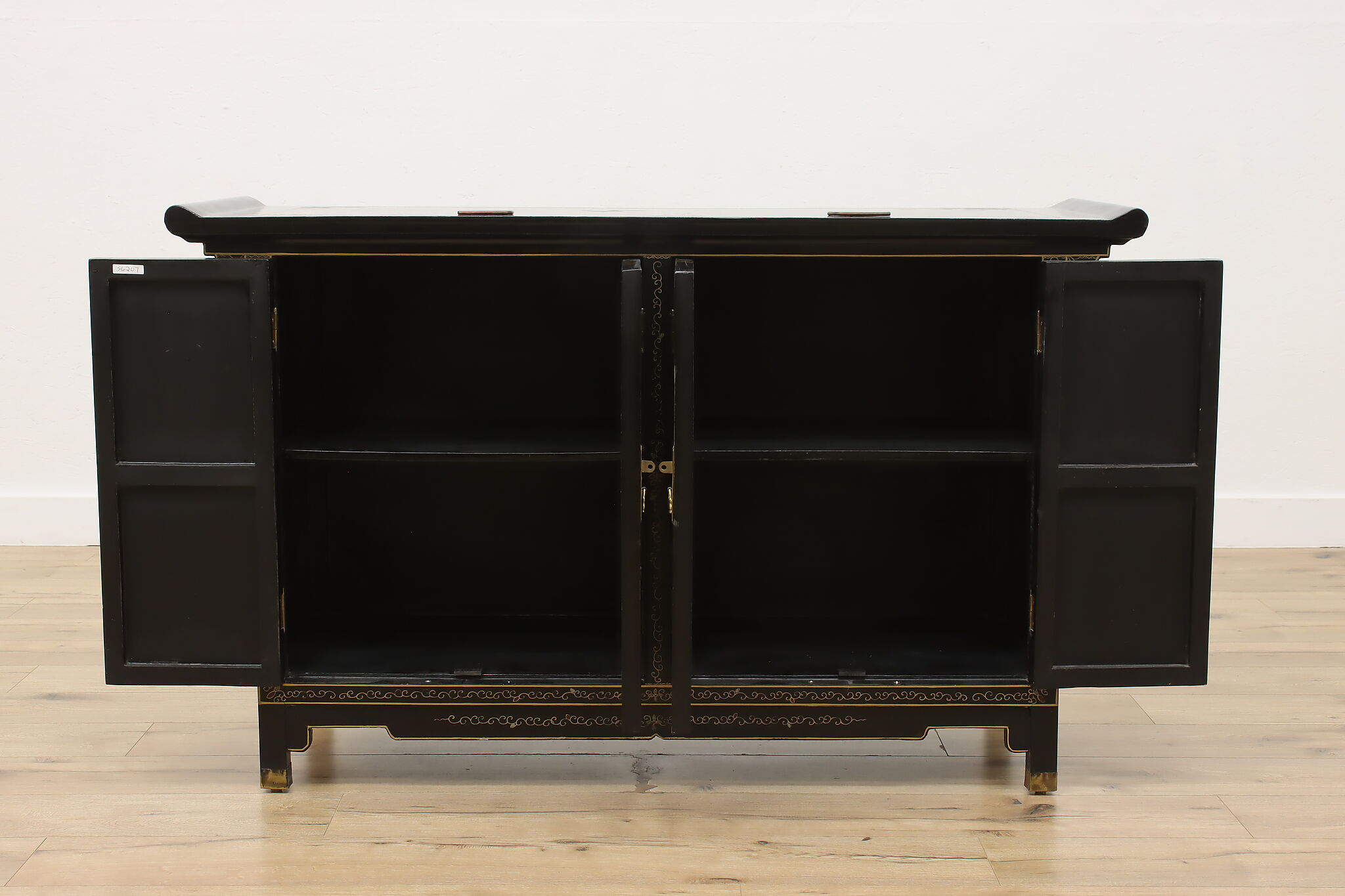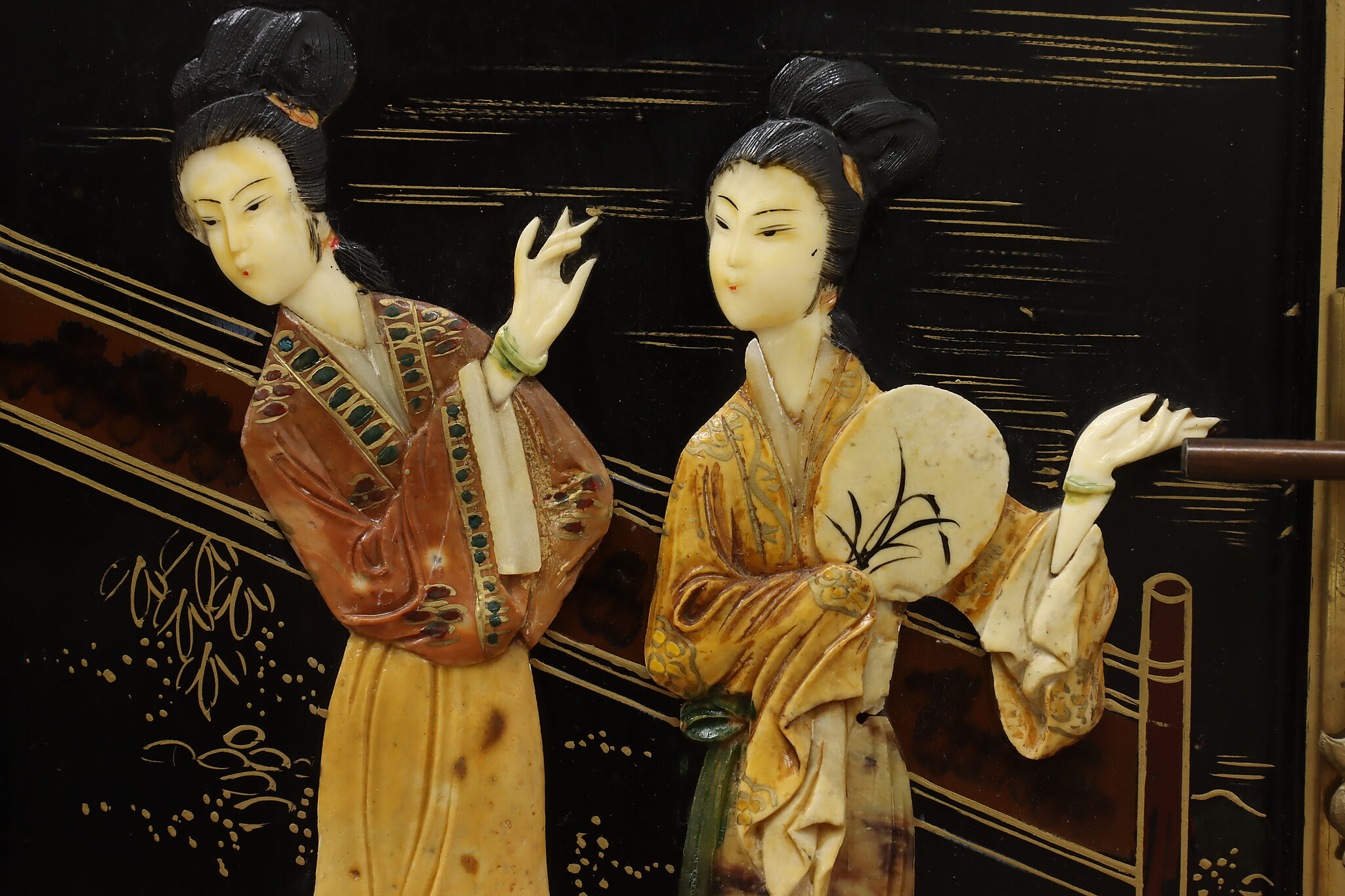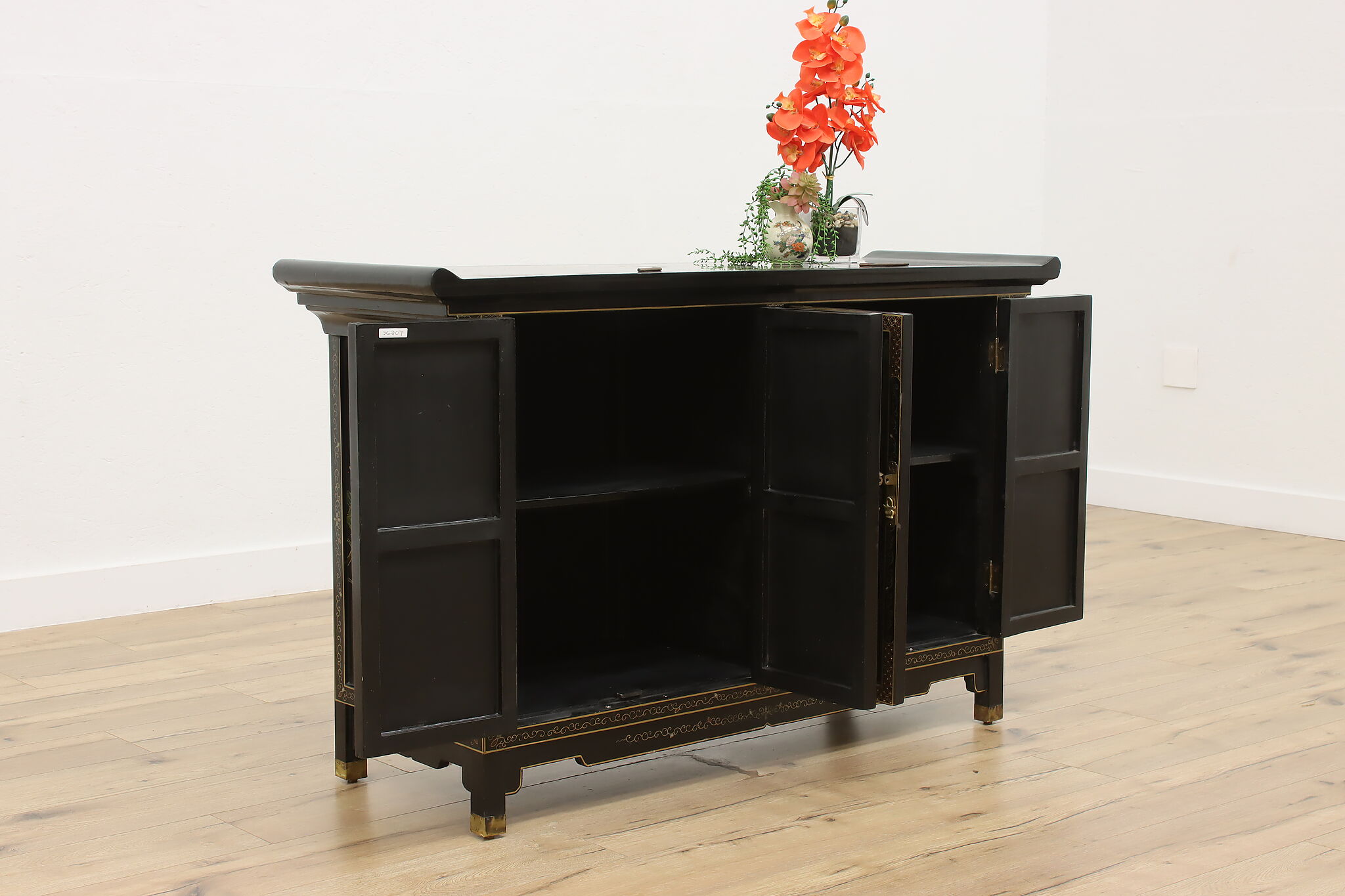 This beautiful sideboard, hall console or TV console has traditional chinoiserie painting with carved jade stone figures of courtesans.