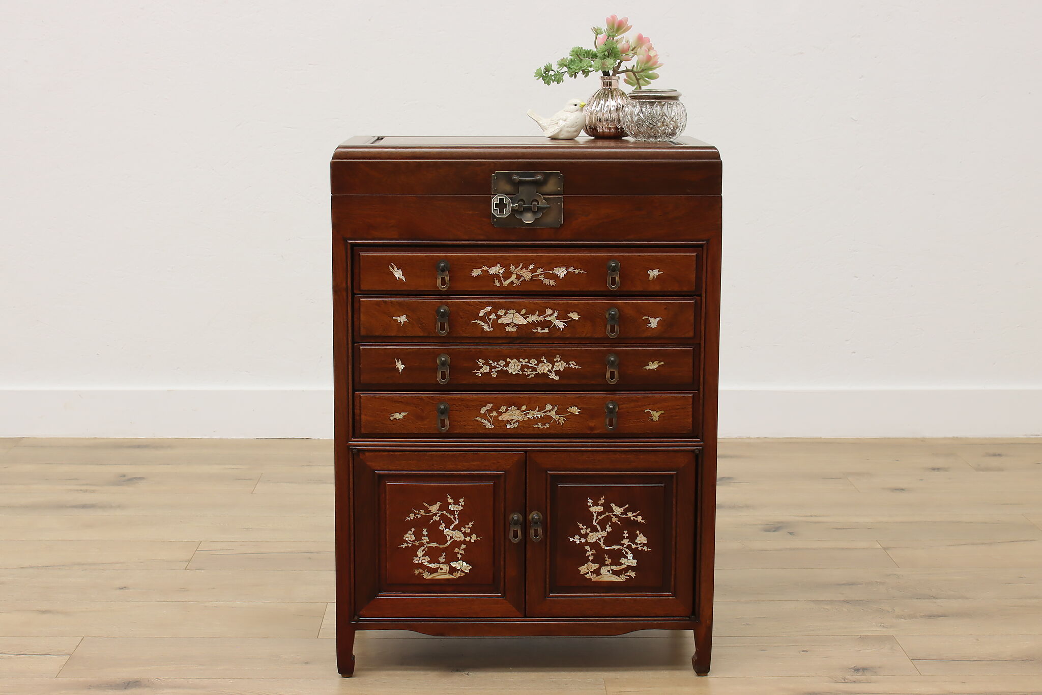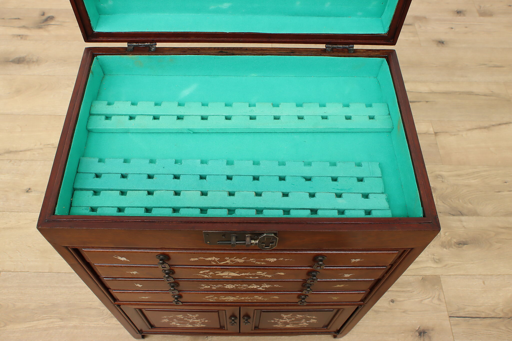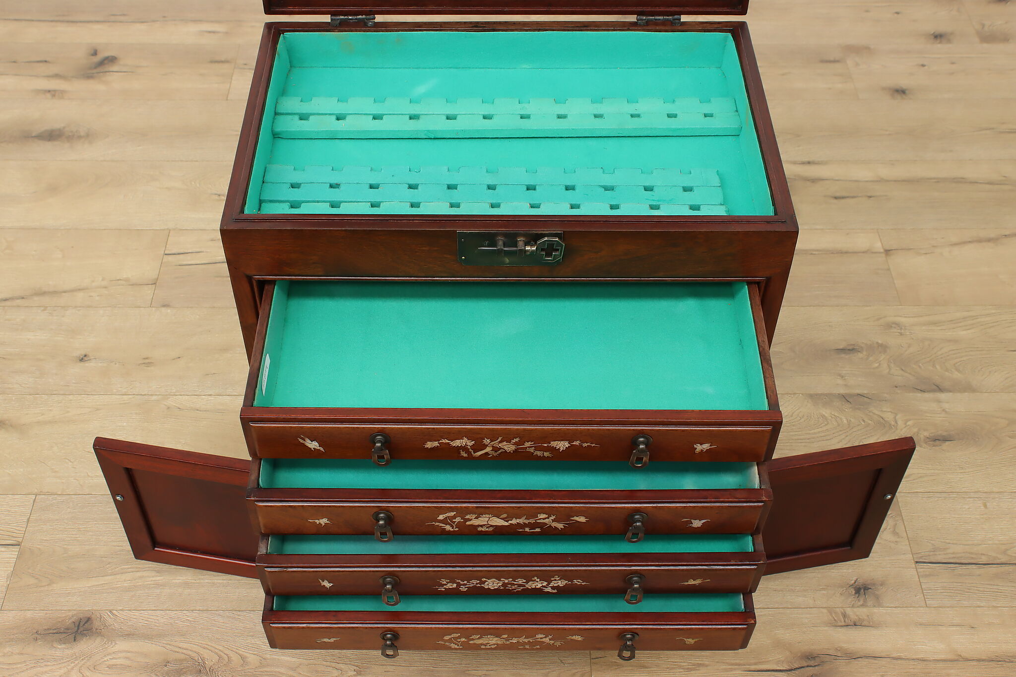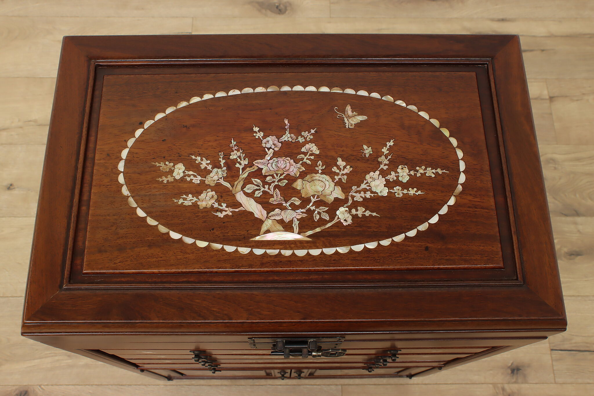 This silver or jewelry chest has gorgeous mother of pearl inlay with blooming cherry trees, butterflies, and birds.