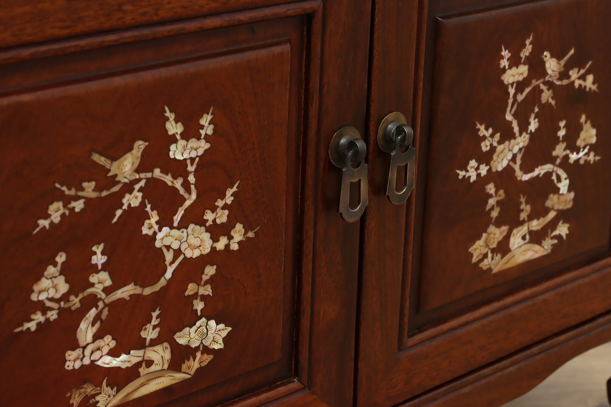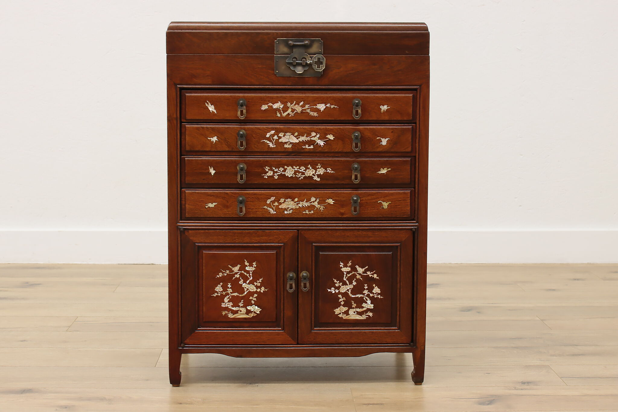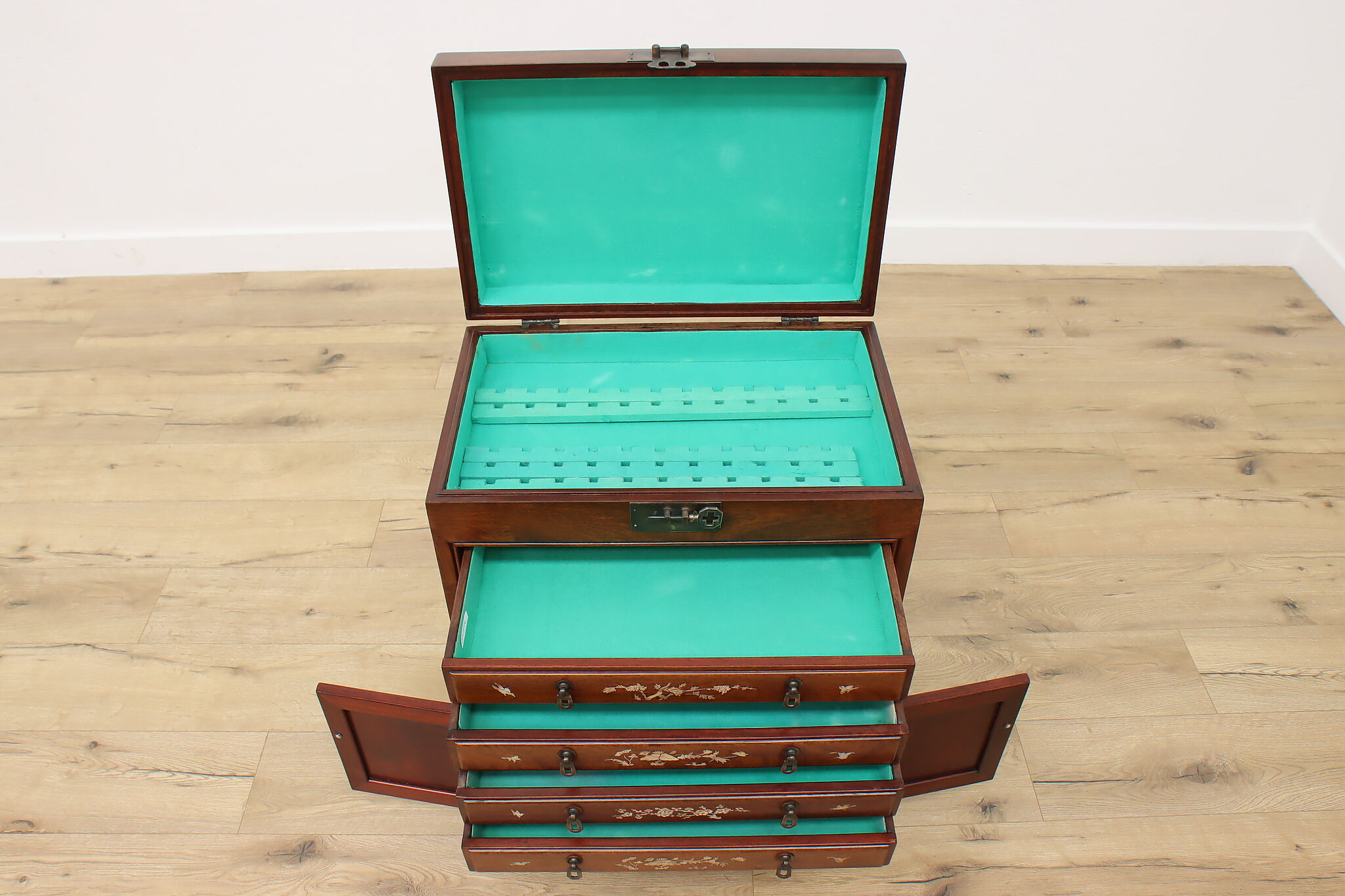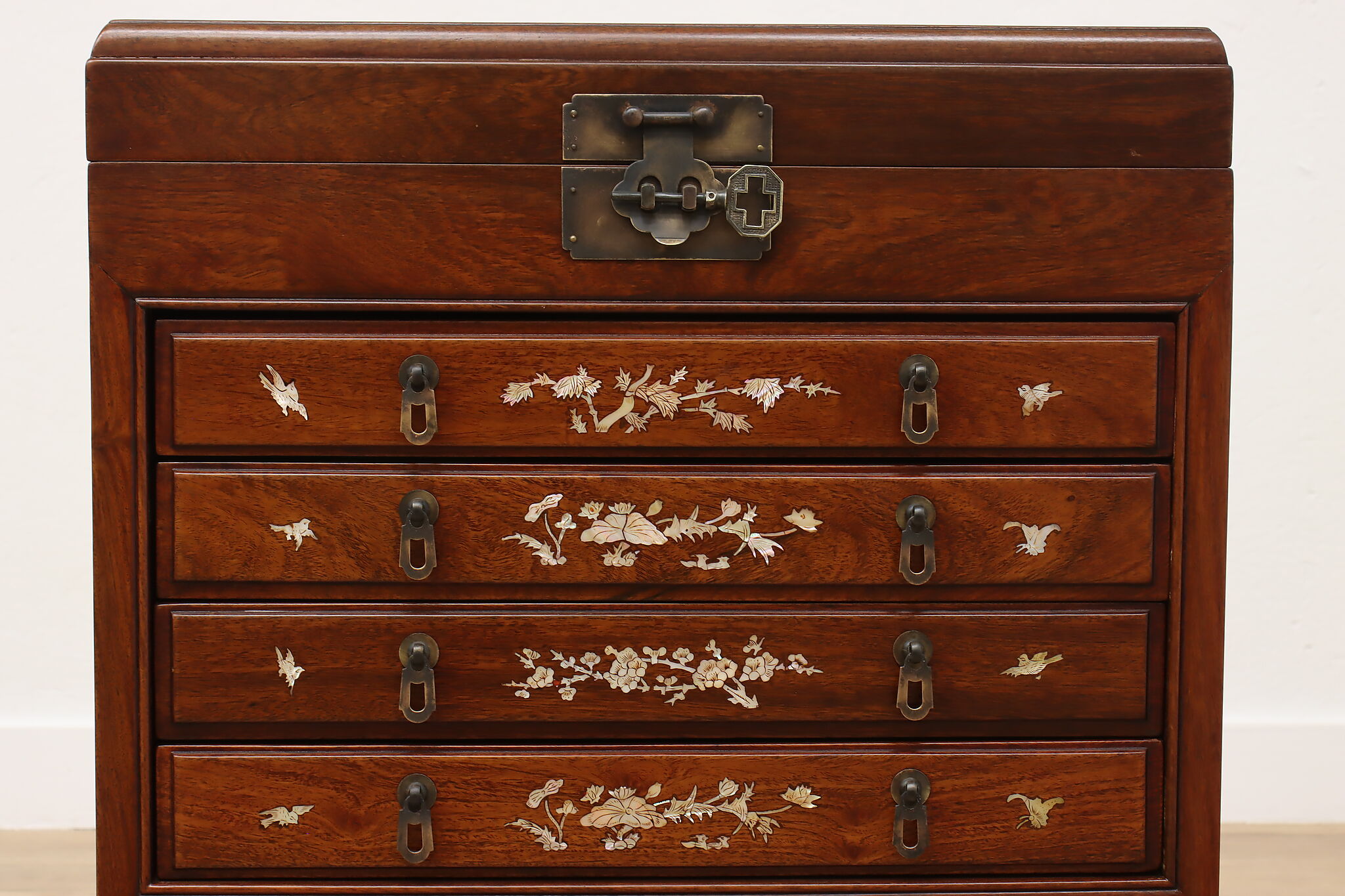 This silver or jewelry chest has gorgeous mother of pearl inlay with blooming cherry trees, butterflies, and birds.