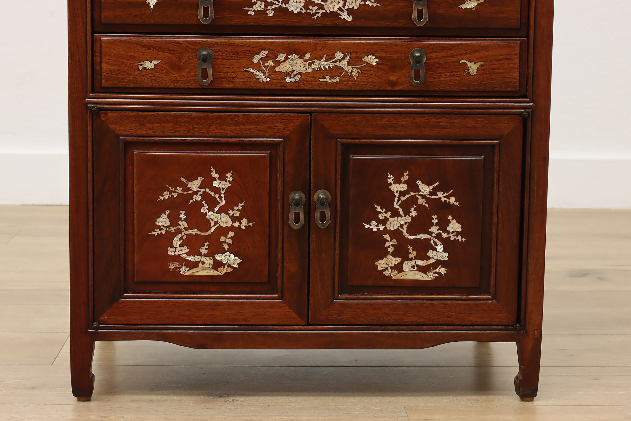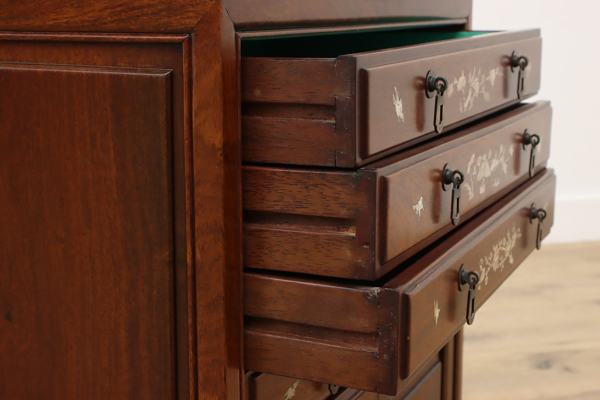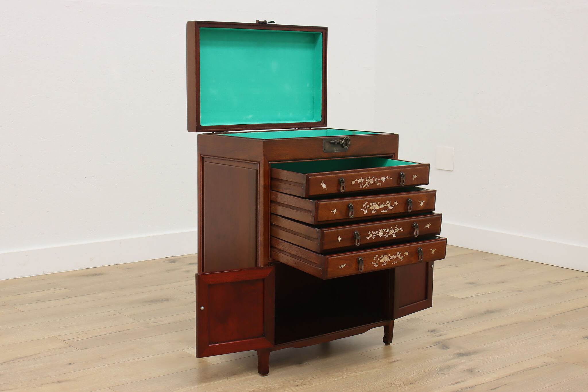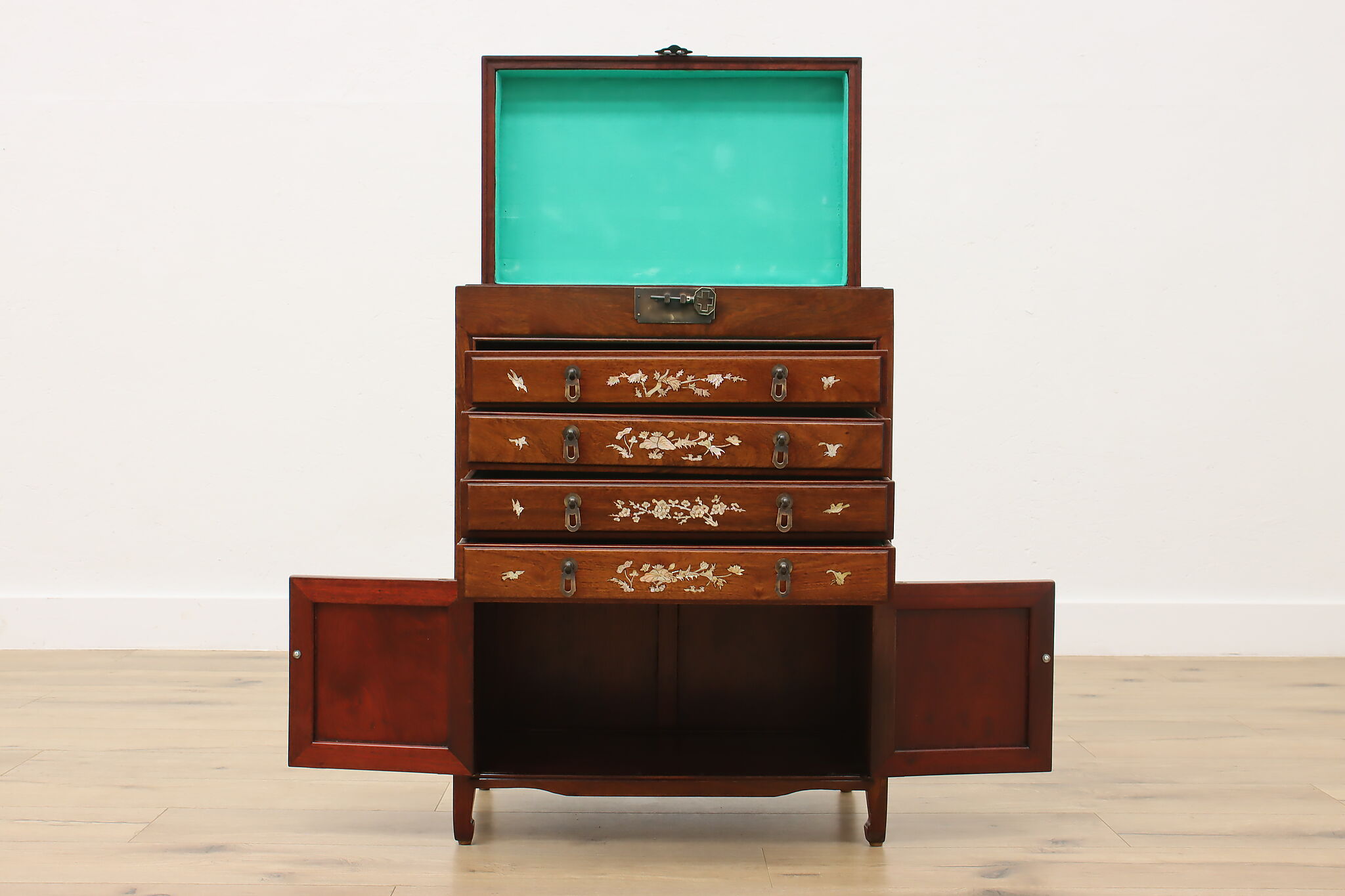 This silver or jewelry chest has gorgeous mother of pearl inlay with blooming cherry trees, butterflies, and birds.