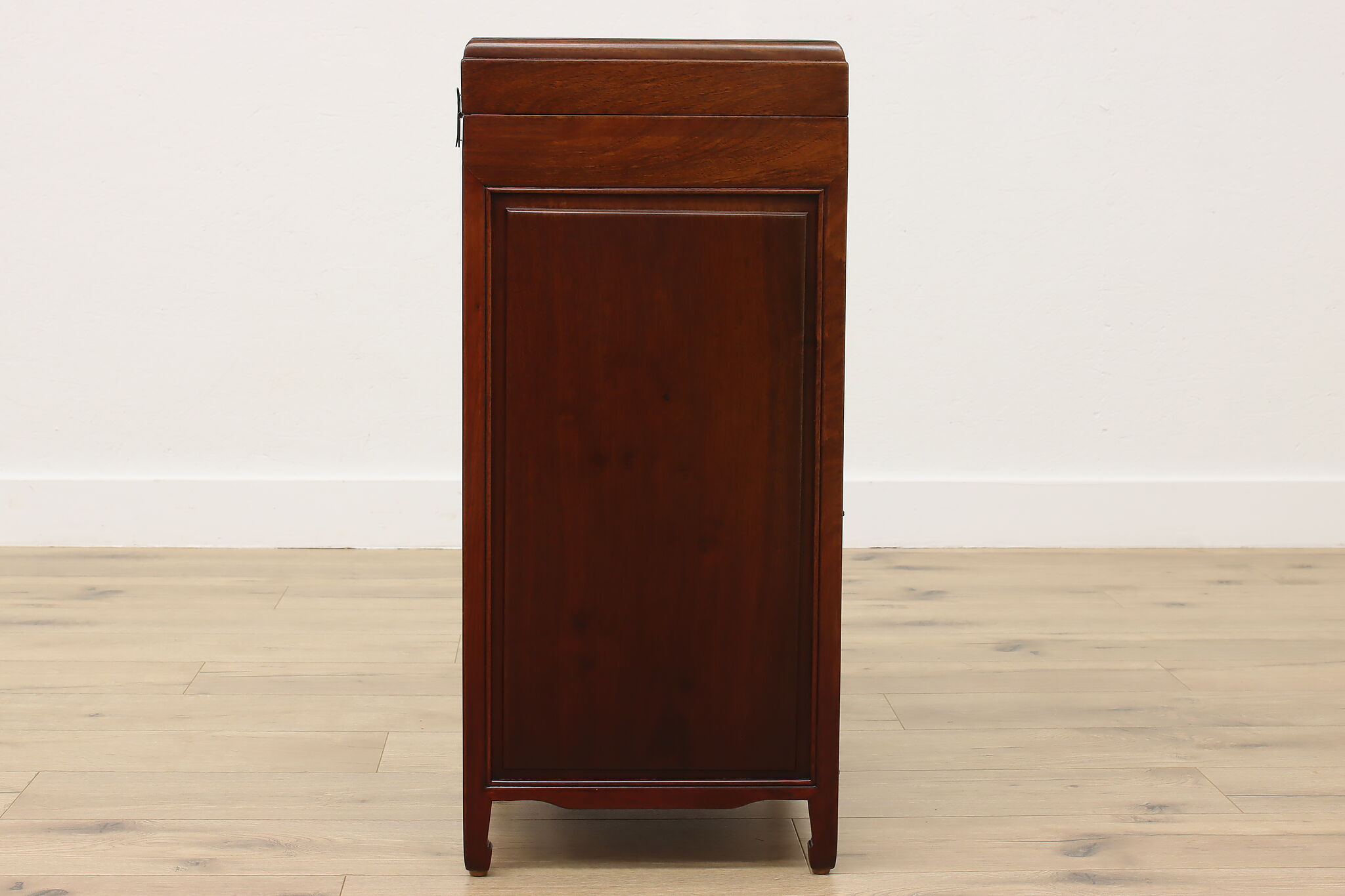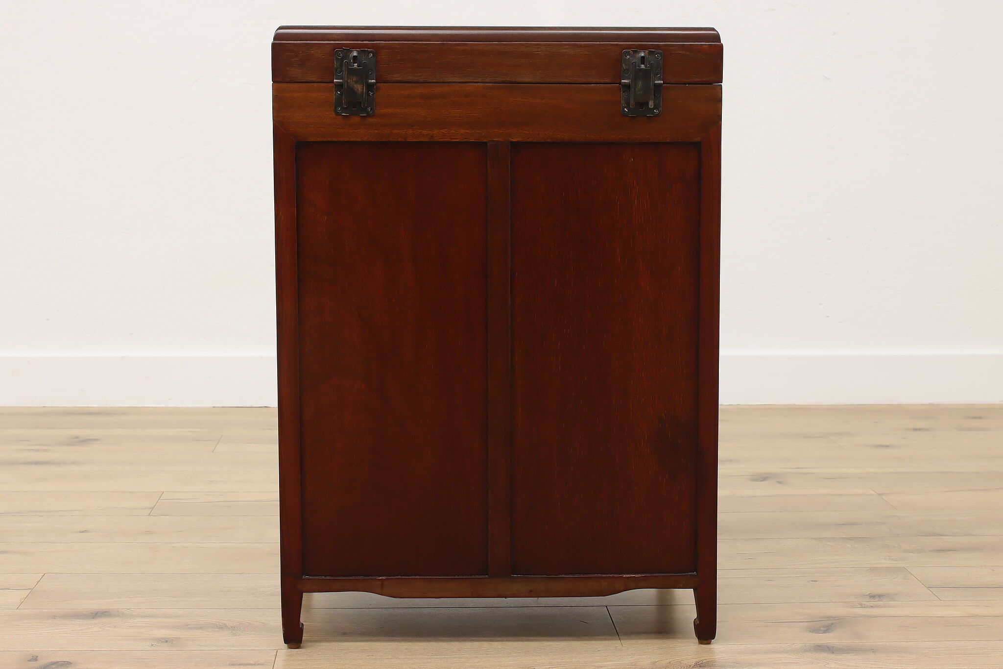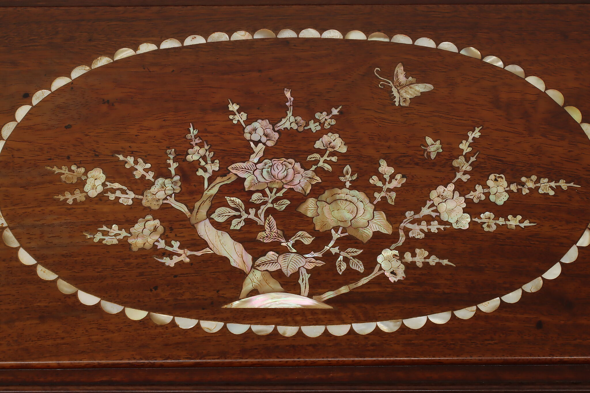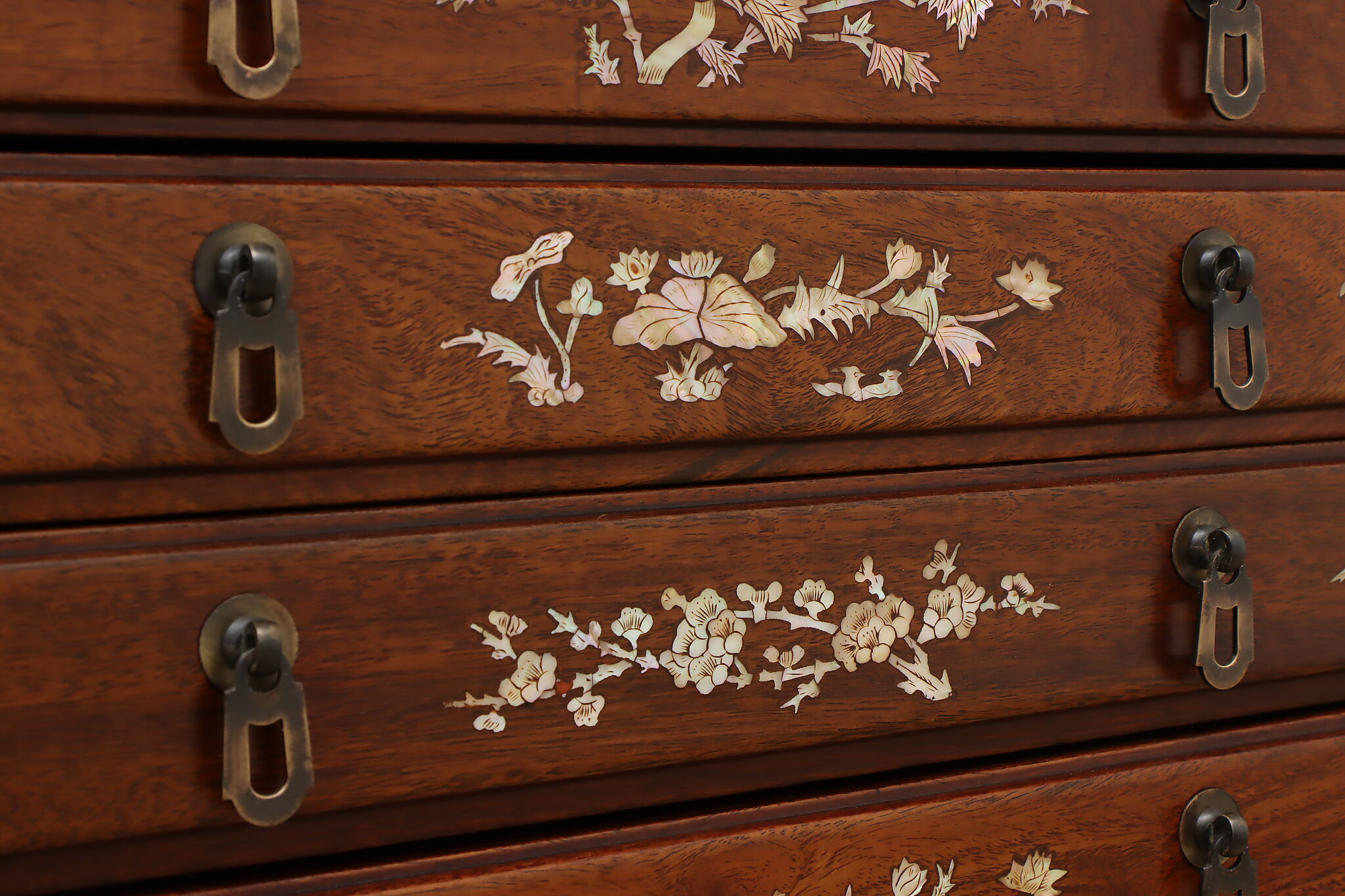 This silver or jewelry chest has gorgeous mother of pearl inlay with blooming cherry trees, butterflies, and birds.