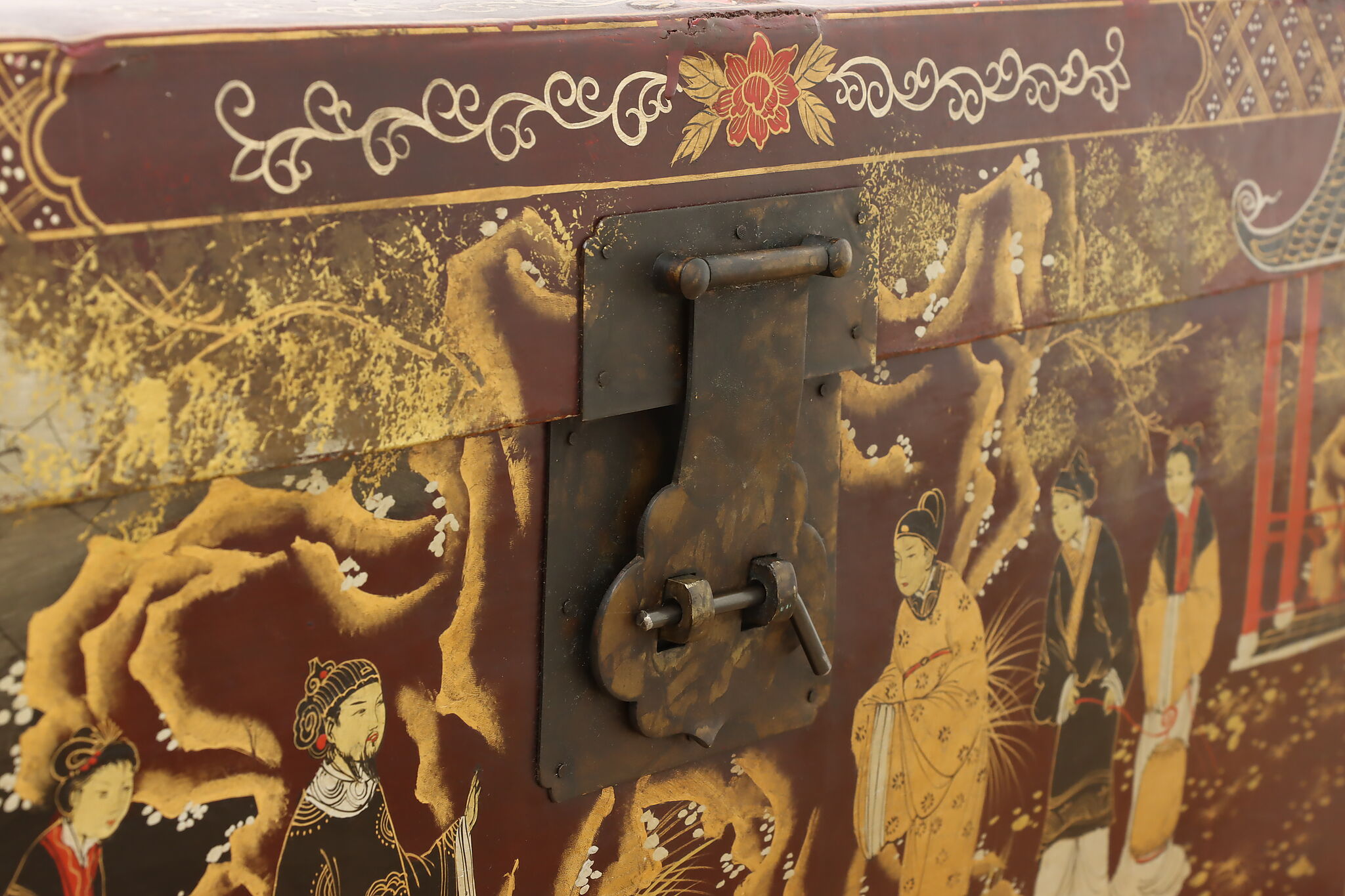 This storage trunk or chest has wonderfully hand-painted scenes from a Chinese temple.