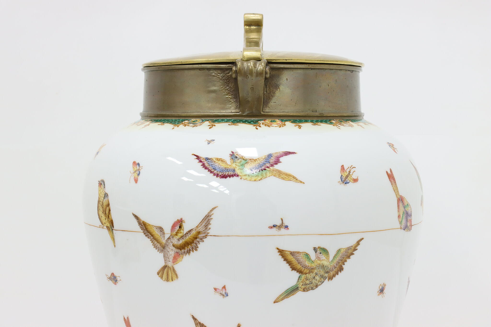 This large ceramic jar or urn has beautiful hand-painted birds and butterflies.