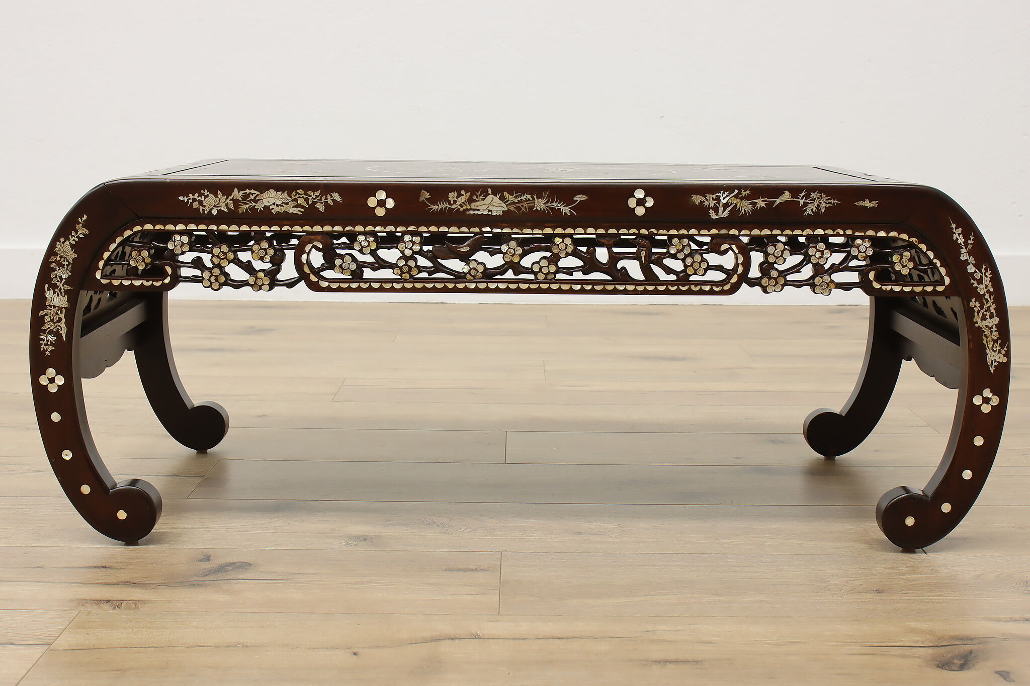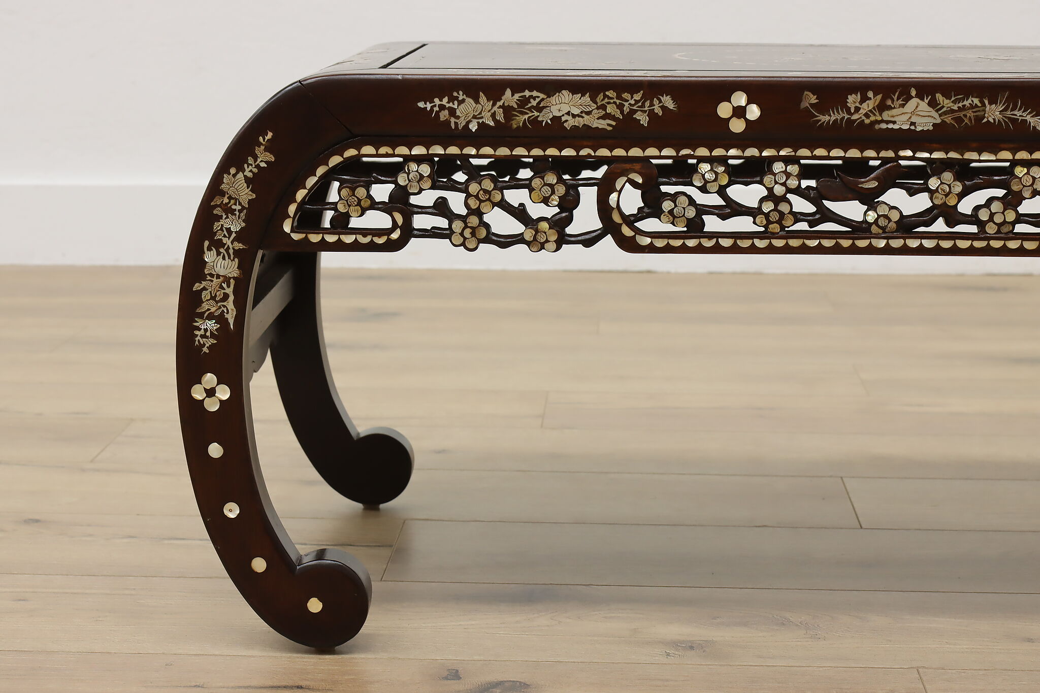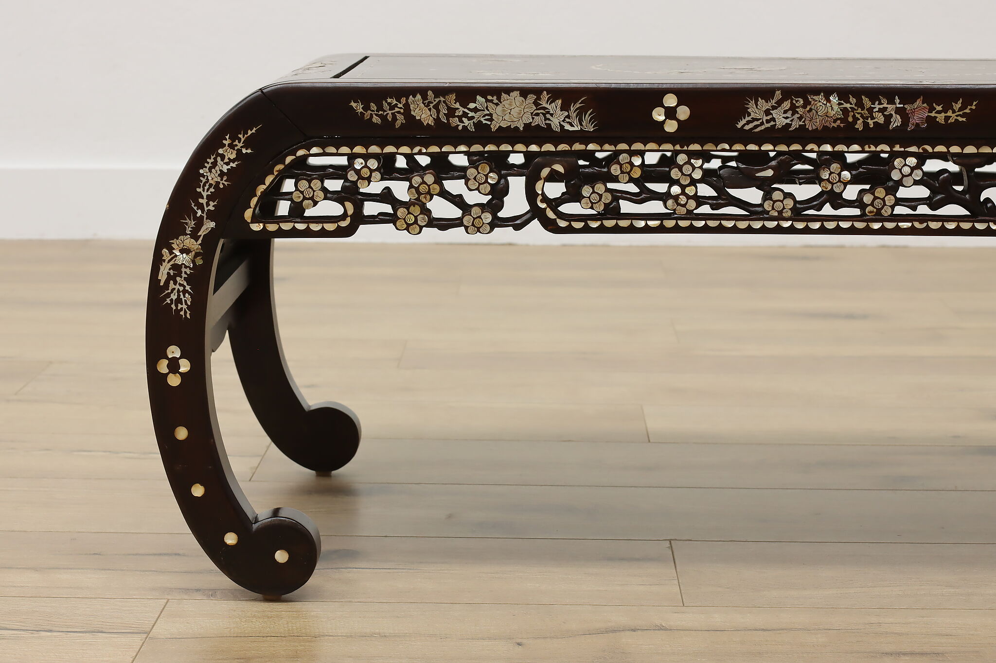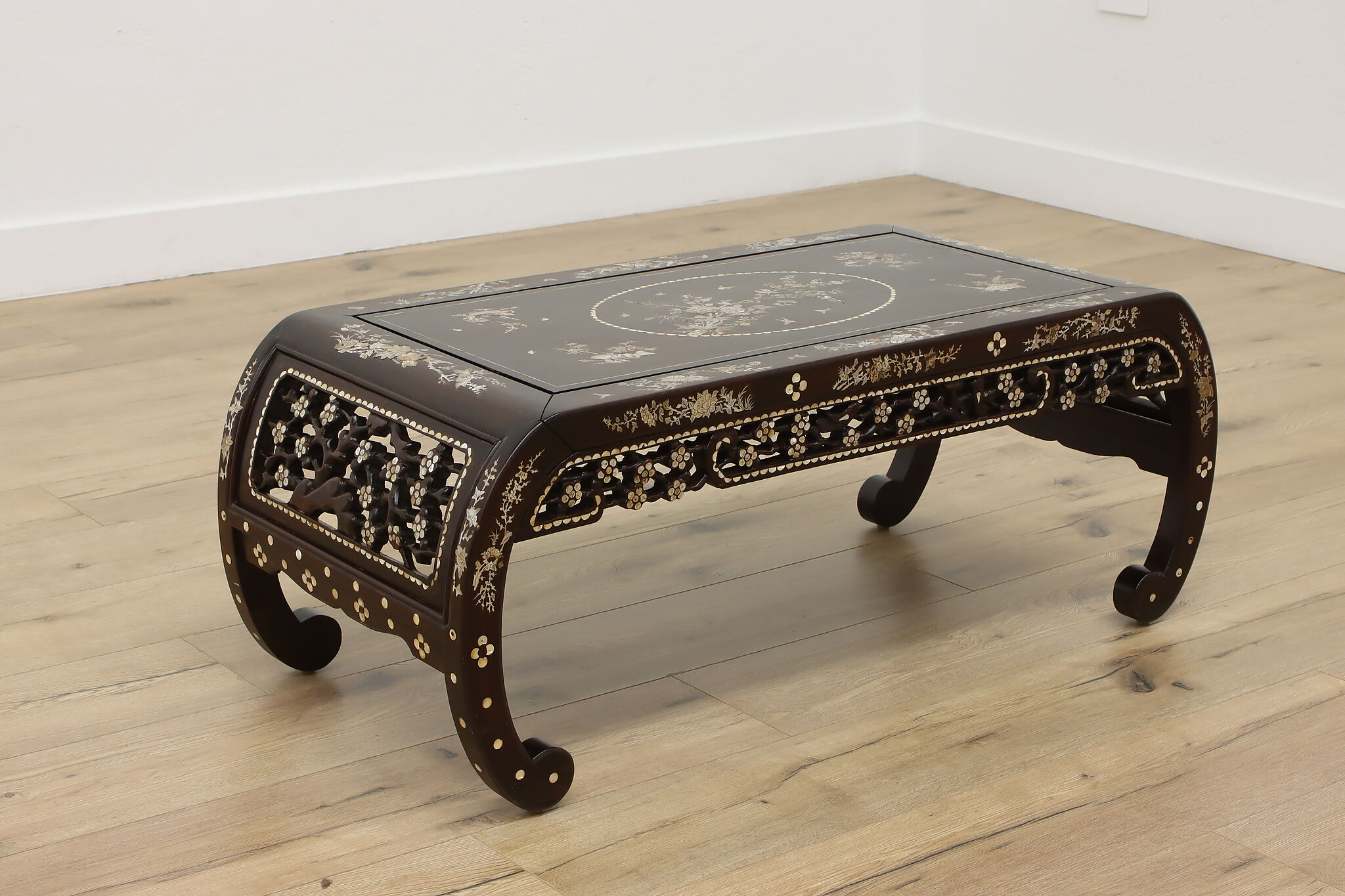 The stunning mother of pearl inlay and carved detailing on this coffee table will make it the center piece of your living room.