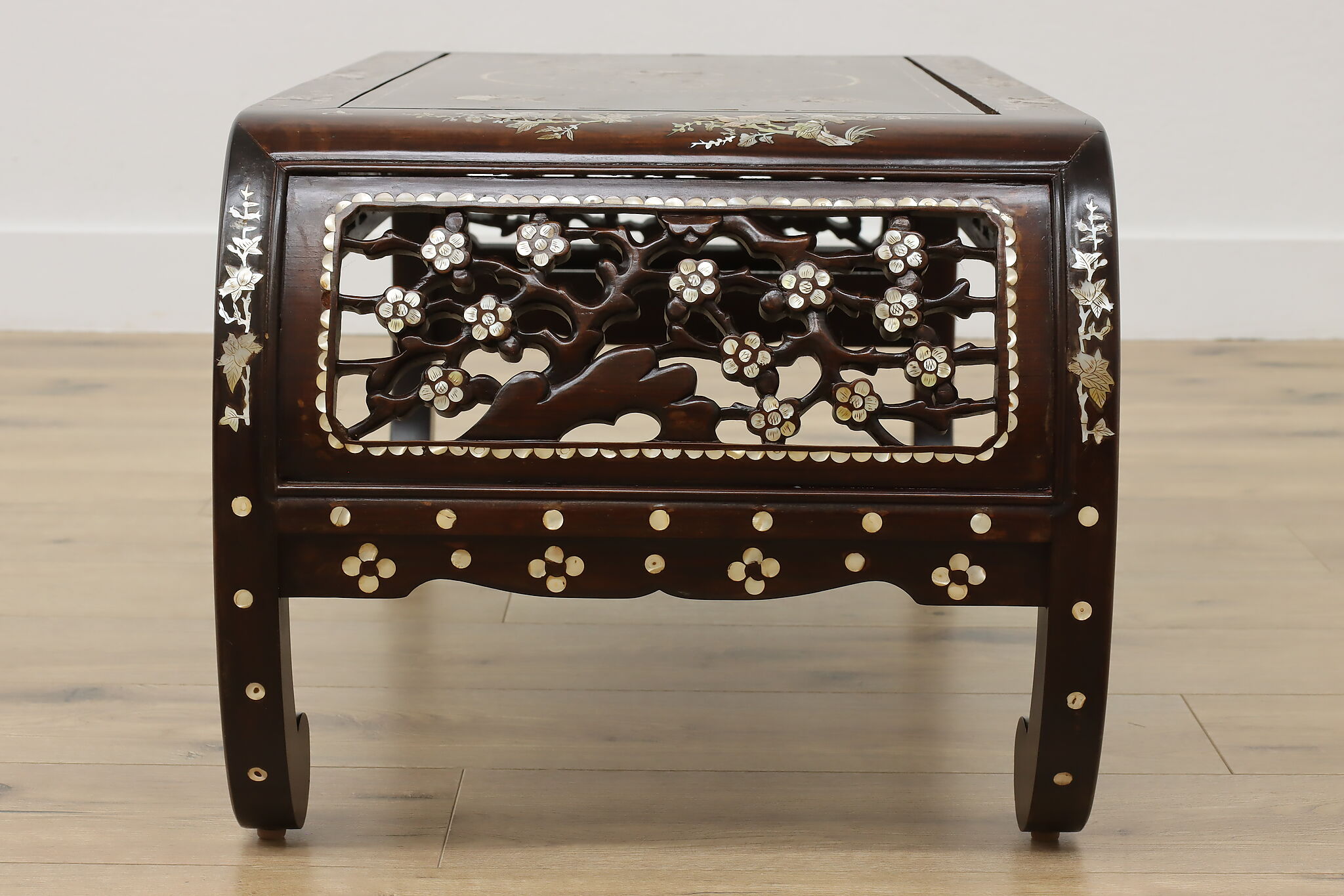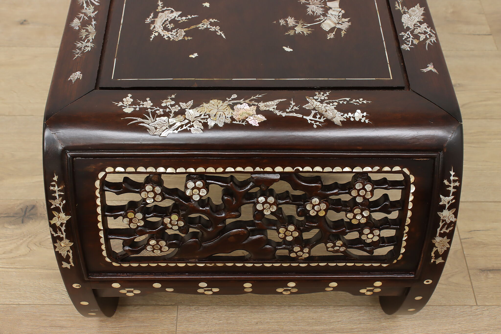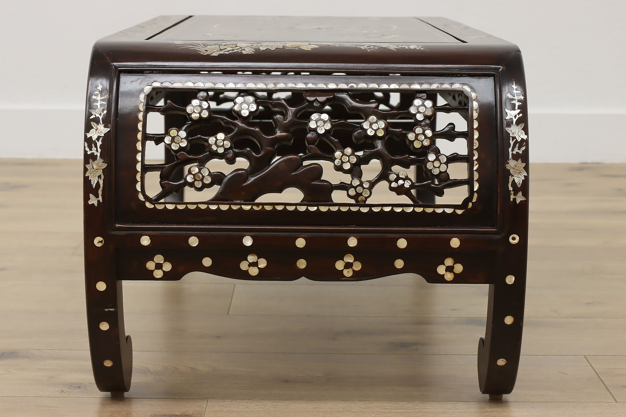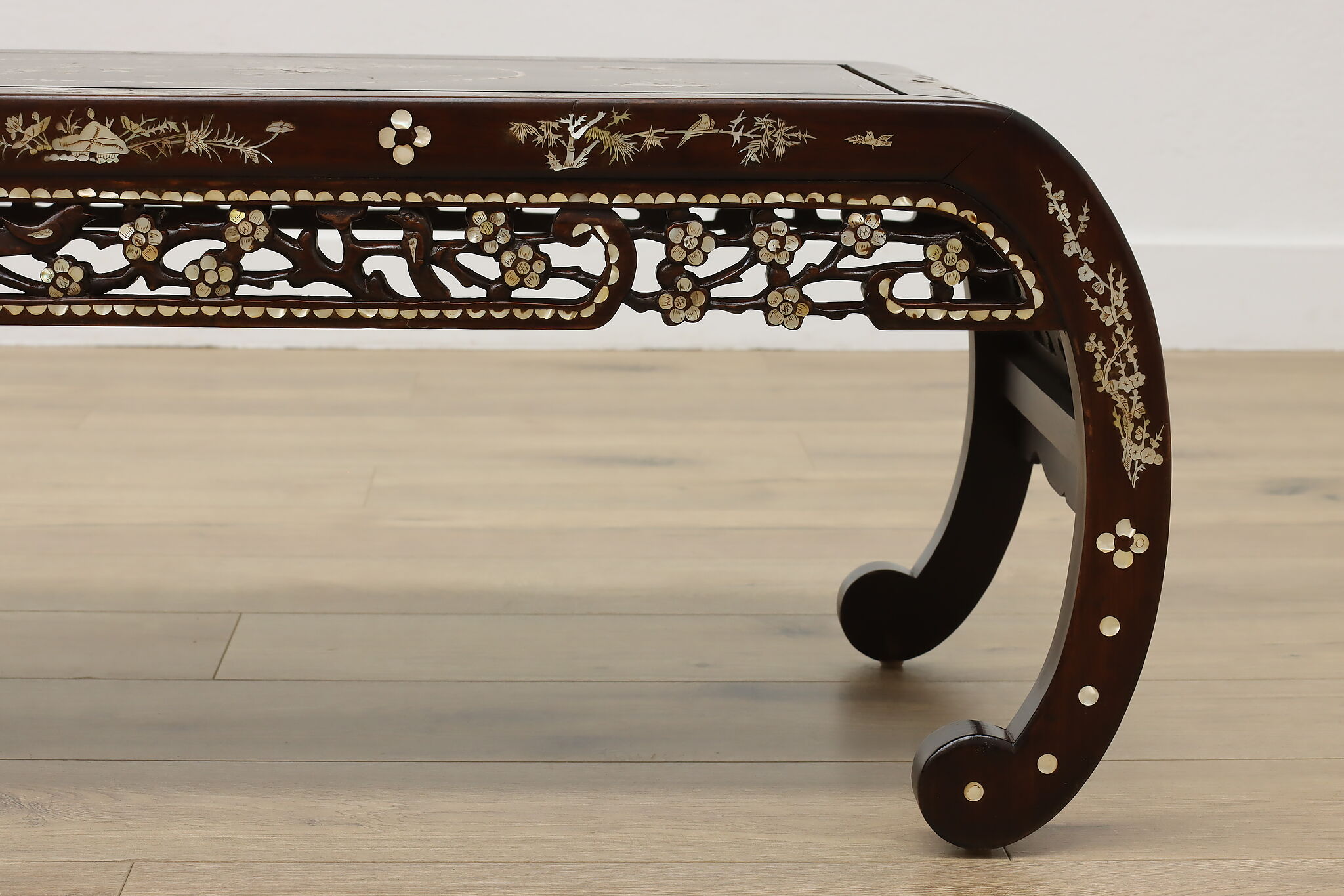 The stunning mother of pearl inlay and carved detailing on this coffee table will make it the center piece of your living room.