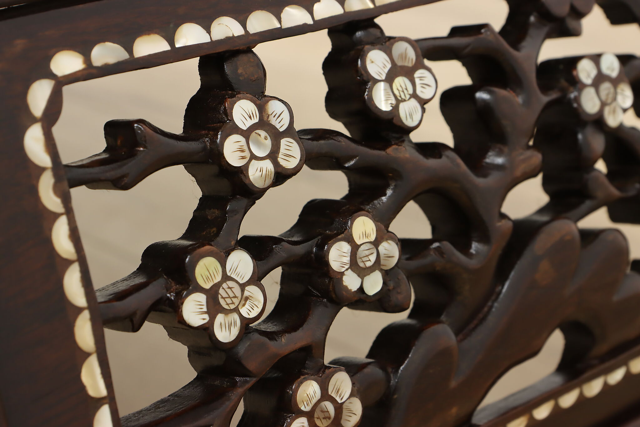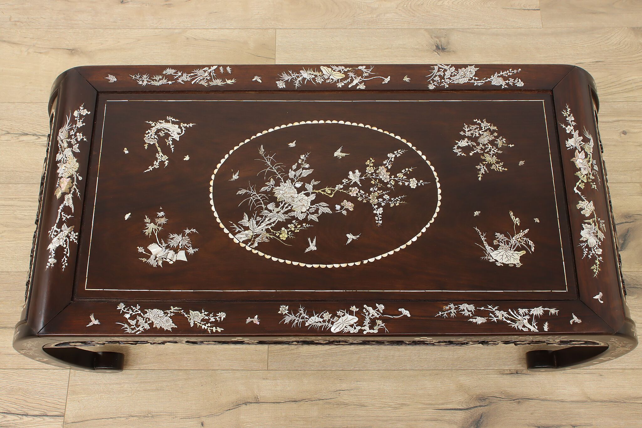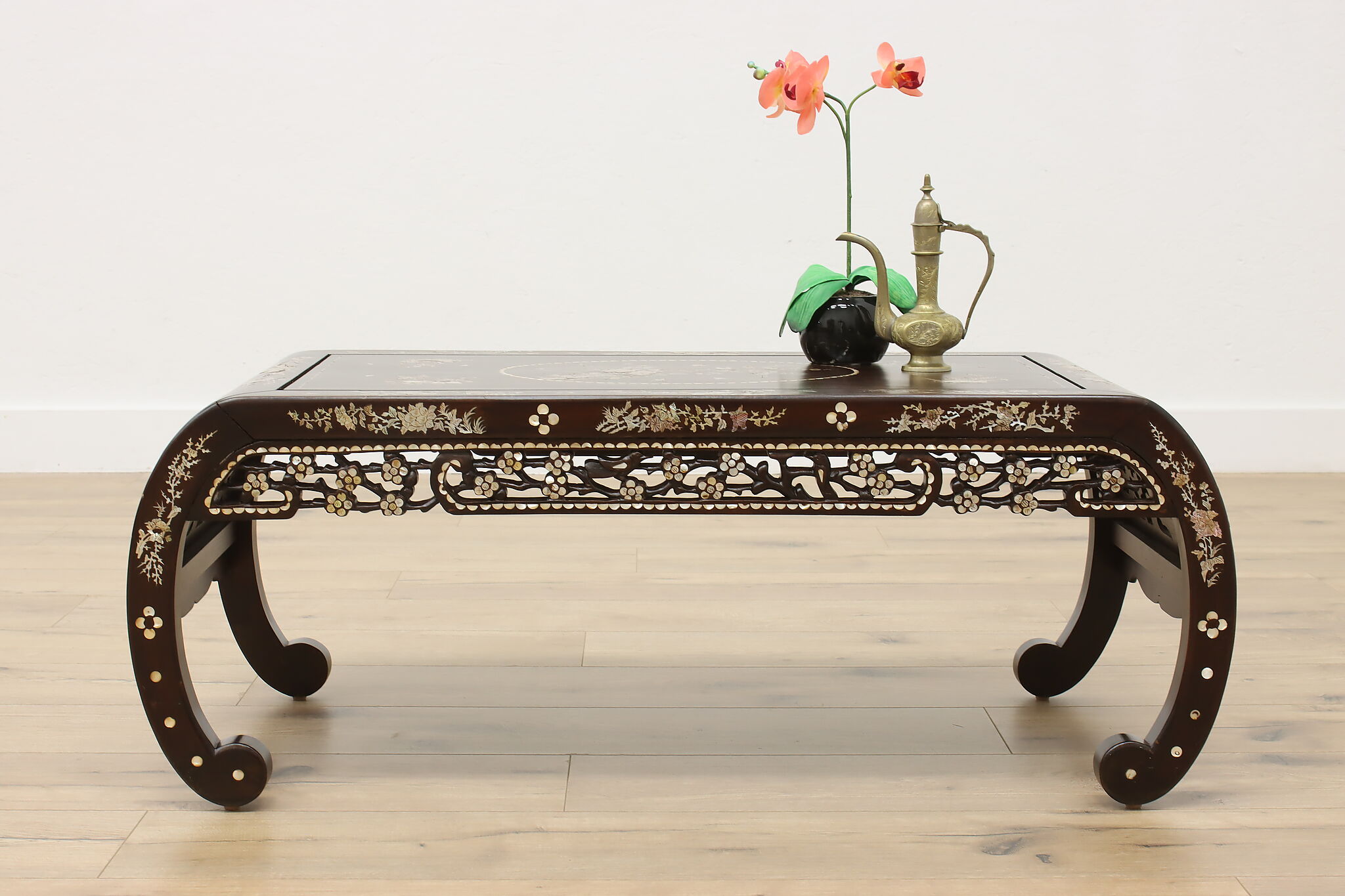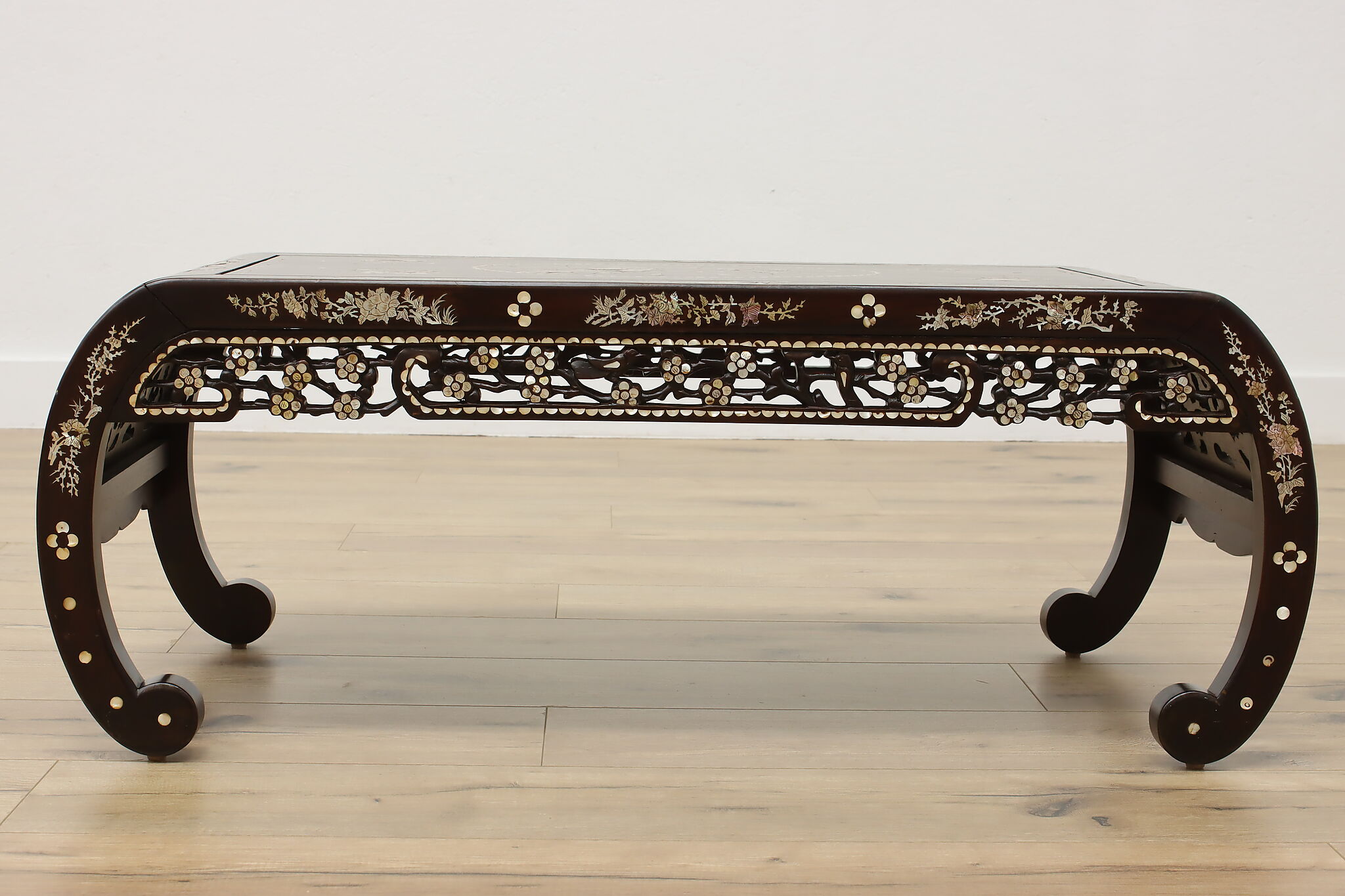 The stunning mother of pearl inlay and carved detailing on this coffee table will make it the center piece of your living room.