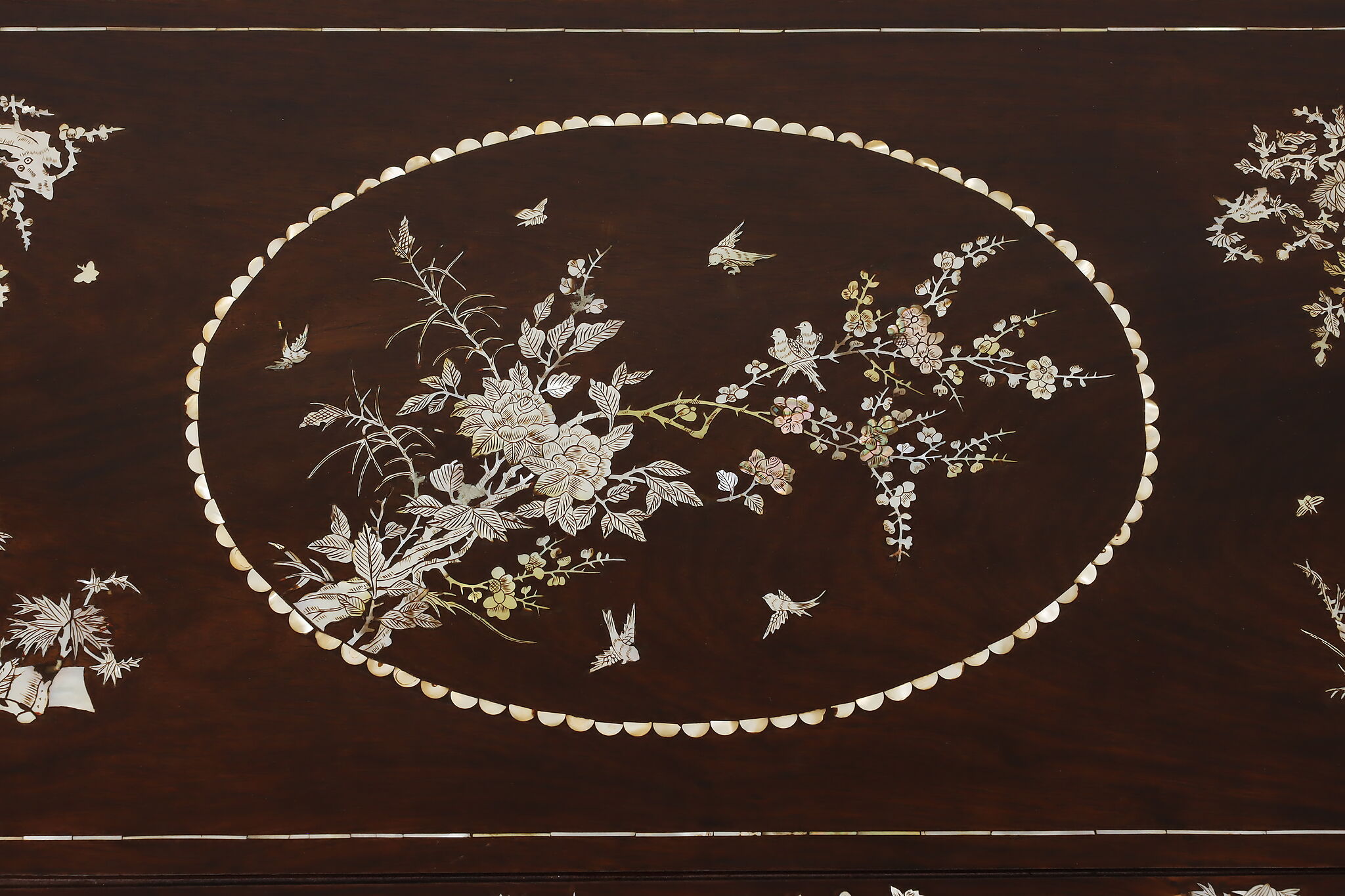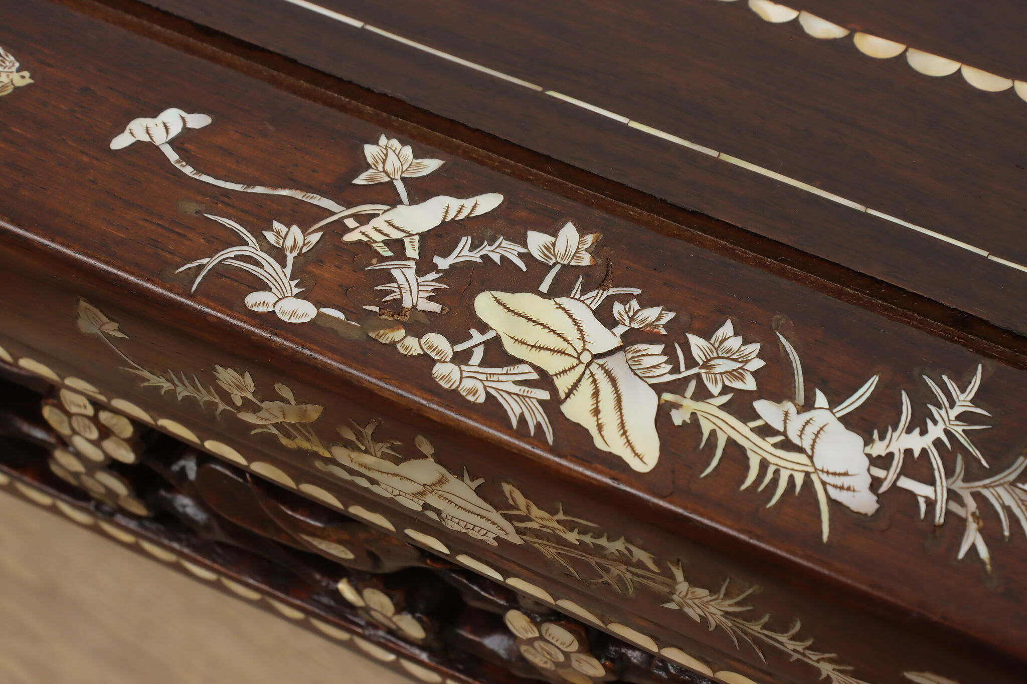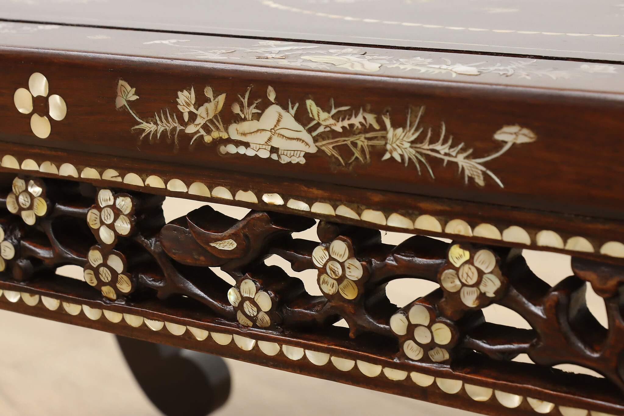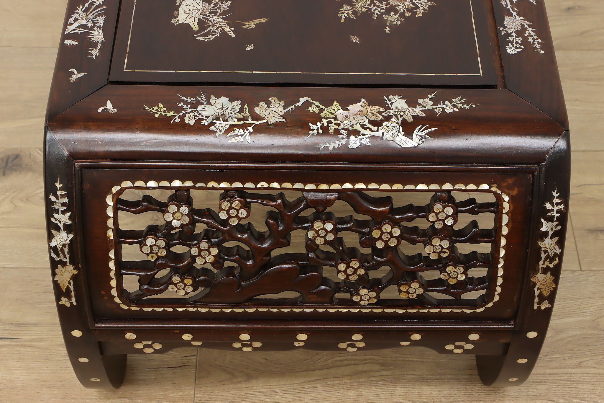 The stunning mother of pearl inlay and carved detailing on this coffee table will make it the center piece of your living room.