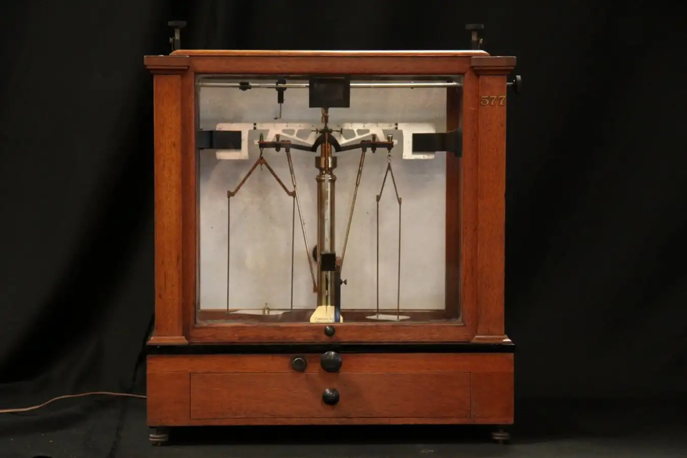 This laboratory or pharmacy scale was the height of scientific equipment in its day in the 1920's. It is signed "Christian Becker, New York, Chicago & San Francisco." The mahogany and brass case is all original, and the finish is very good with nice antique patina.