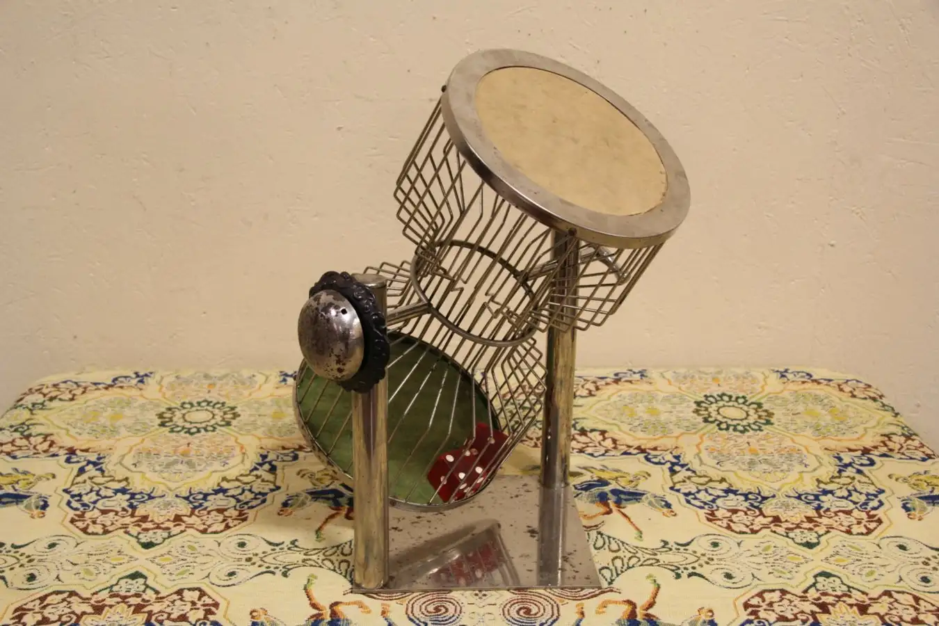 Often called a "Chuck A Luck" gambling game, this nickel cage shaker has 2 red dice inside and a bell. Dating from the earlier 1900's.