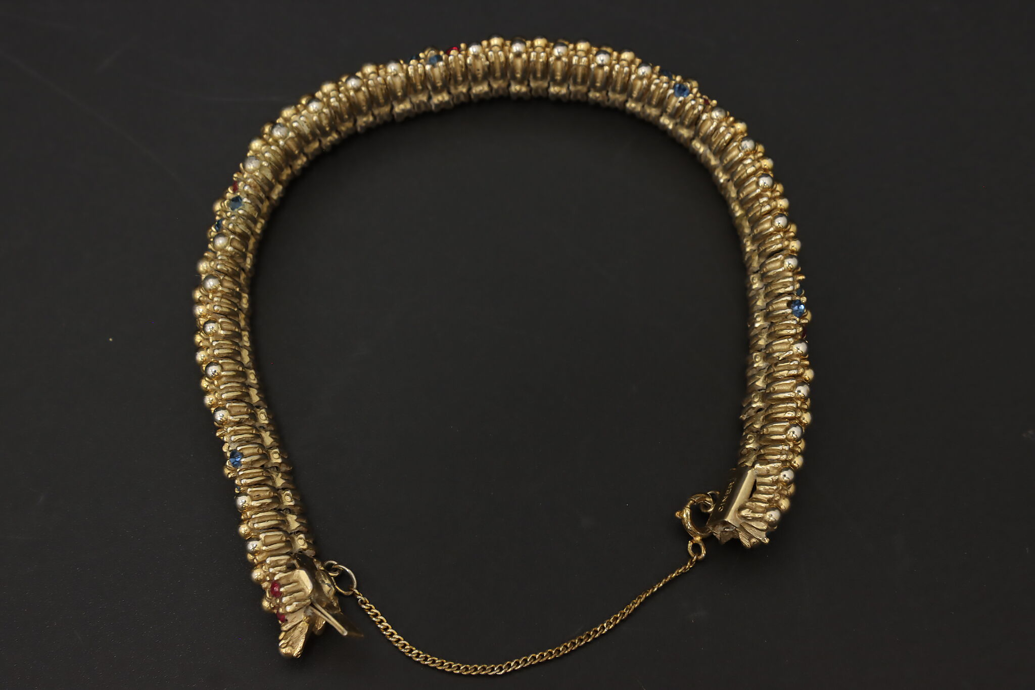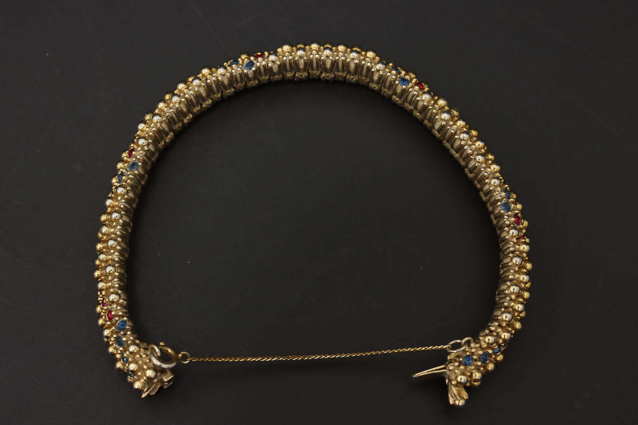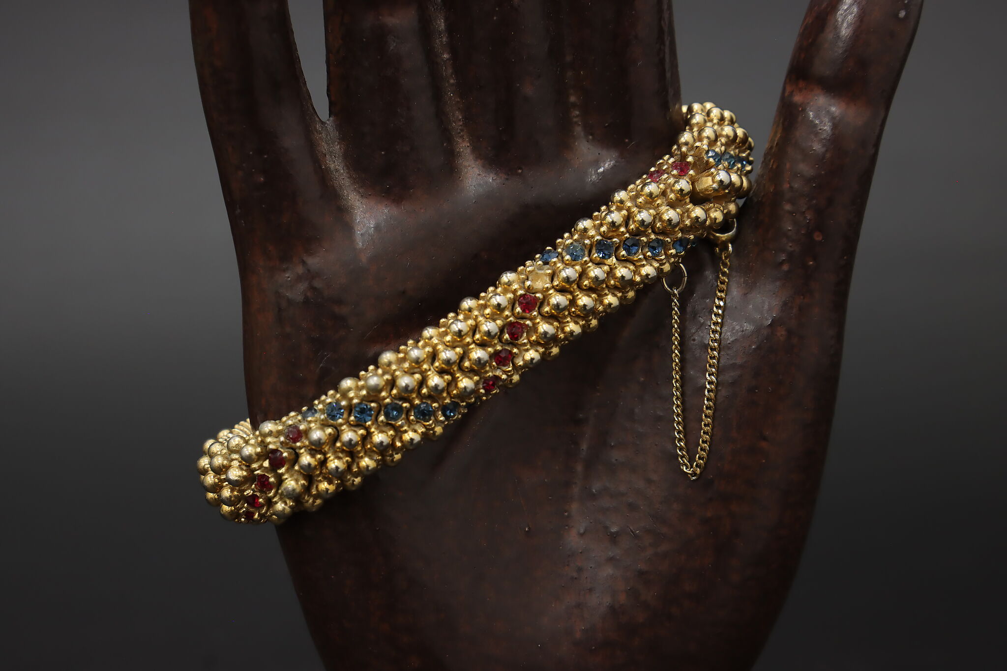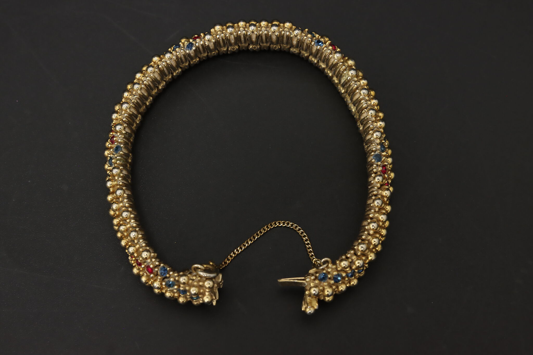 Bold vintage statement bracelet by Ciner featuring richly textured gold tone metal with raised bead detailing and inset red and blue rhinestones.