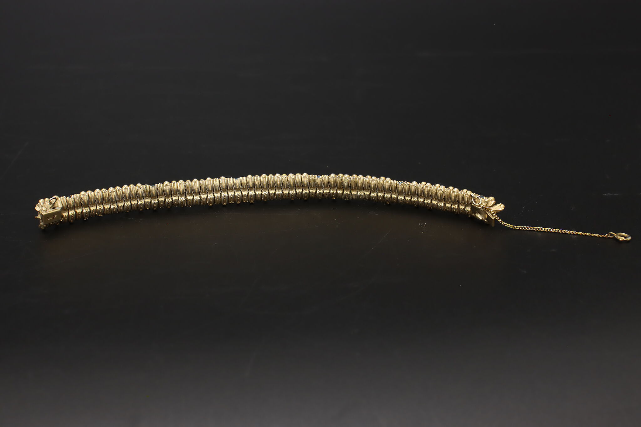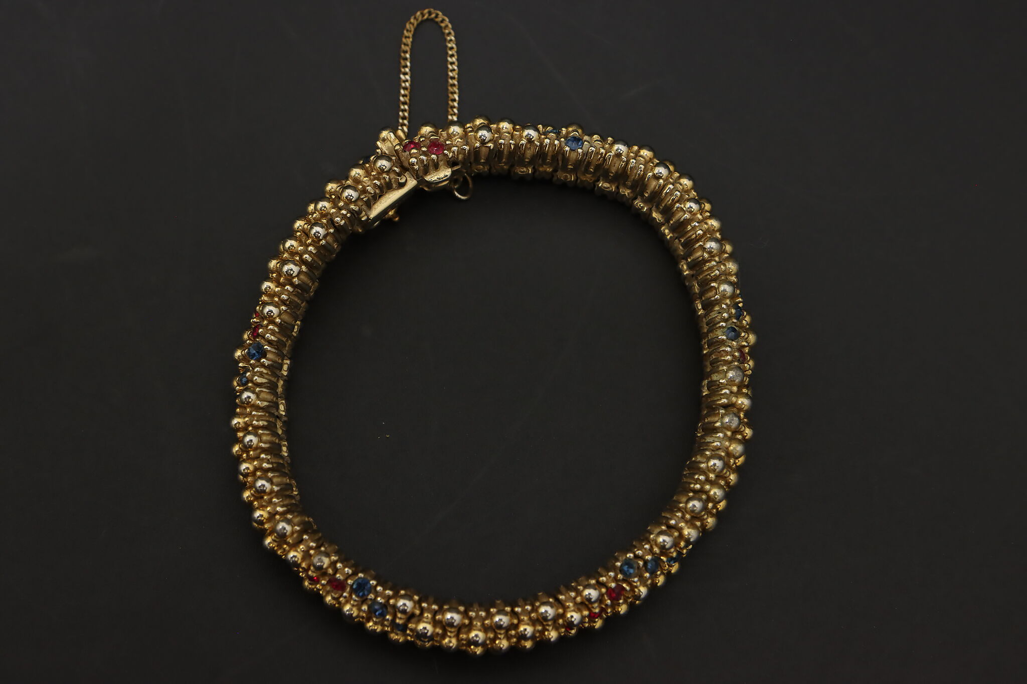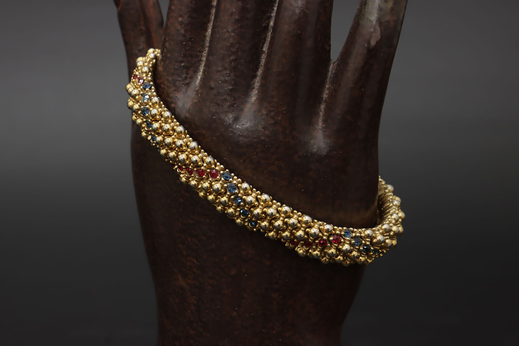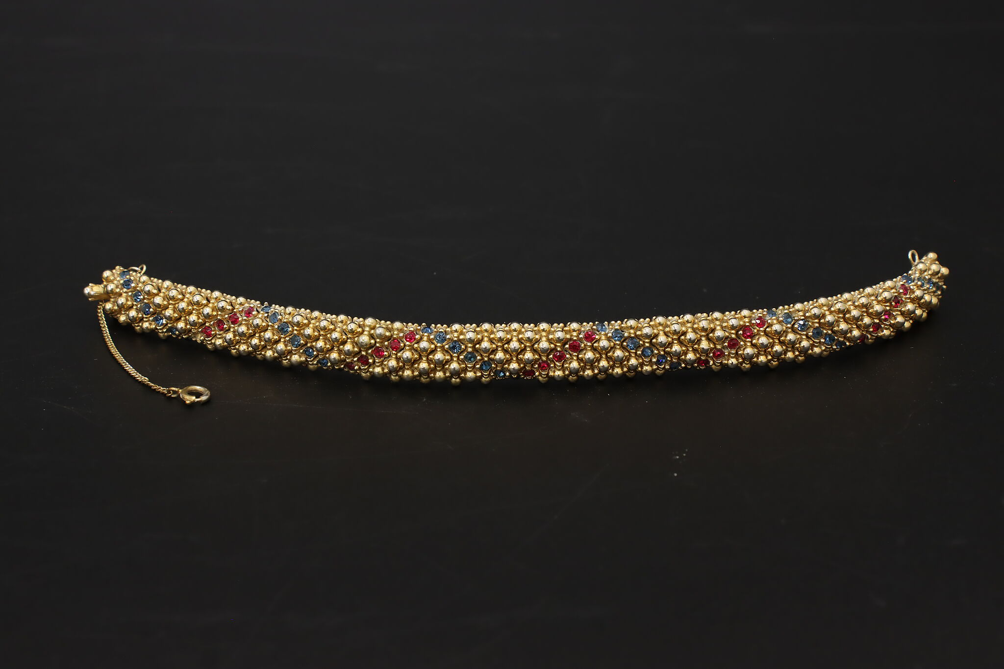 Bold vintage statement bracelet by Ciner featuring richly textured gold tone metal with raised bead detailing and inset red and blue rhinestones.