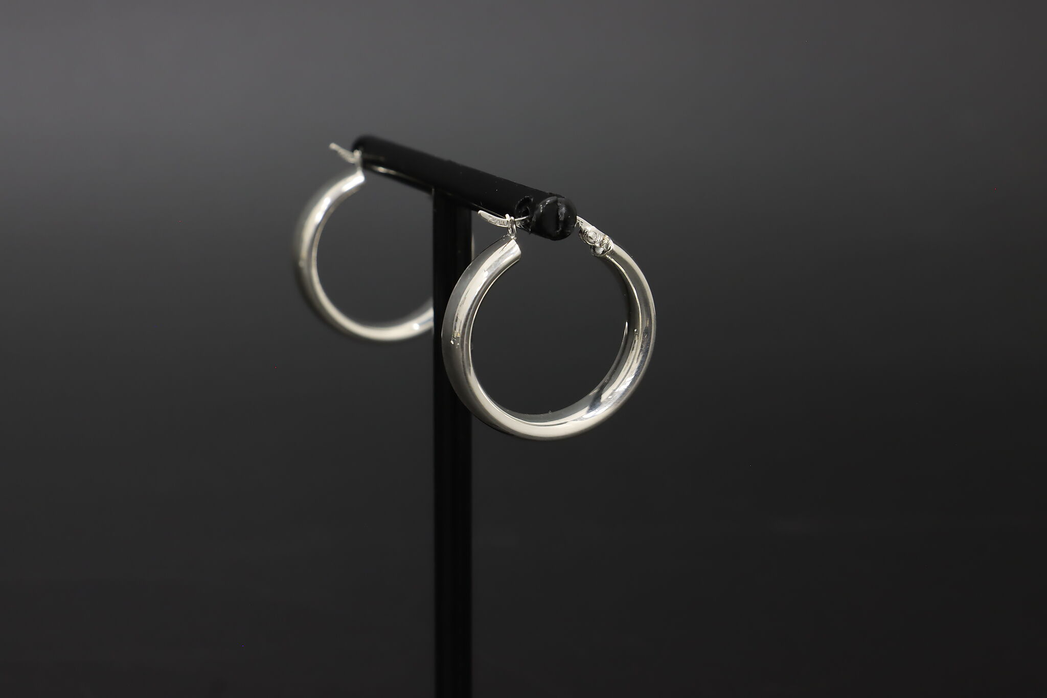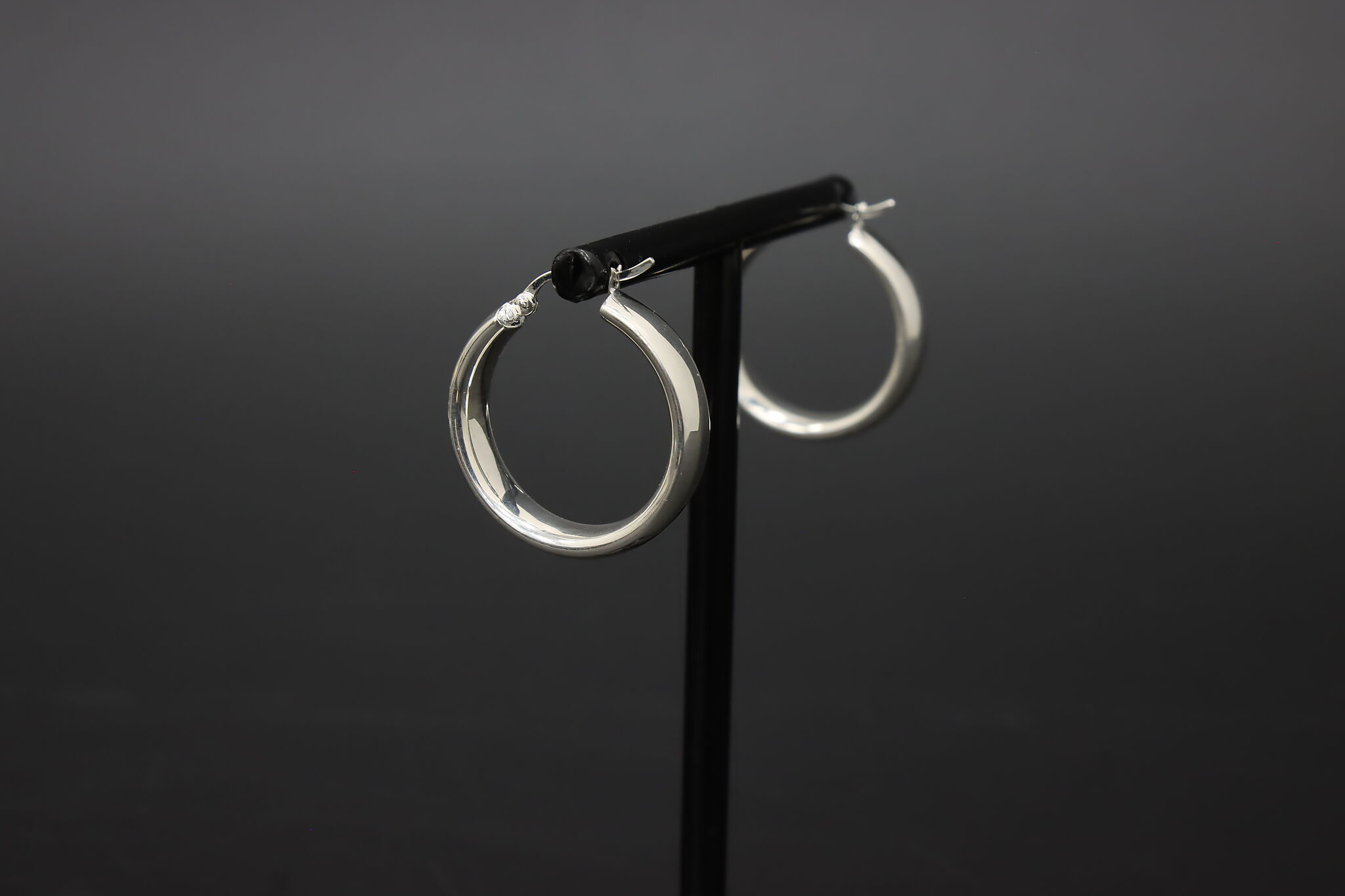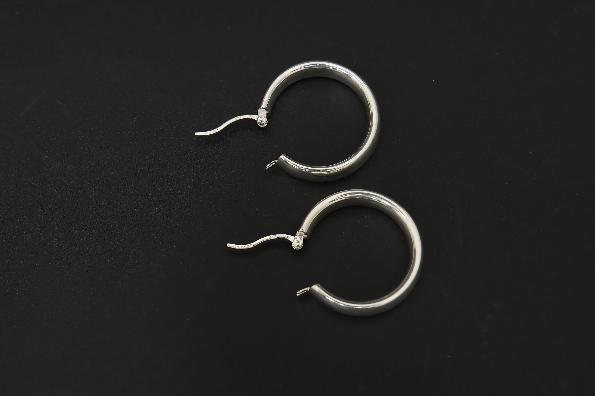 Classic sterling silver hoop earrings featuring a smooth, polished finish and a gently rounded profile for a clean, timeless look.