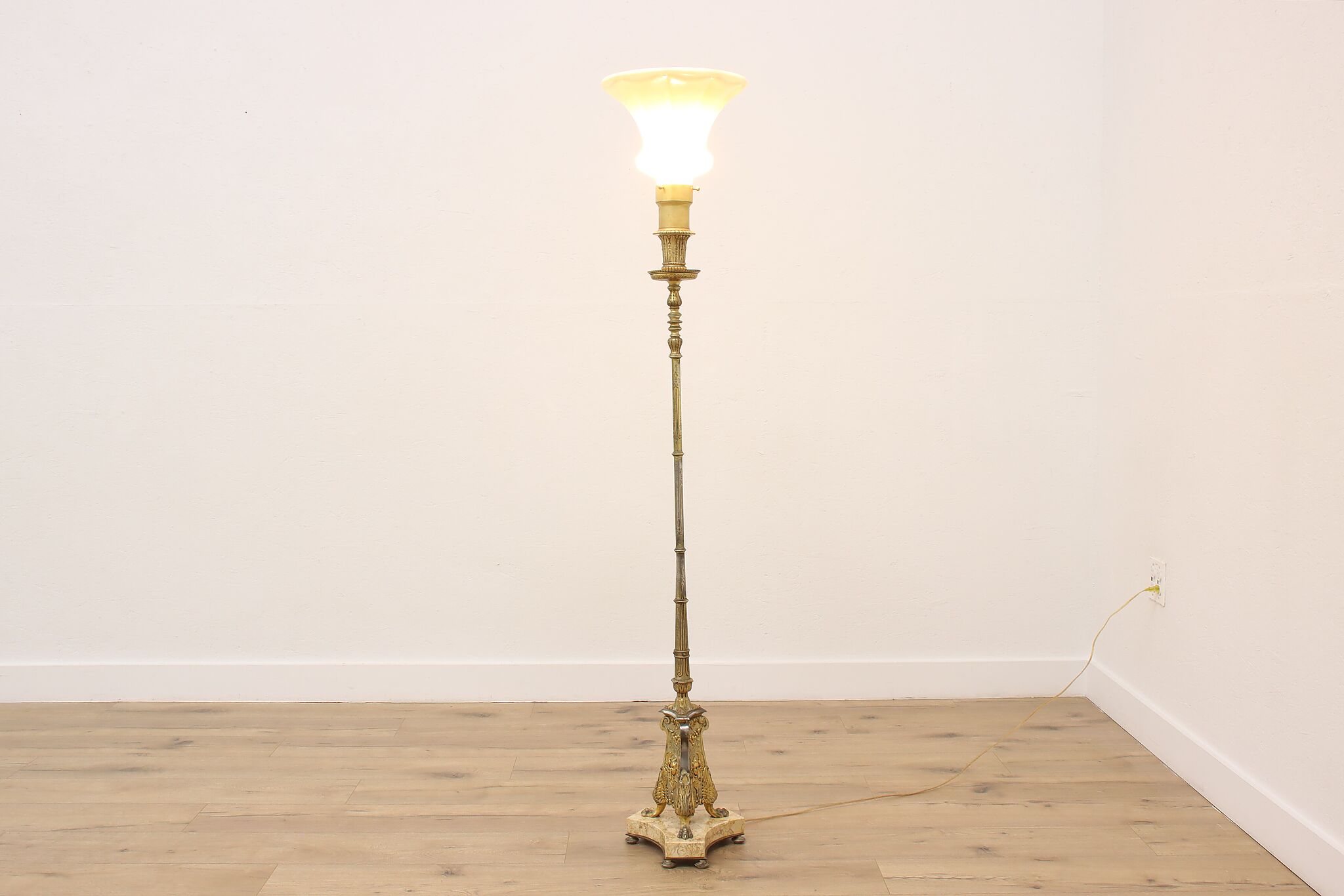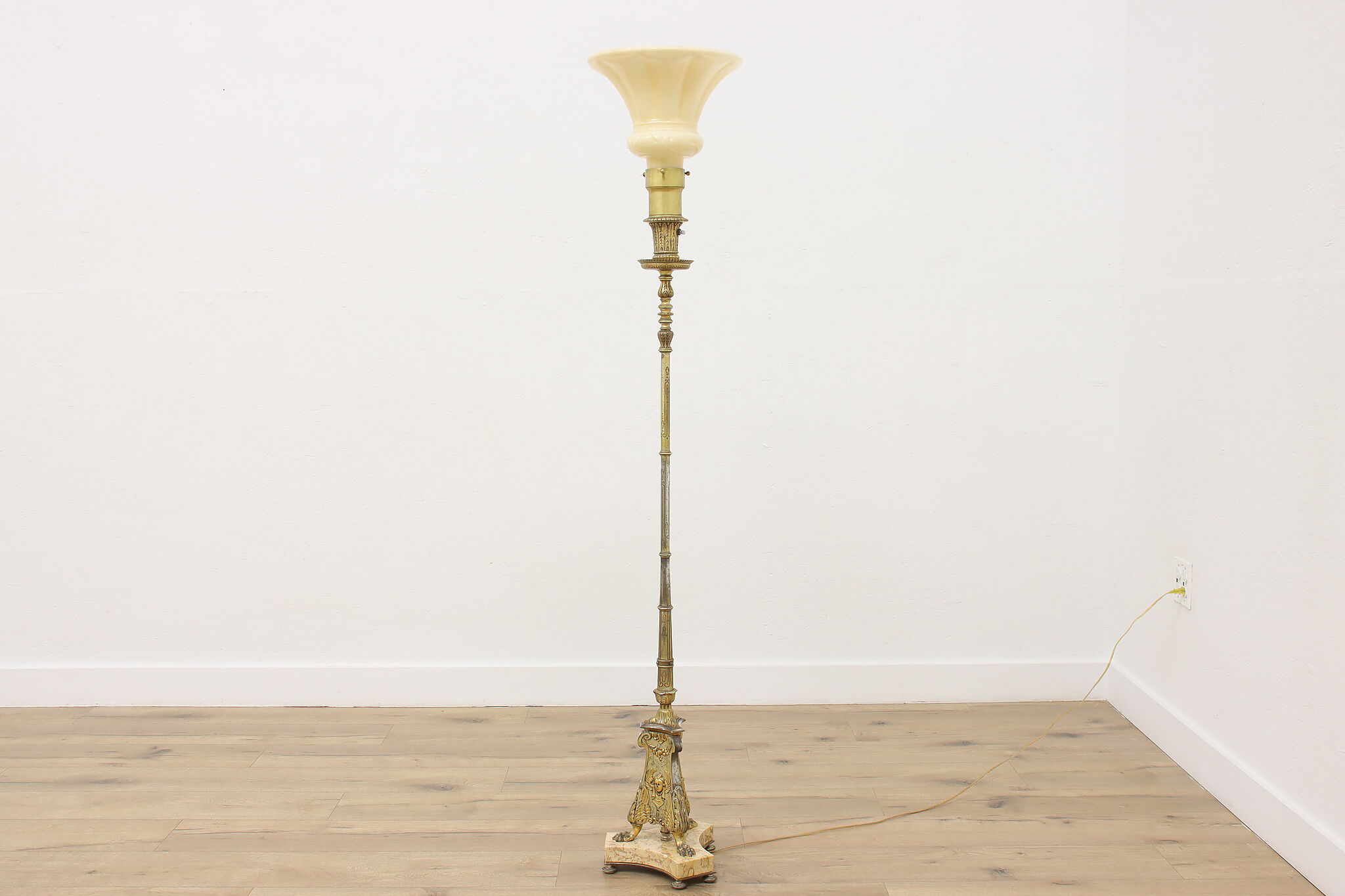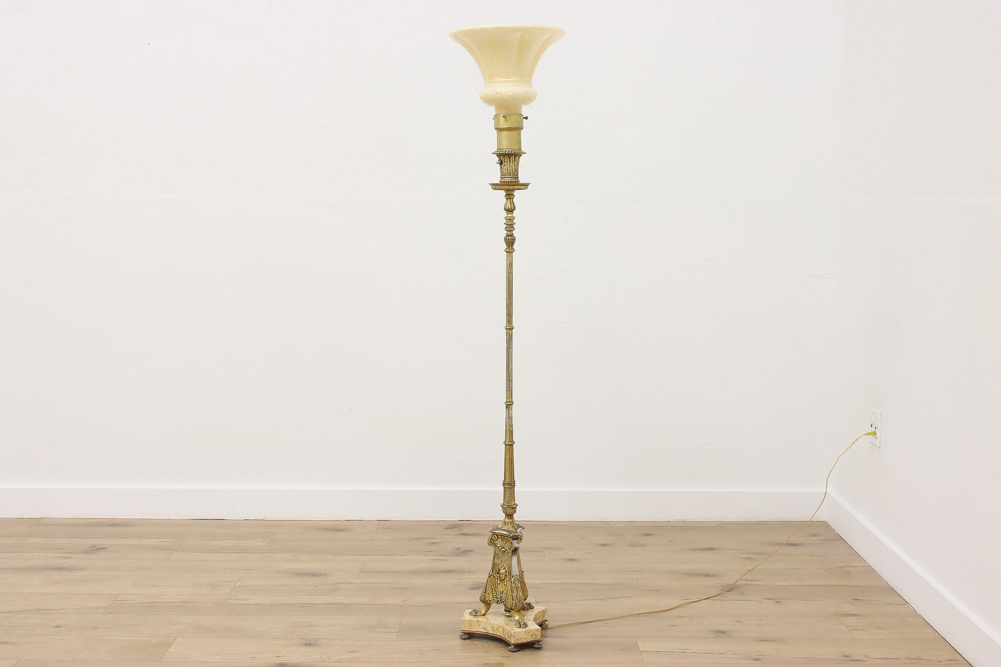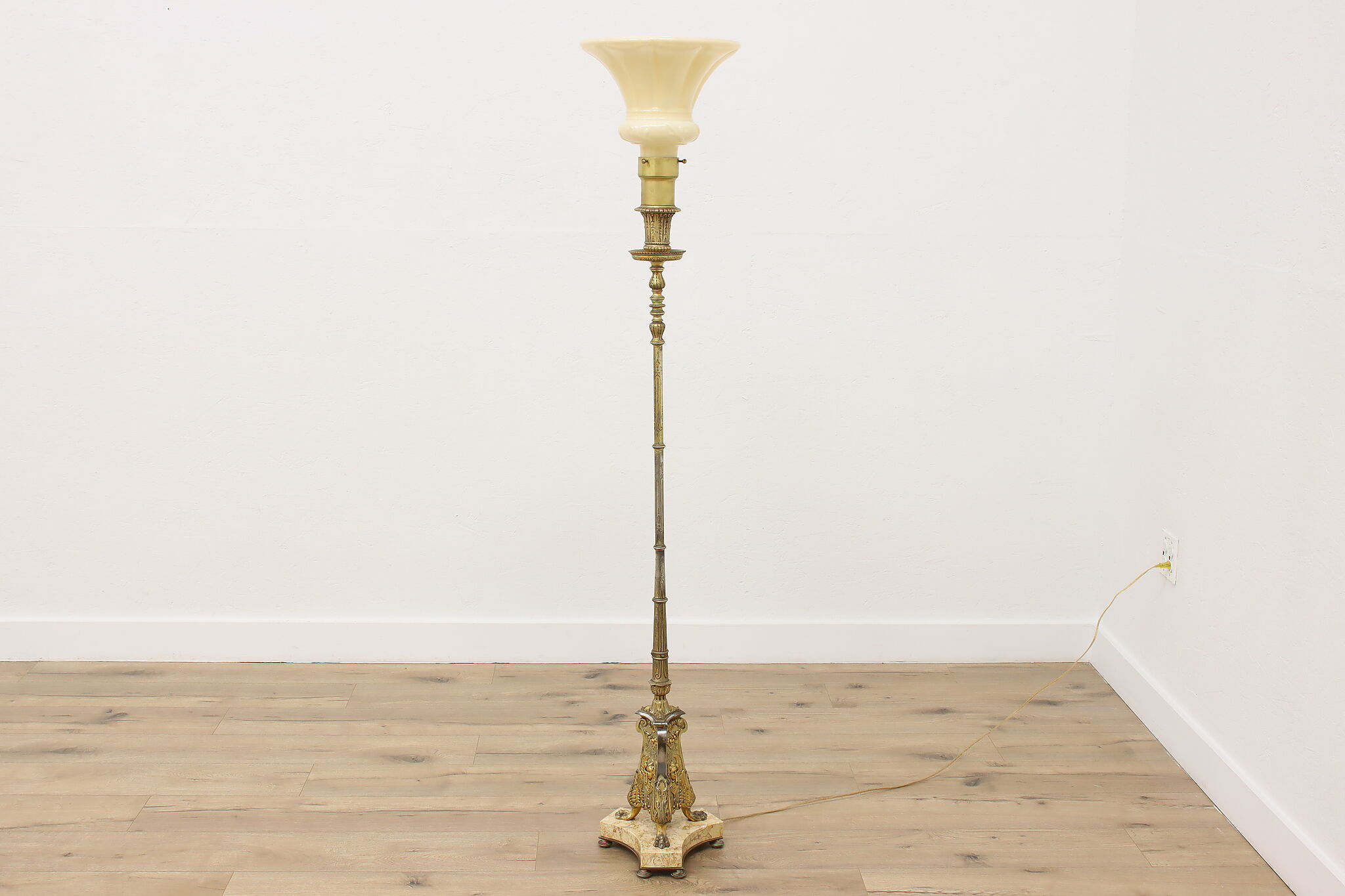 This classical design torchiere floor lamp will be an elegant addition to a living room or library.