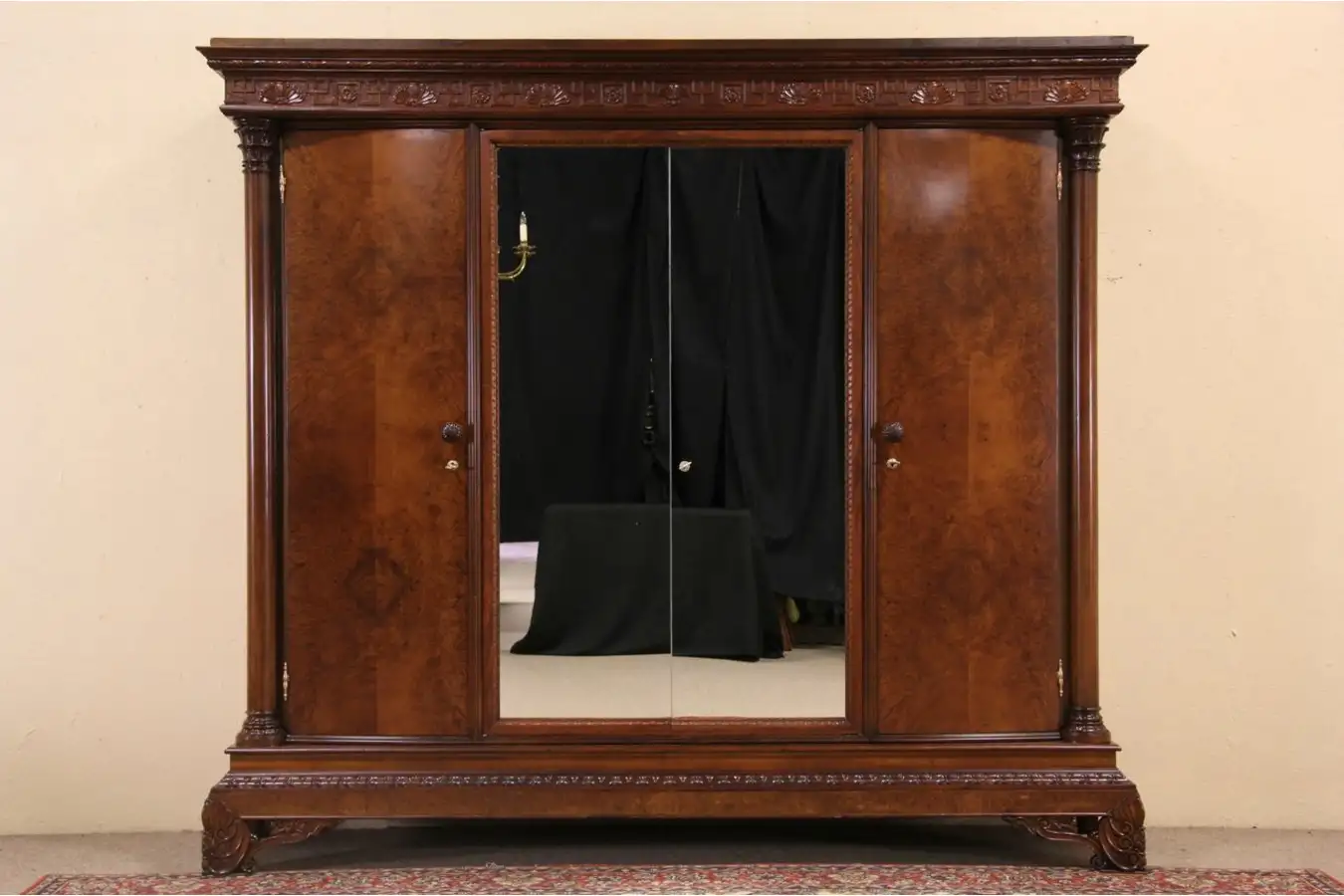 This historic European furniture is walnut with matched burl panels. The carved details are artistic, deep molding and columns with carved capitals are beautiful. Center doors are mirrored, locks and keys work. Separate sections have removable closet poles and shelves, they could be reconfigured as desired. Curved front and sides are graceful, there is a scent of mothballs inside.