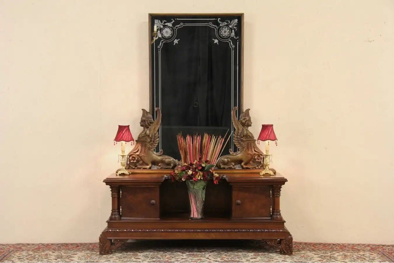 An original reverse etched mirror has a little antique "smoke" to show its age, supported by winged sphinxes in a dark bronze tone.