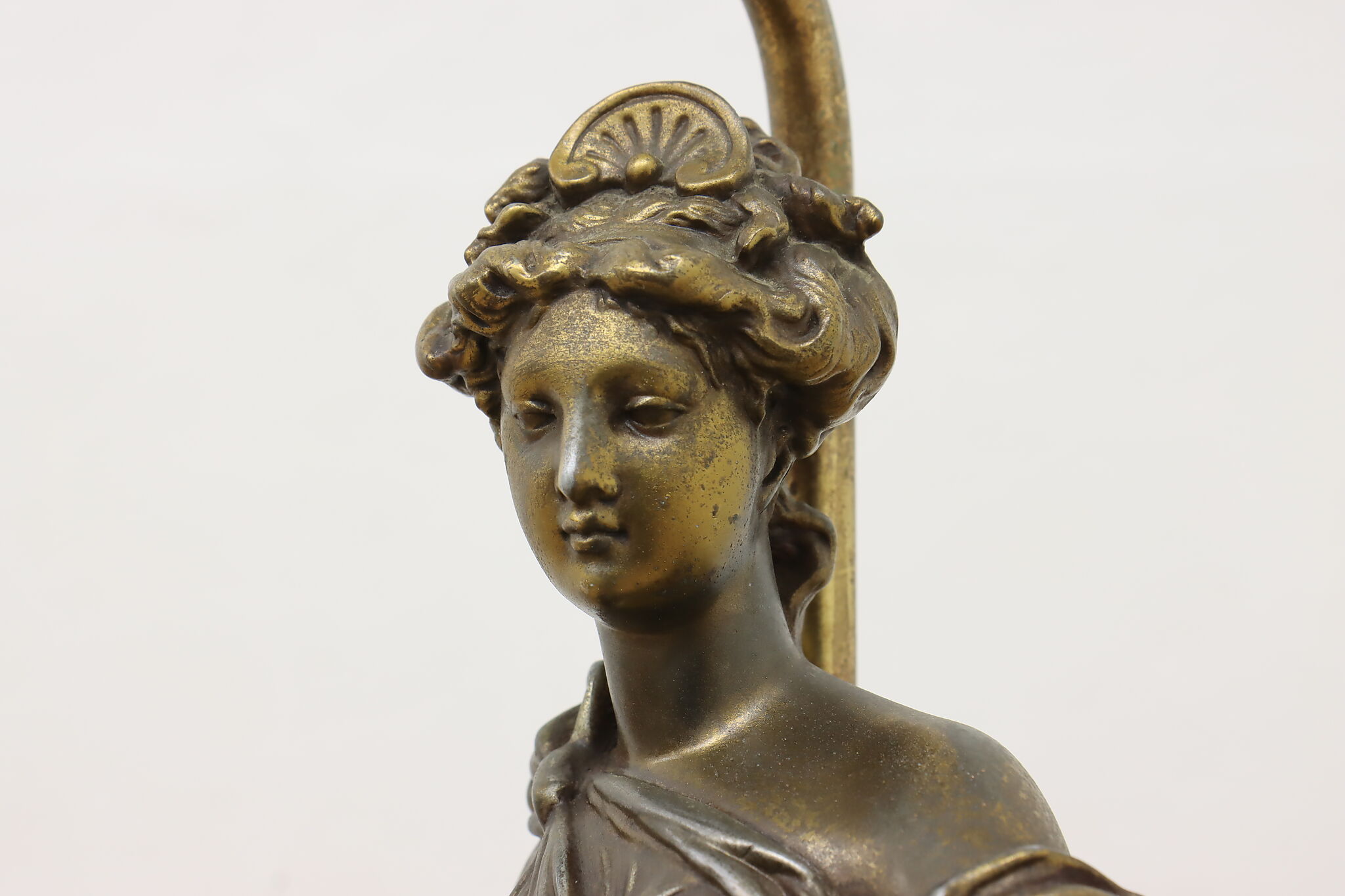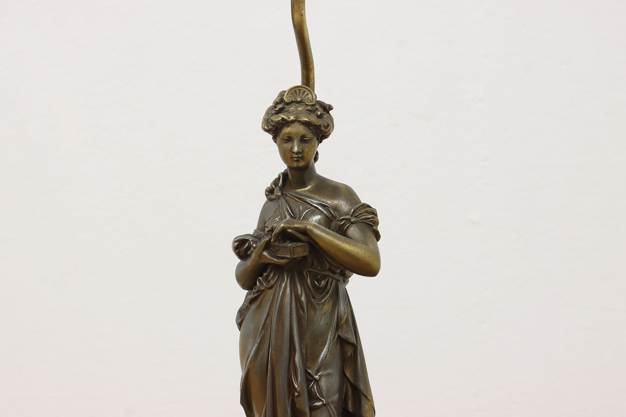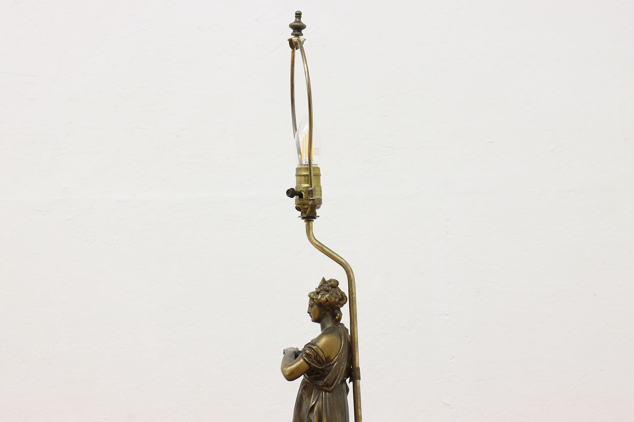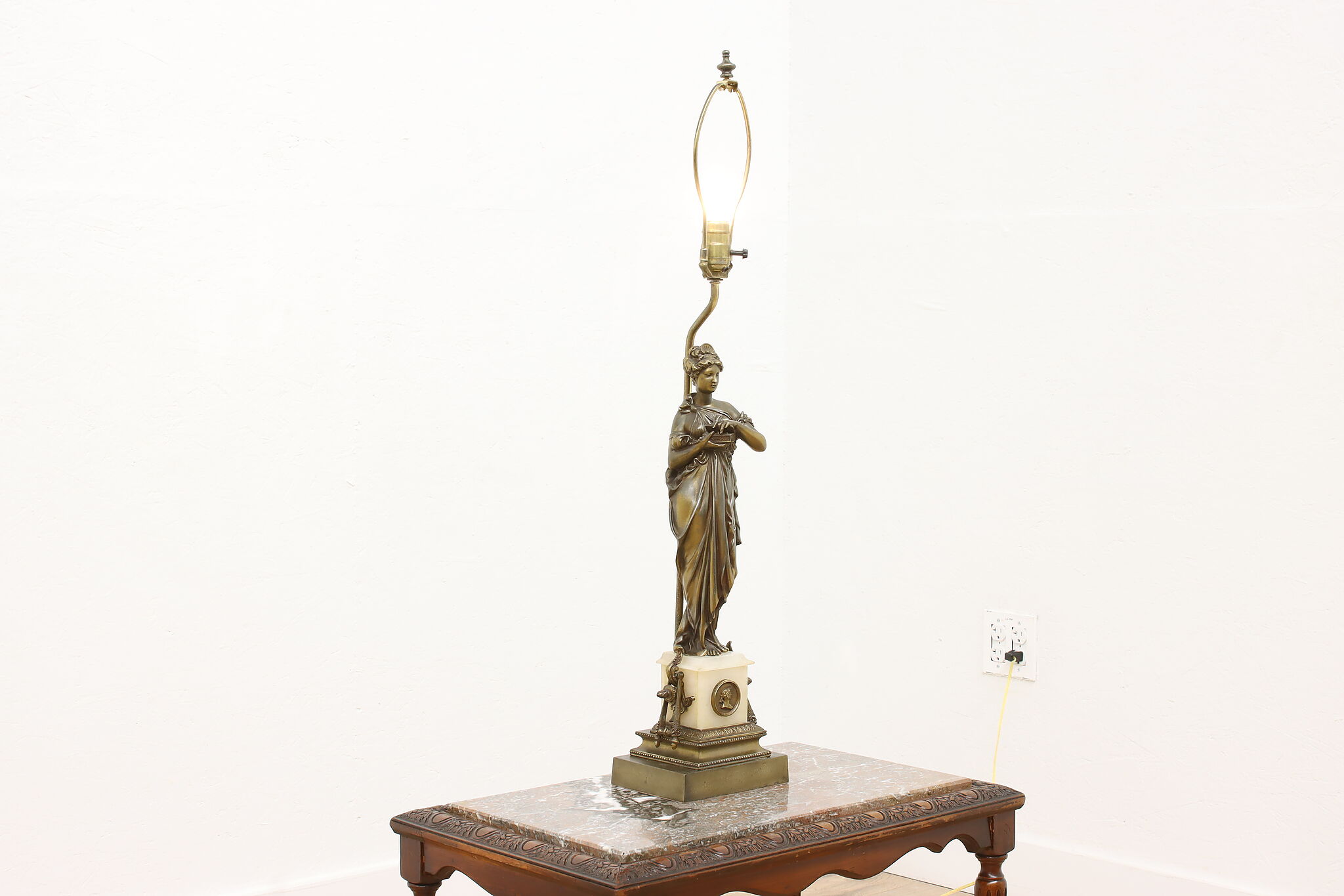 This classical design table or desk lamp has a gorgeous sculpture of a Greek woman, who we believe may be the Greek woman, Pandora, and her infamous box.