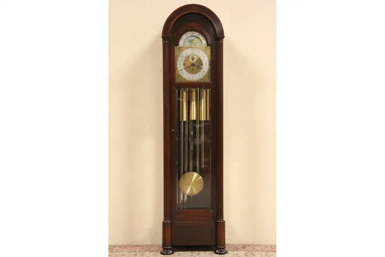 Founded 1810 in the Black Forest of southwest Germany, they were among the finest Victorian clockmakers of the day, according to Wikipedia, and went out of business in 1933. Brass pendulum and weights are original, the chime tubes are nickel. The intricate dial has gold plated filigree and numerals, the moon dial is hand painted.