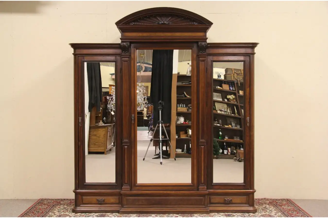 Doors of this triple armoire open to make a triple dressing mirror on this ingenious classical antique furniture from about 1890.
