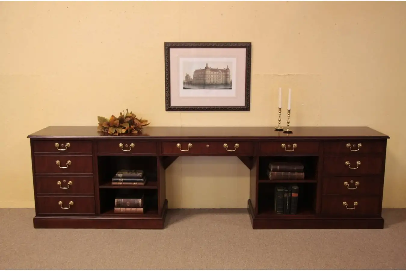 About 25 years old, the finish is excellent with only very minor wear at the edges. Absolutely top line executive furniture, size is 9'4" long, 18 1/2" deep and 30" tall. There is a kneehole 30" wide and 24" tall.