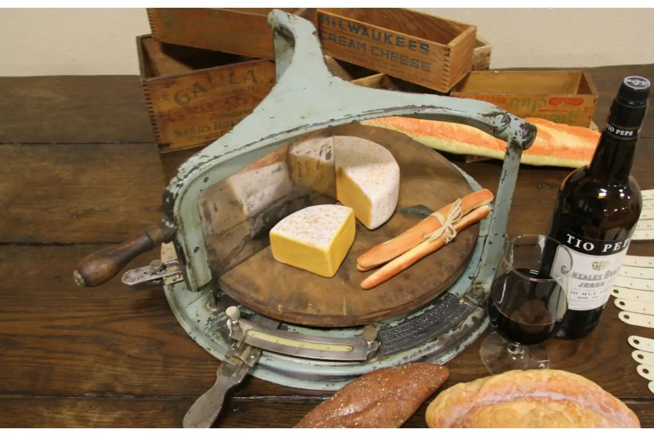 A remarkable cheese wheel cutter has a mechanism to calculate the weight and price of a wedge of cheese, and is signed "Computing Scale Co., Dayton, Ohio" with the latest patent date of "May 12, 1903."