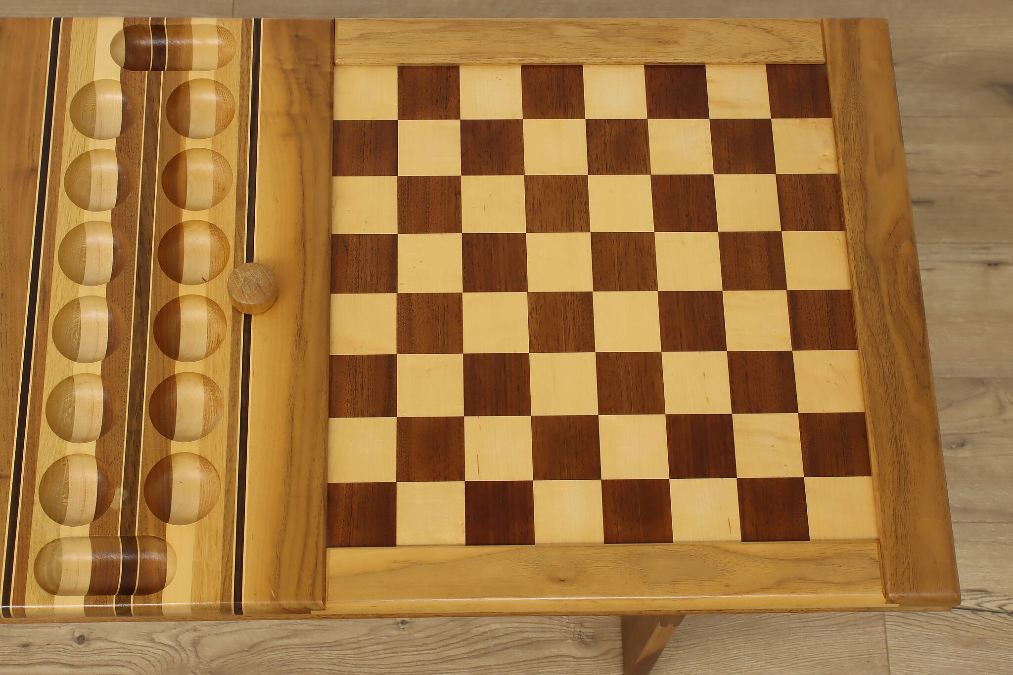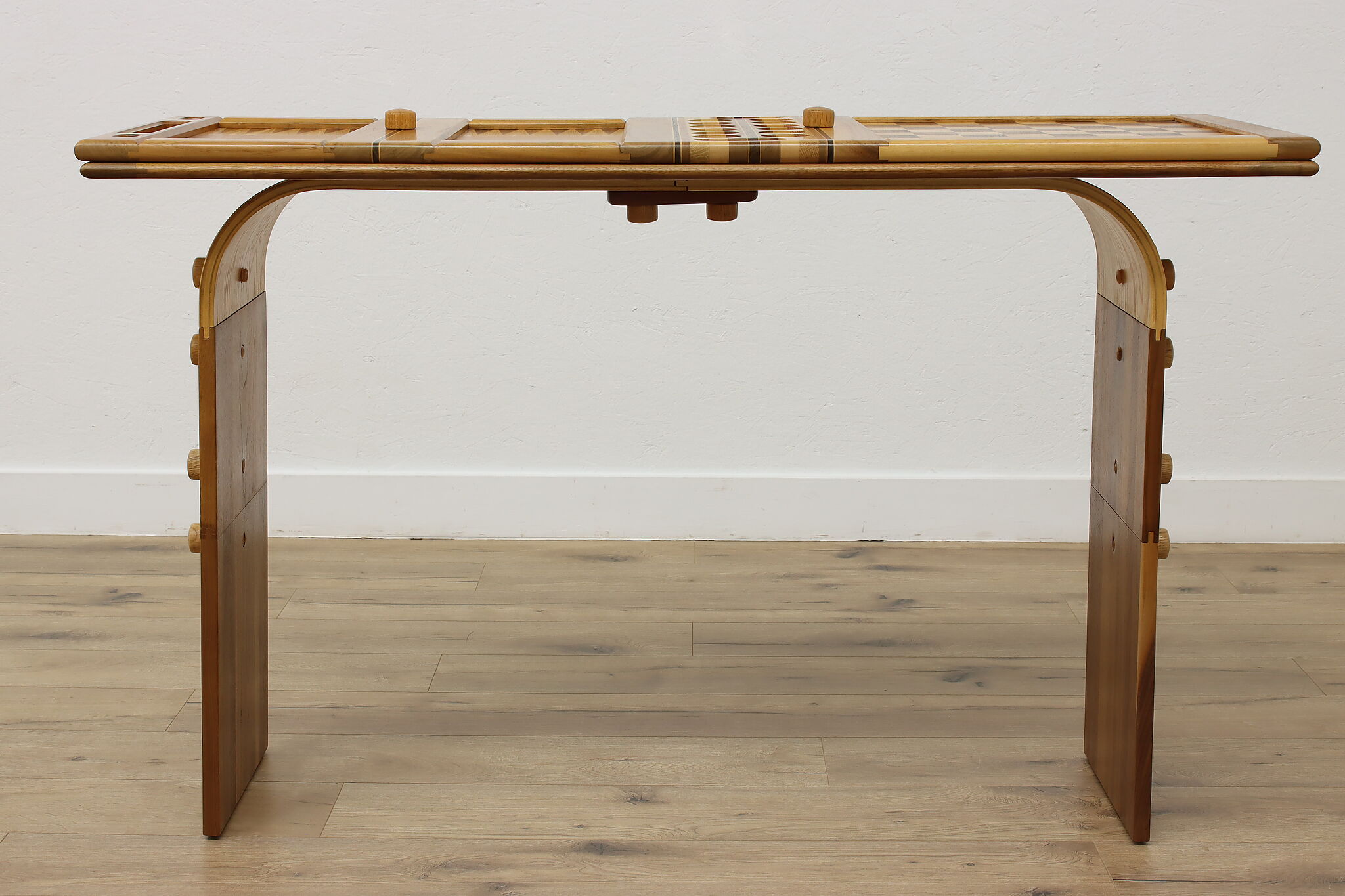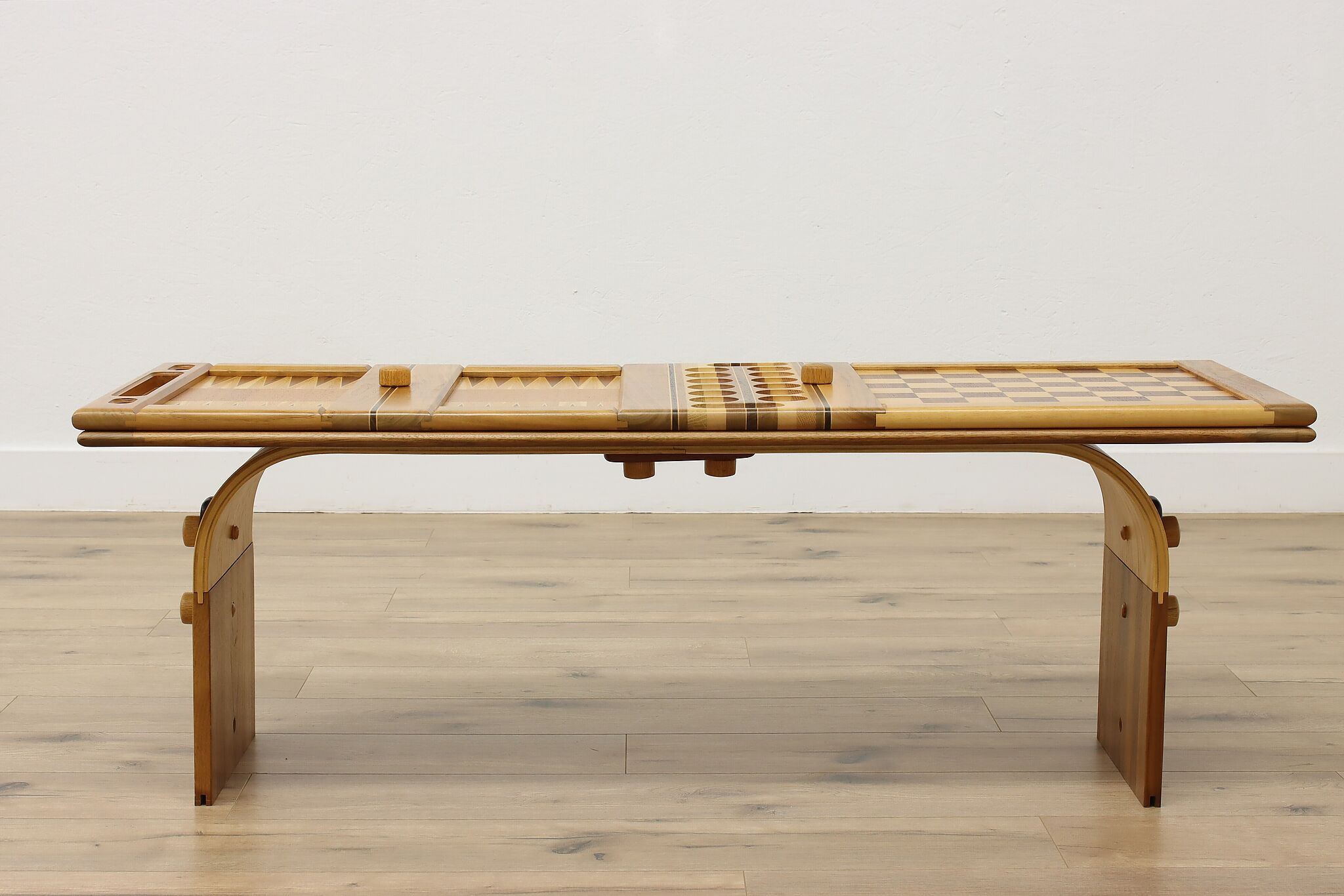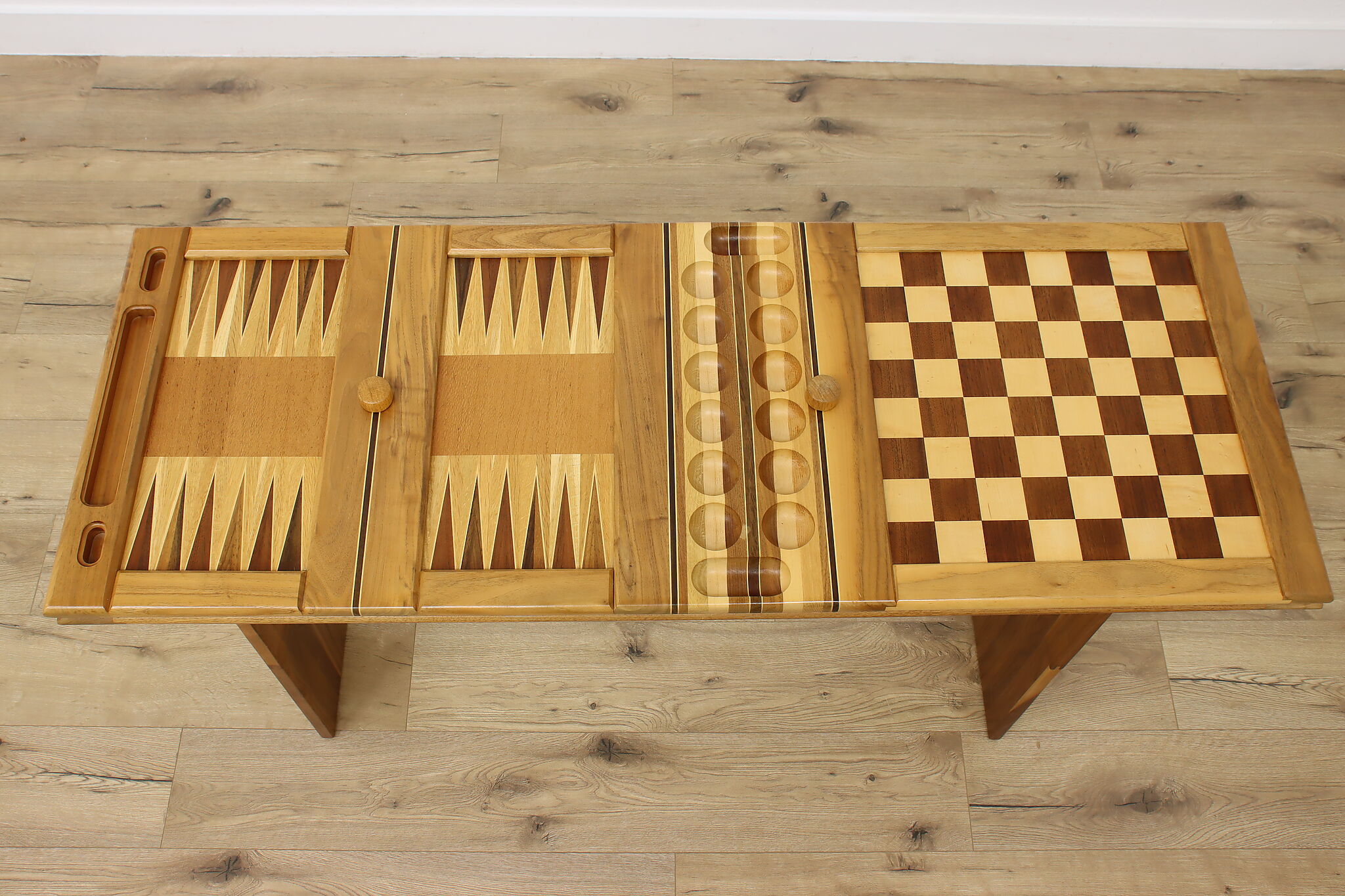 This gorgeously handcrafted coffee table flips to a game table with boards for chess, checkers, backgammon, and mancala, and can be raised for playing at table height.