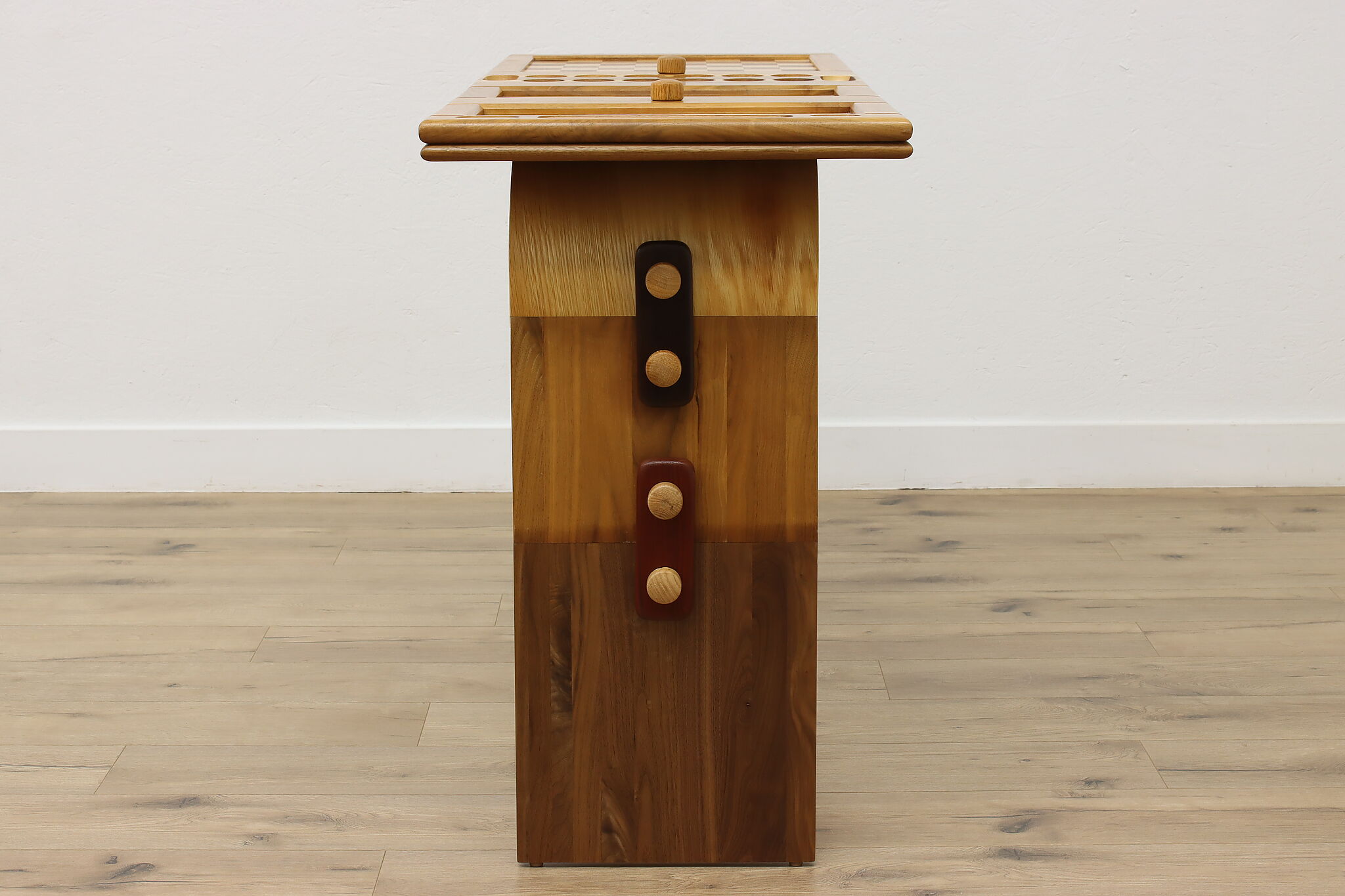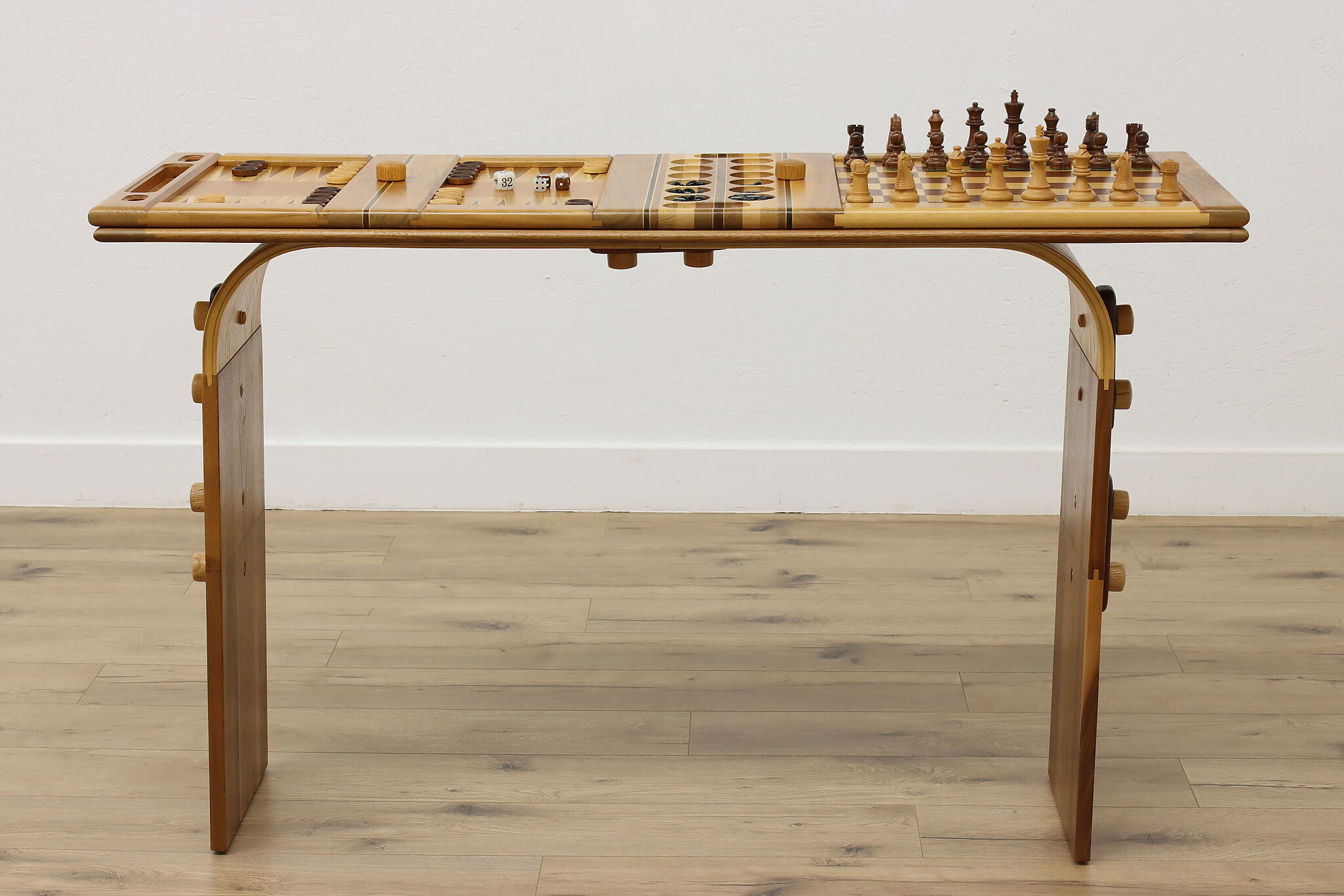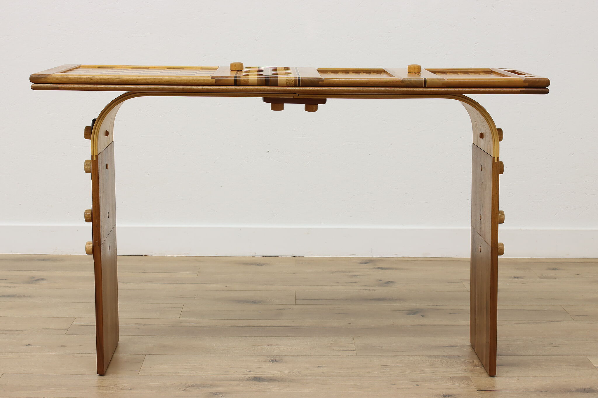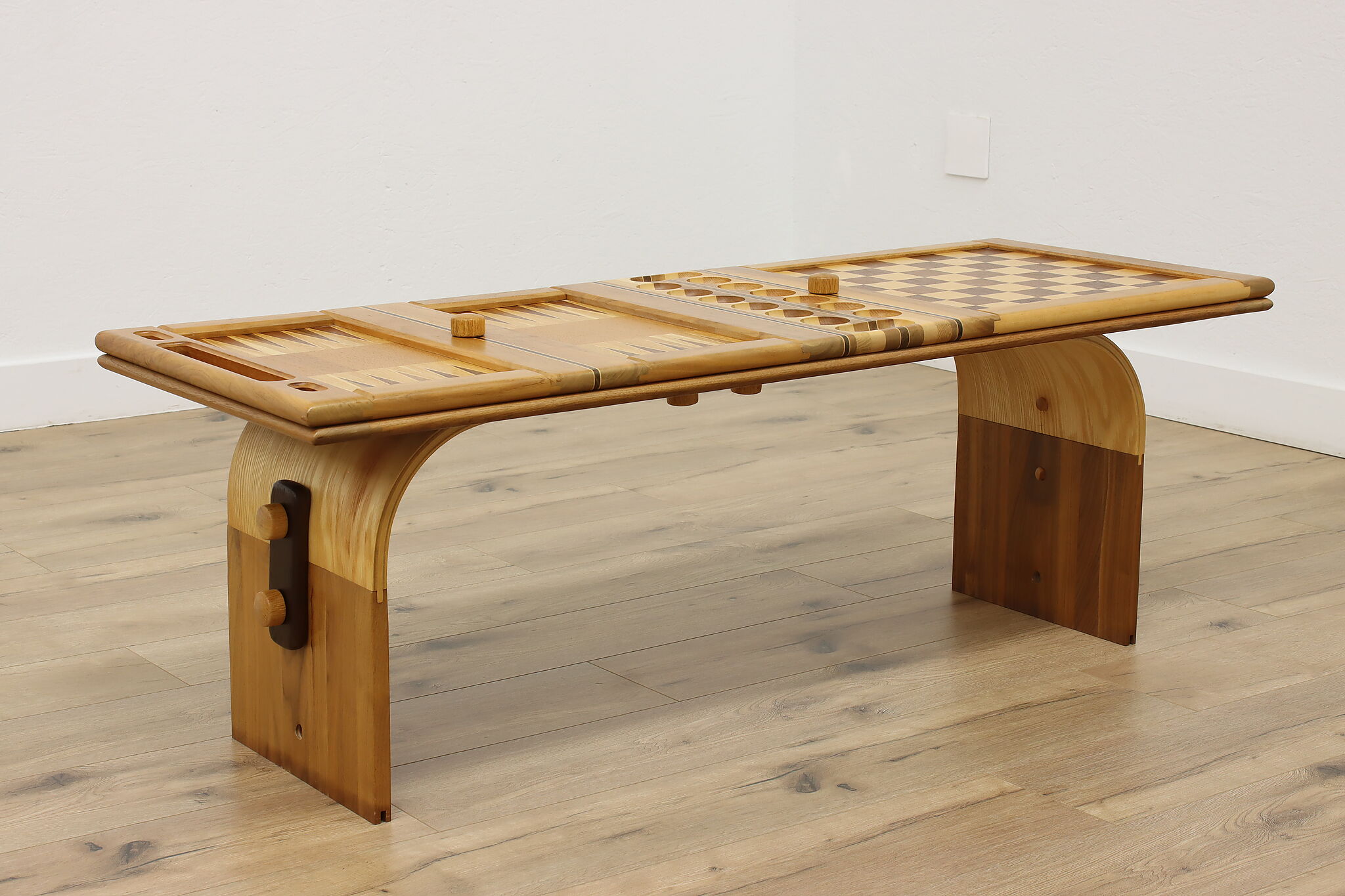 This gorgeously handcrafted coffee table flips to a game table with boards for chess, checkers, backgammon, and mancala, and can be raised for playing at table height.