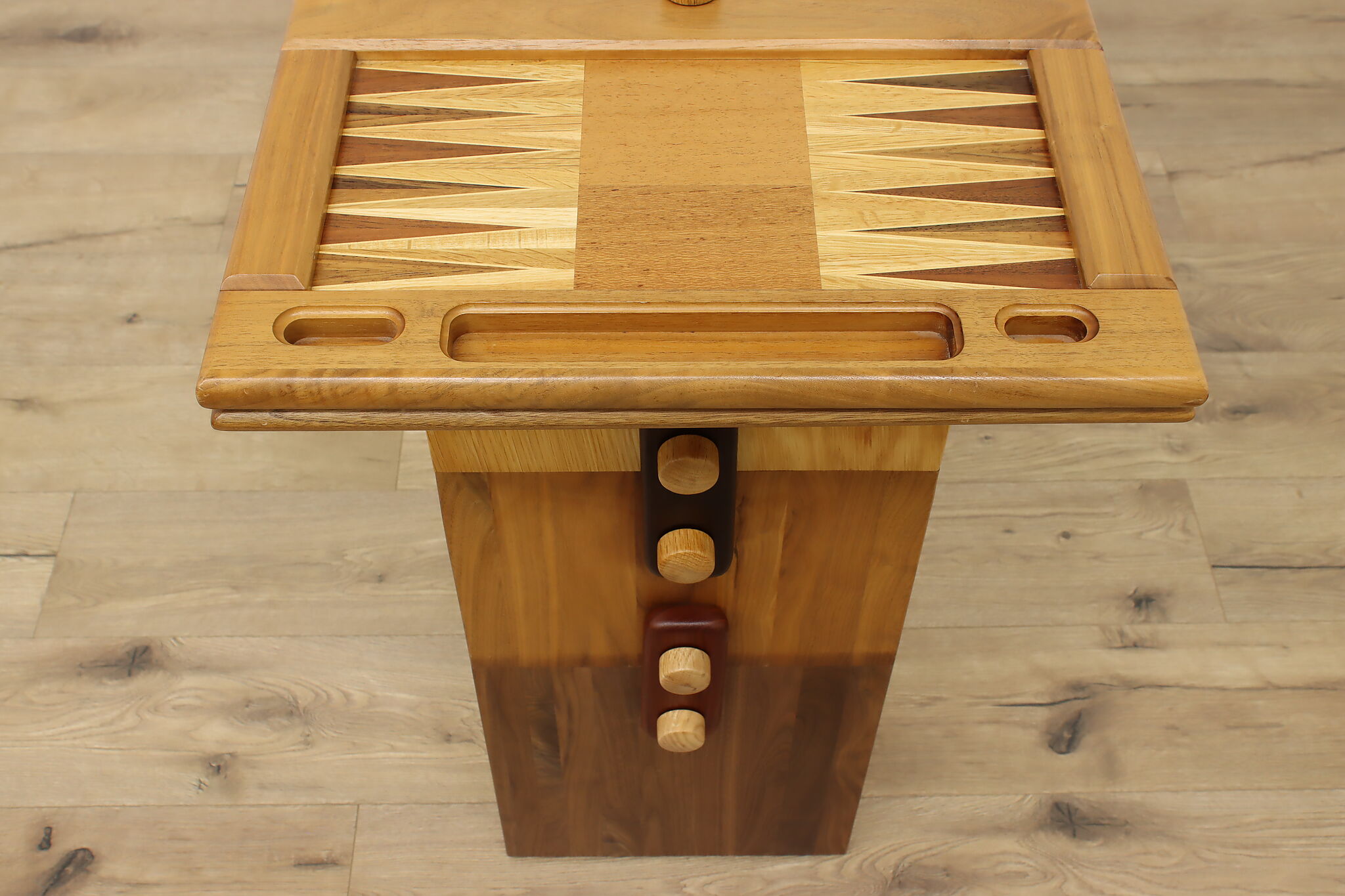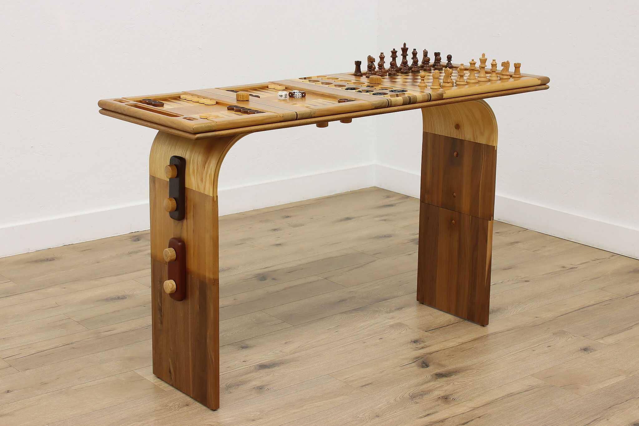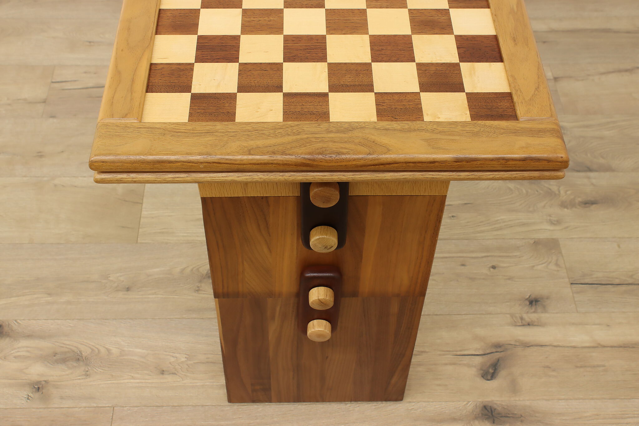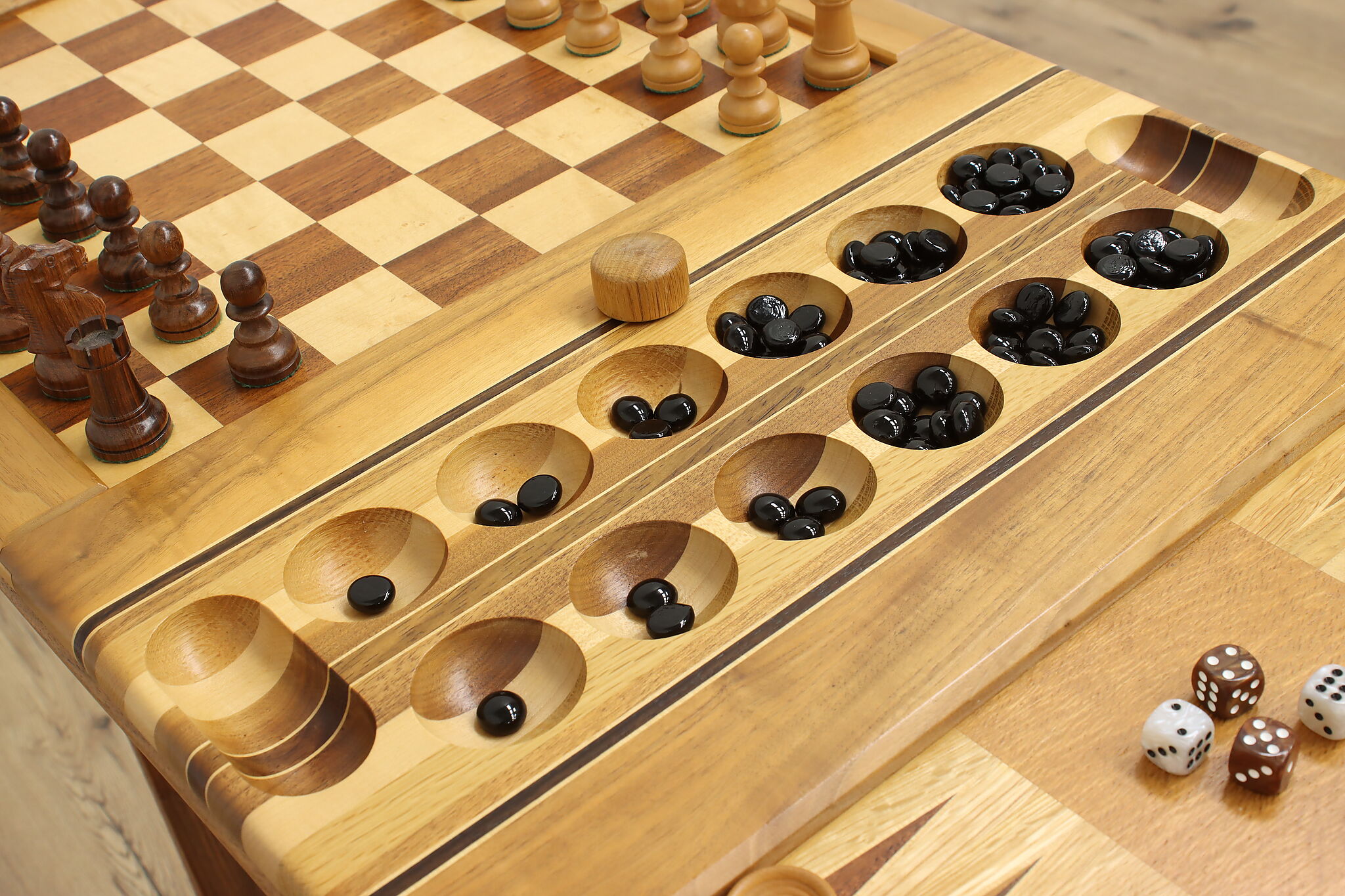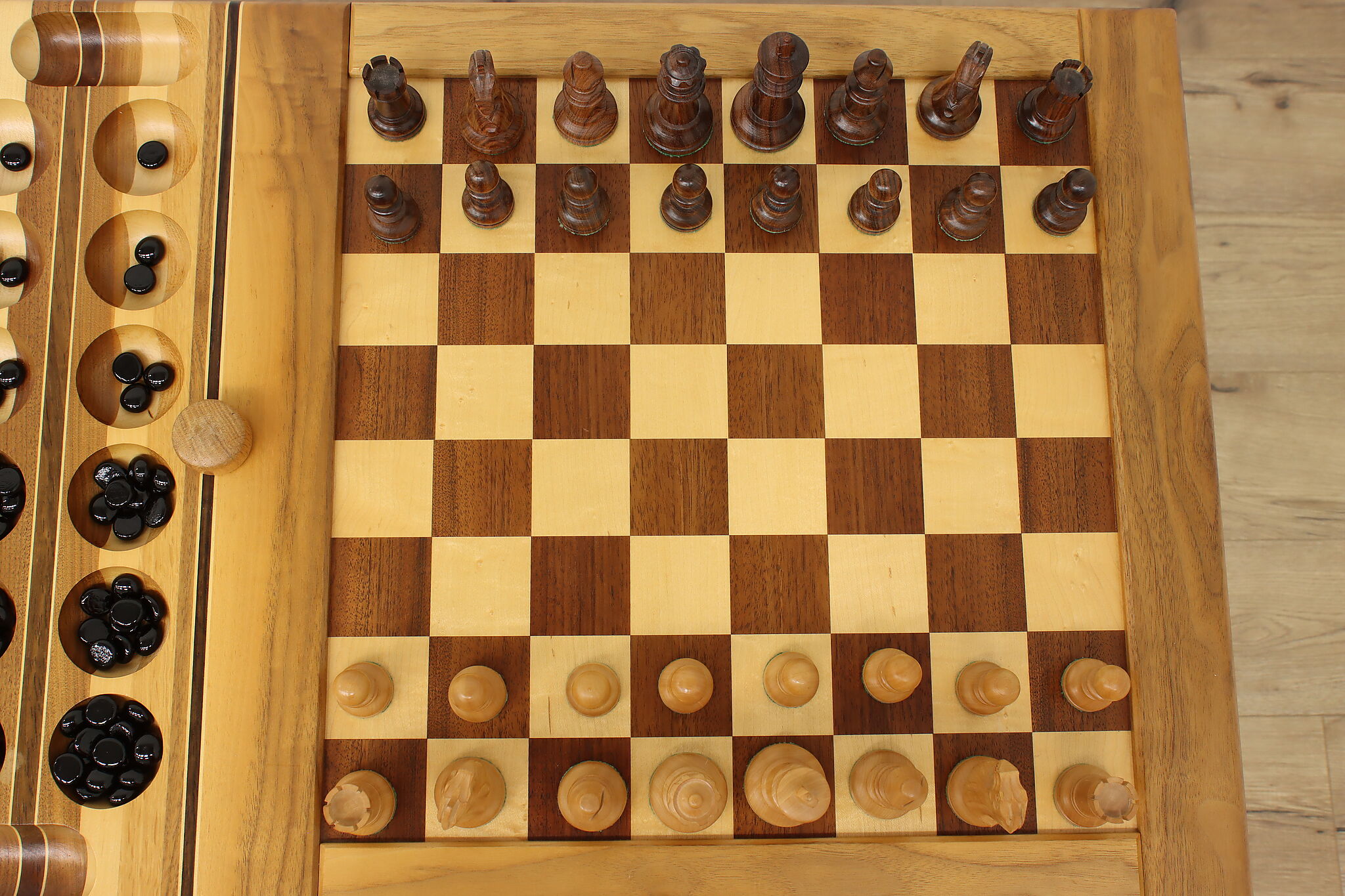 This gorgeously handcrafted coffee table flips to a game table with boards for chess, checkers, backgammon, and mancala, and can be raised for playing at table height.