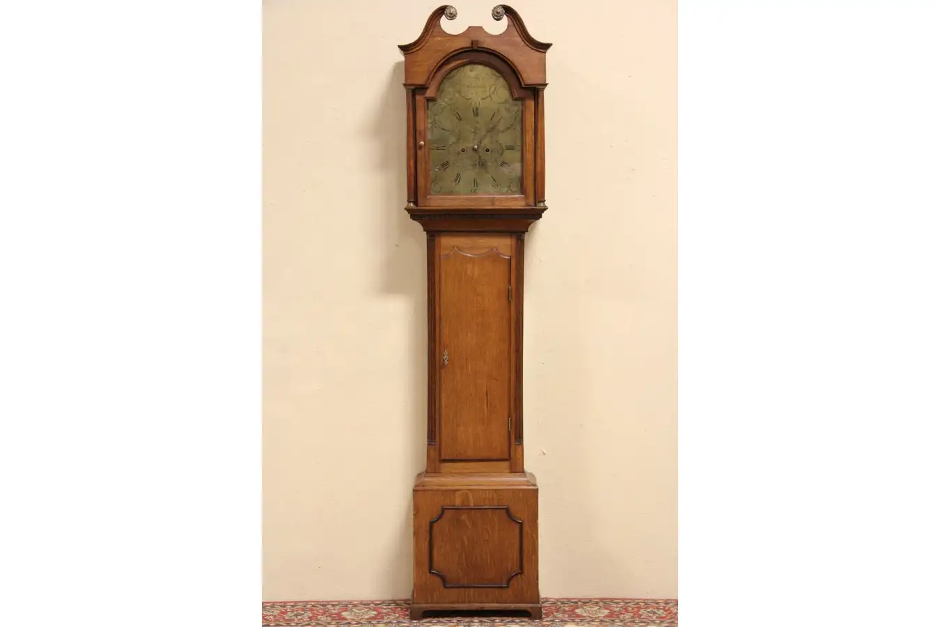 Hand crafted about 1810, an understated oak tall case or grandfather clock is signed "William Cooper, Hamilton," an ancient town southeast of Glasgow in Scotland. The fine grained oak case has a satiny finish in excellent condition, waxed and buffed, it needs only an occasional wipe with a soft dry cloth to maintain its antique luster. Brass mounts on the pediment and tapered columns with brass capitals also appear original, as does the worn hand painted pendulum.