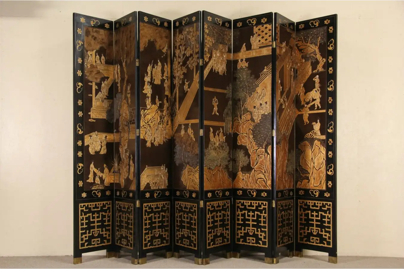 A grandly scaled Chinese 8 panel "Coromandel" screen from about 50 years ago has subtle colors against a black ground.