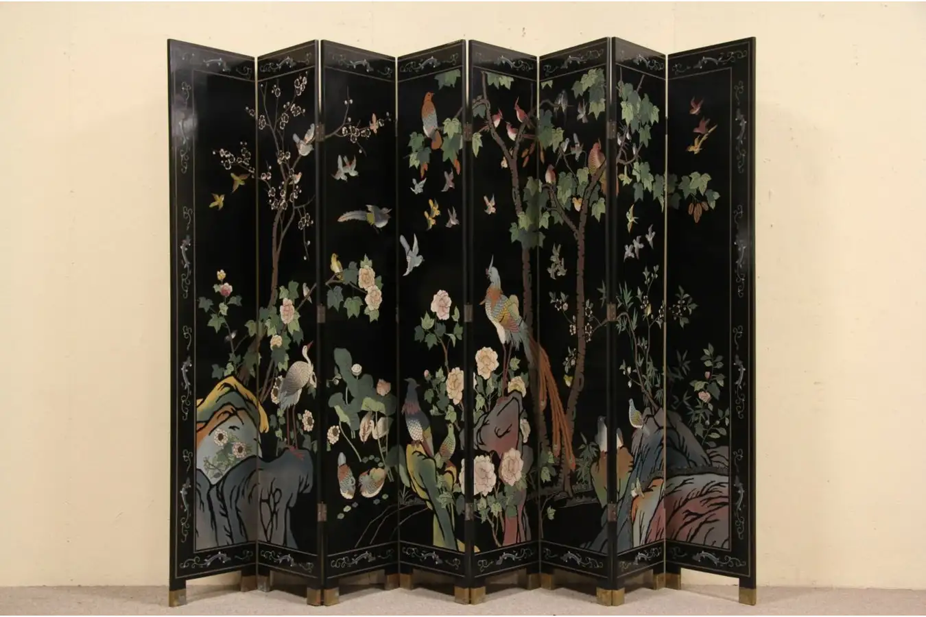 A Chinese 8 panel "Coromandel" or carved lacquer screen from about 50 years ago has subtle colors against a hand rubbed satin black background.