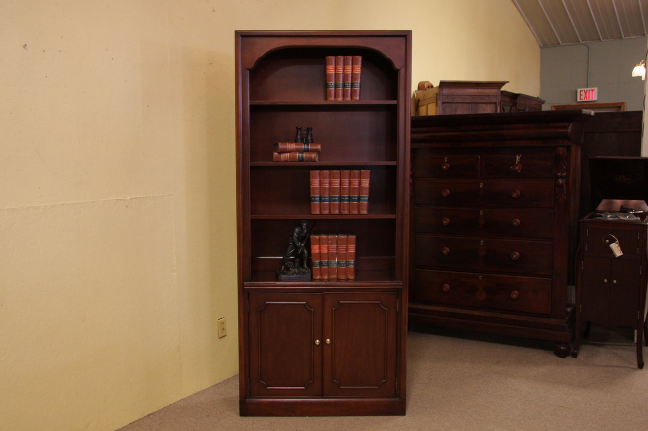 Signed by outstanding American maker, "Councill," this tall mahogany bookcase has adjustable shelves.