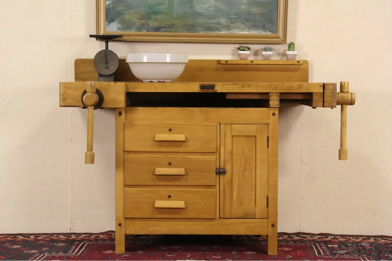Ridiculously rugged construction includes two working vise clamps with wooden screws for carpentry projects or cracking walnuts, signed "C. Christensen, Chicago." There are peg holes in the top and a recessed tool area with a back splash with tool or knife holder. Three drawers have dovetailed joints, the top lifts off for easier moving.
