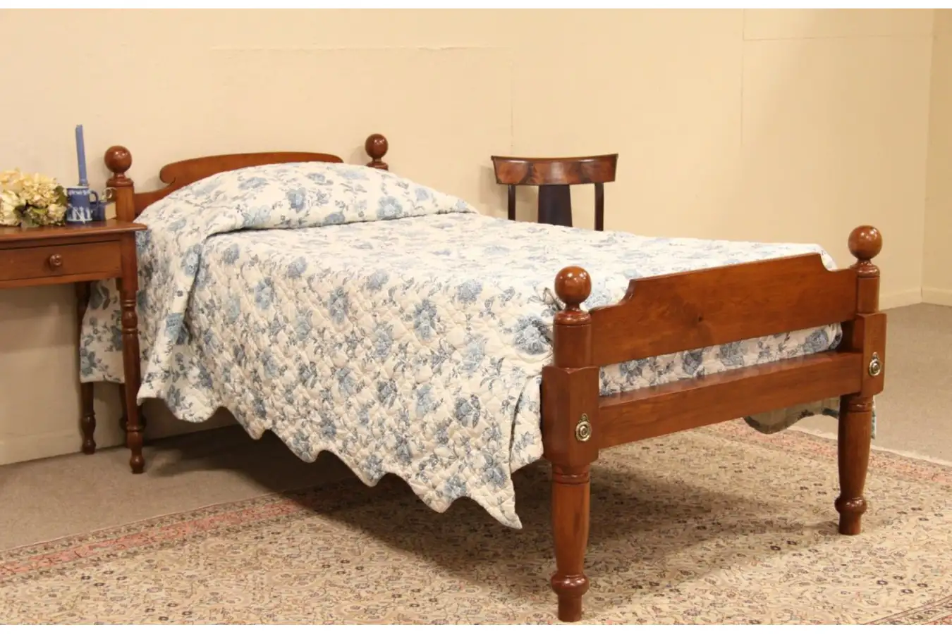 A charming country bed was hand crafted of pine, cherry and maple about 1840. The "cannonball" posts and shaped headboard are graceful.