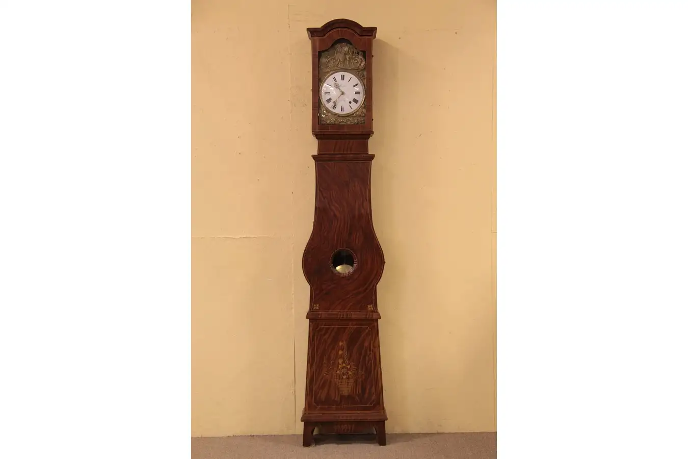 The hand made pine "pot belly" shape case still has the original hand grained and painted finish. Nolay is a small medieval city in the center of the Cote d'Or in Burgundy wine country, between the famous towns of Beaune and Autun in the south of France. This clock was made in the late 1800's, and measurements are 20" wide, 9" deep and 8'1" tall.