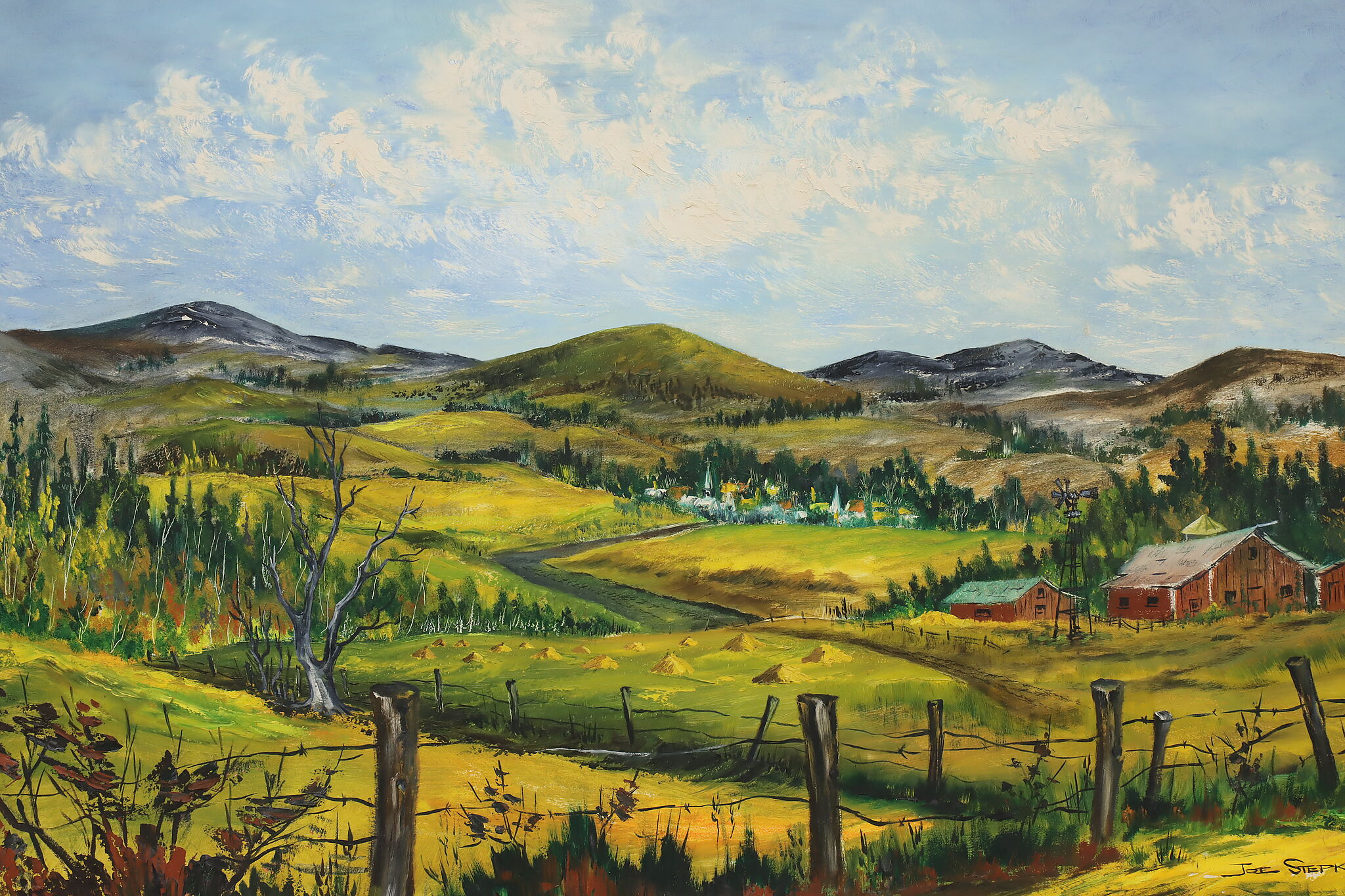 The rolling hills and bright blue sky come together to create this peaceful scene of countryside farmland.