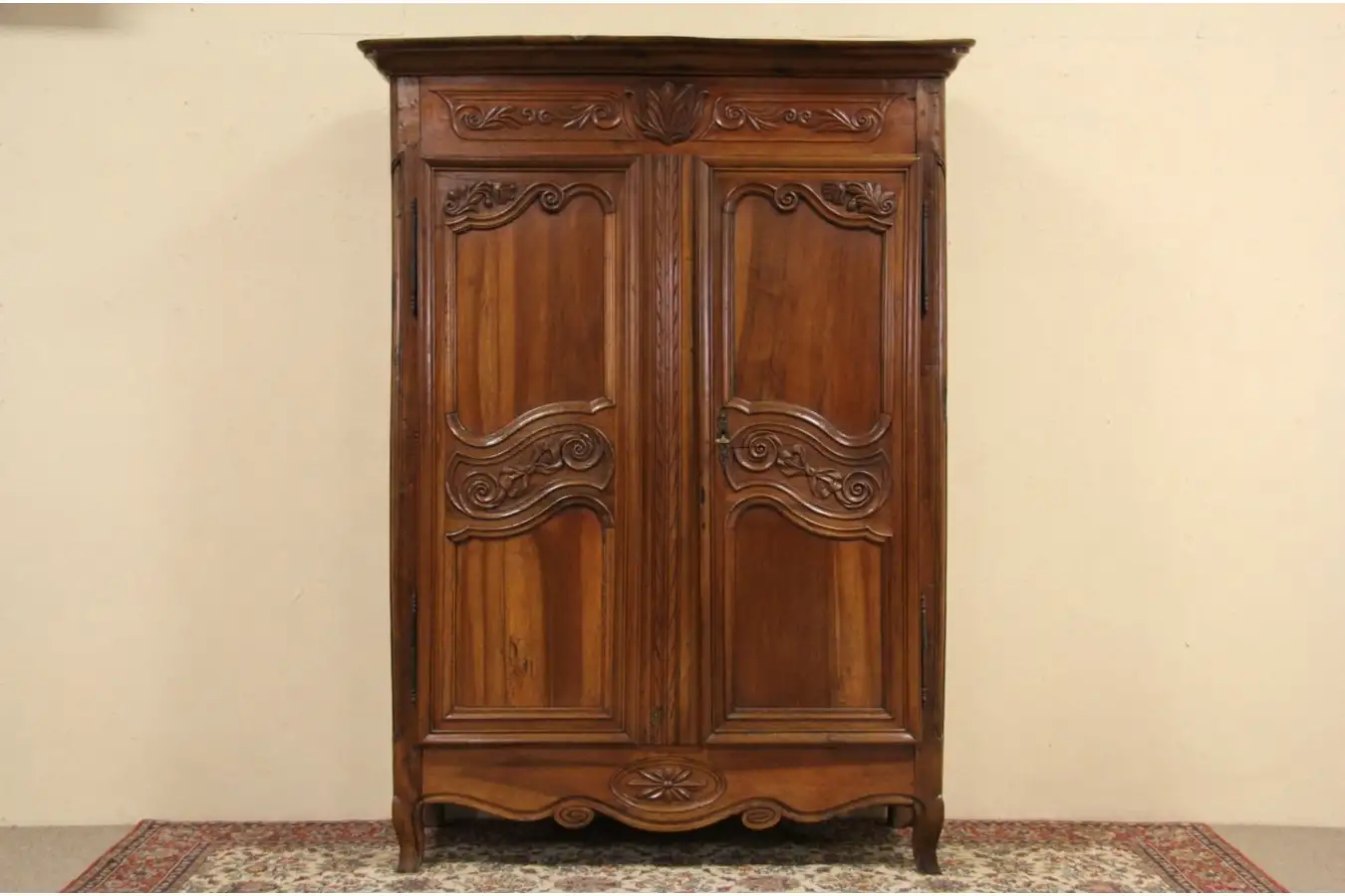 Authentic Country French or Provincial furniture from about 1780, this historic armoire is solid wormy walnut, delicately hand carved with traditional artistic motifs and graceful moldings. Every plank is hand hewn and planed, some are diagonally sawn. Feet have been restored, perhaps 100 years ago.