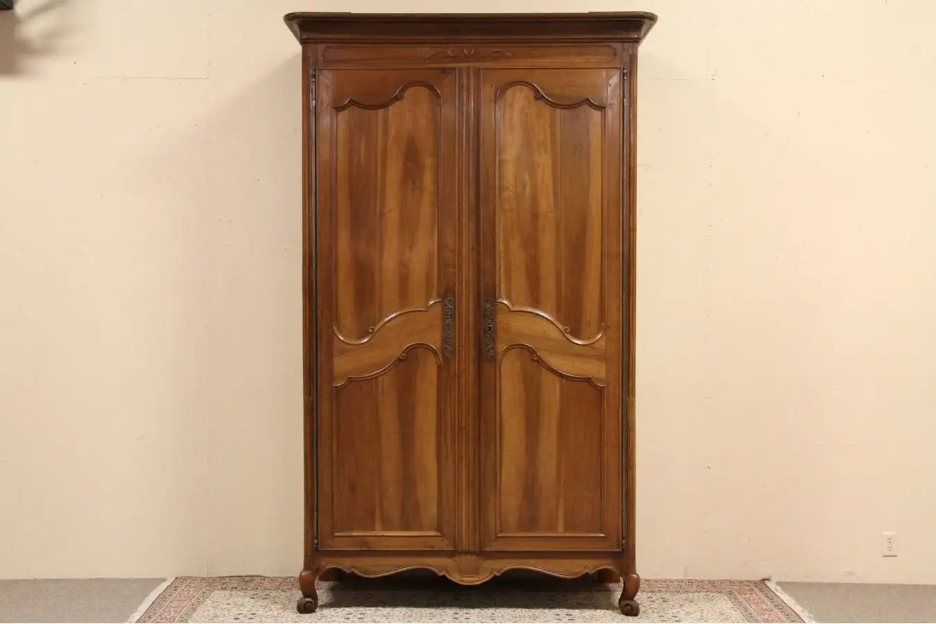 An authentic Country French or Provincial armoire was hand carved of solid fruitwood about 1790. The satiny finish is excellent with just enough antique patina for a little character - see photos for mars at the edges and shrinkage separation. The fruitwood has old wormholes - typical of European furniture from the 1700's