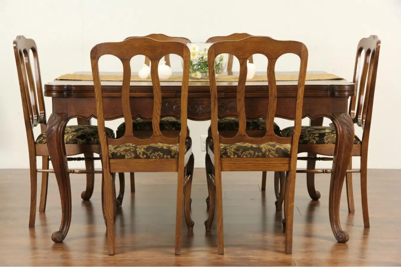 Hand carved of solid oak in the 1920's, this genuine Country French or Provincial dining set includes a table with two draw leaves and six chairs. The finish is in excellent condition on quarter sawn oak, the top surface is revarnished for durability. The rest of the finish is original, waxed and buffed so that all that is needed to maintain the warm luster is an occasional wipe with a soft dry cloth.